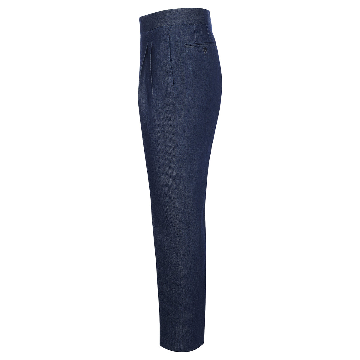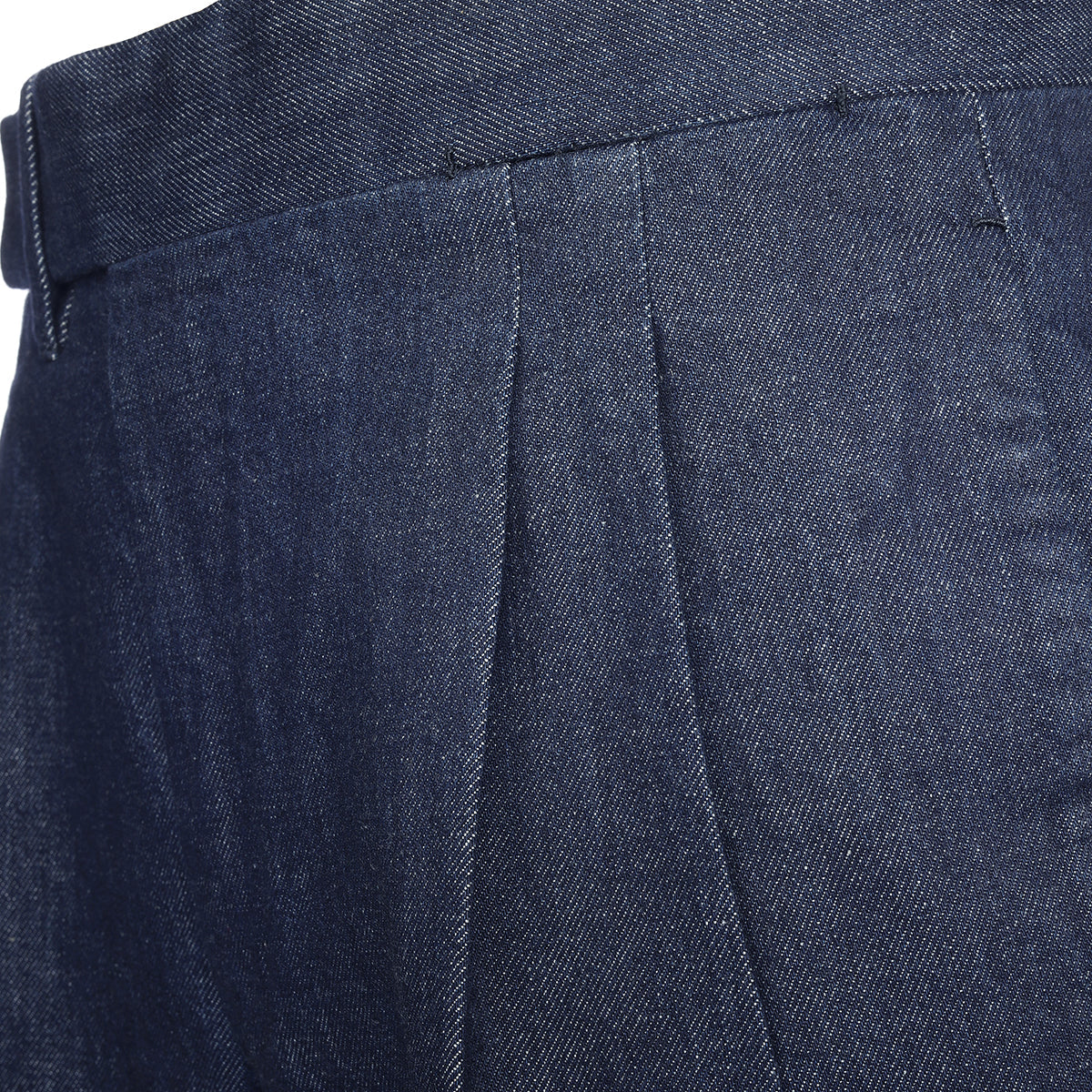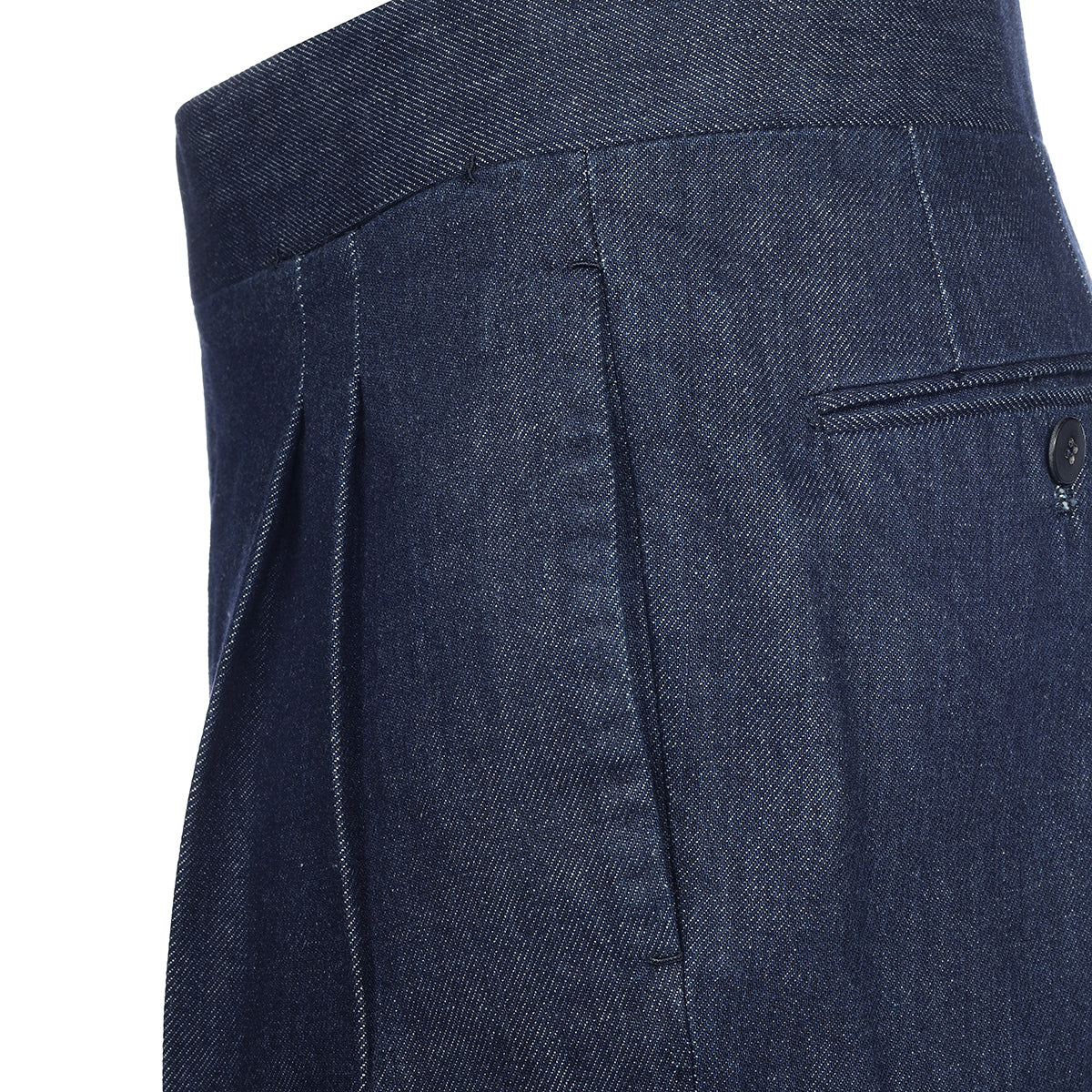 Jeans with two pleats in dark denim color. Seam pockets, buttons and waistband, extended strap without belt loops, one front pocket and one back pockets. Entirely cut and hand-sewn in Casalnuovo, by our master craftsmen. This garment is ideal to complete a casual look with attention to the smallest details and that can stand out for its class and refinement.