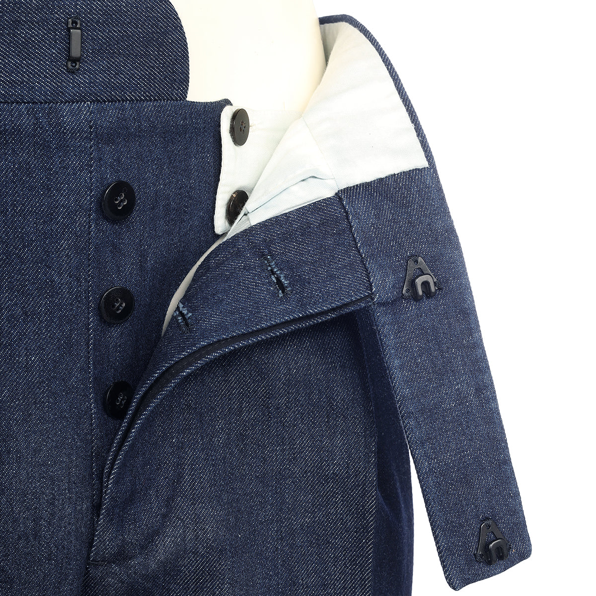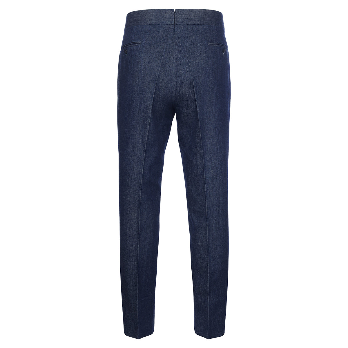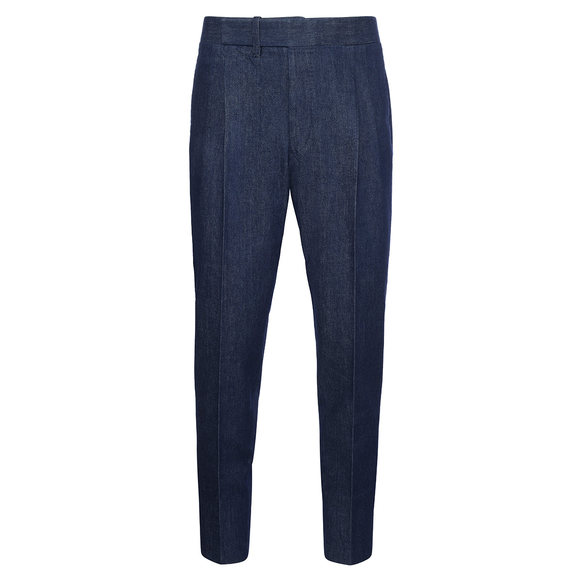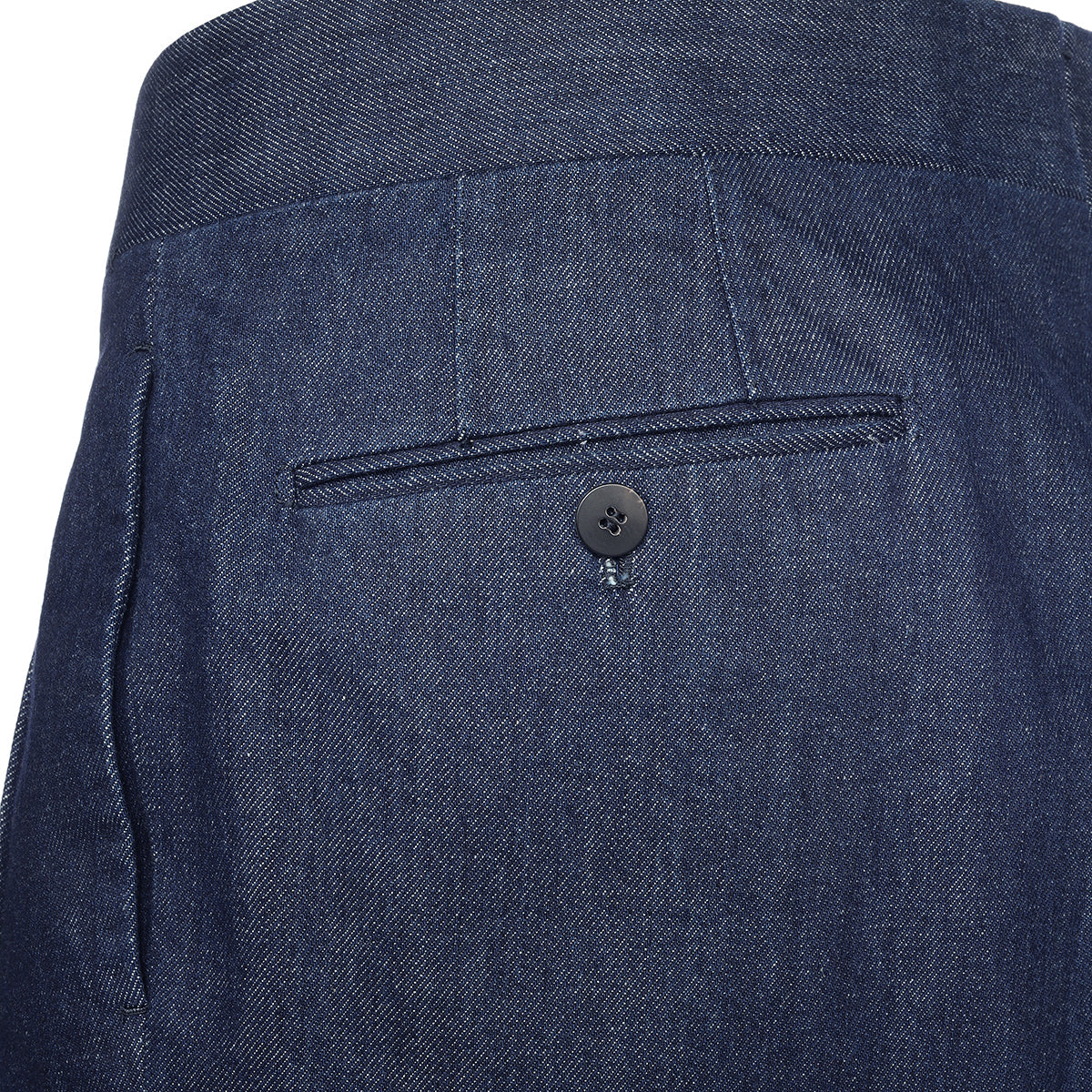 Jeans with two pleats in dark denim color. Seam pockets, buttons and waistband, extended strap without belt loops, one front pocket and one back pockets. Entirely cut and hand-sewn in Casalnuovo, by our master craftsmen. This garment is ideal to complete a casual look with attention to the smallest details and that can stand out for its class and refinement.