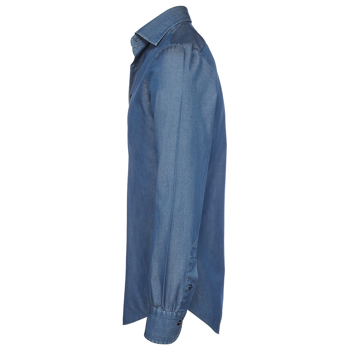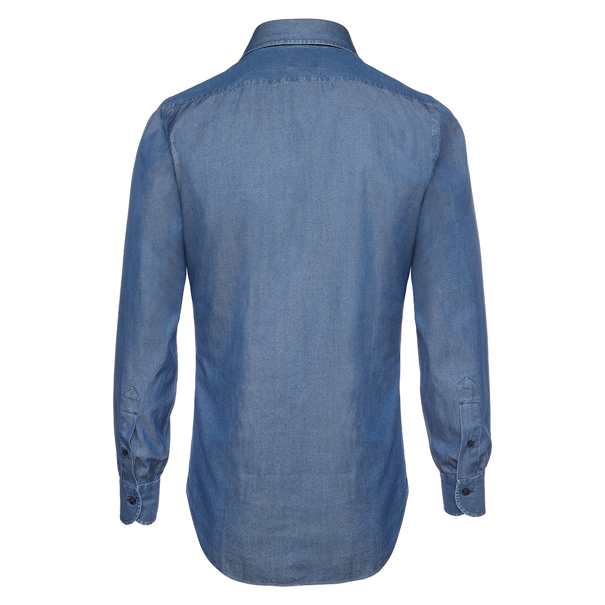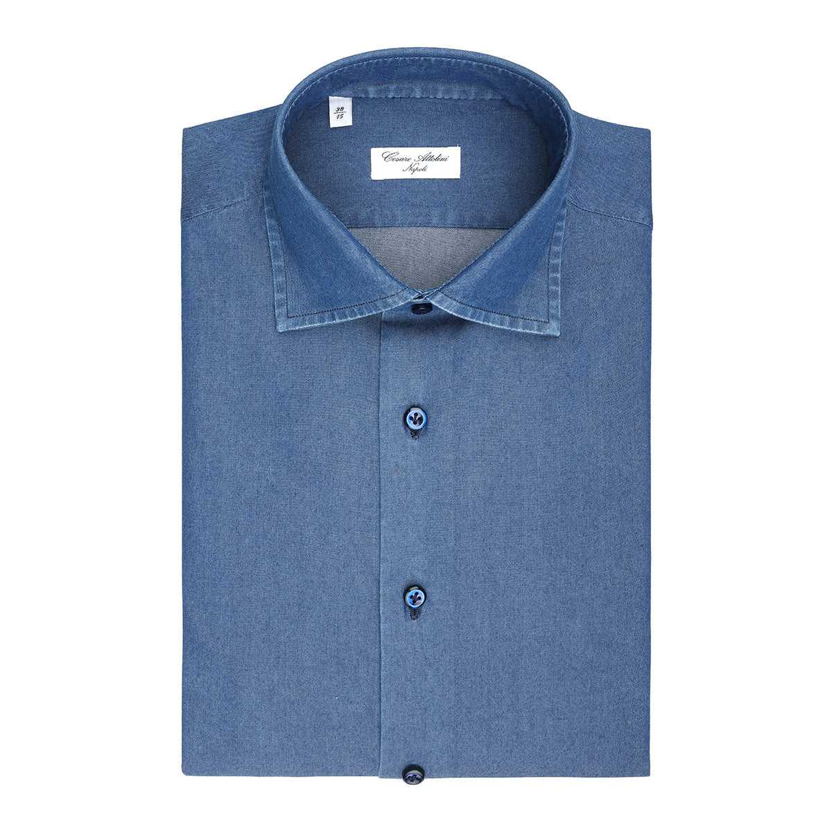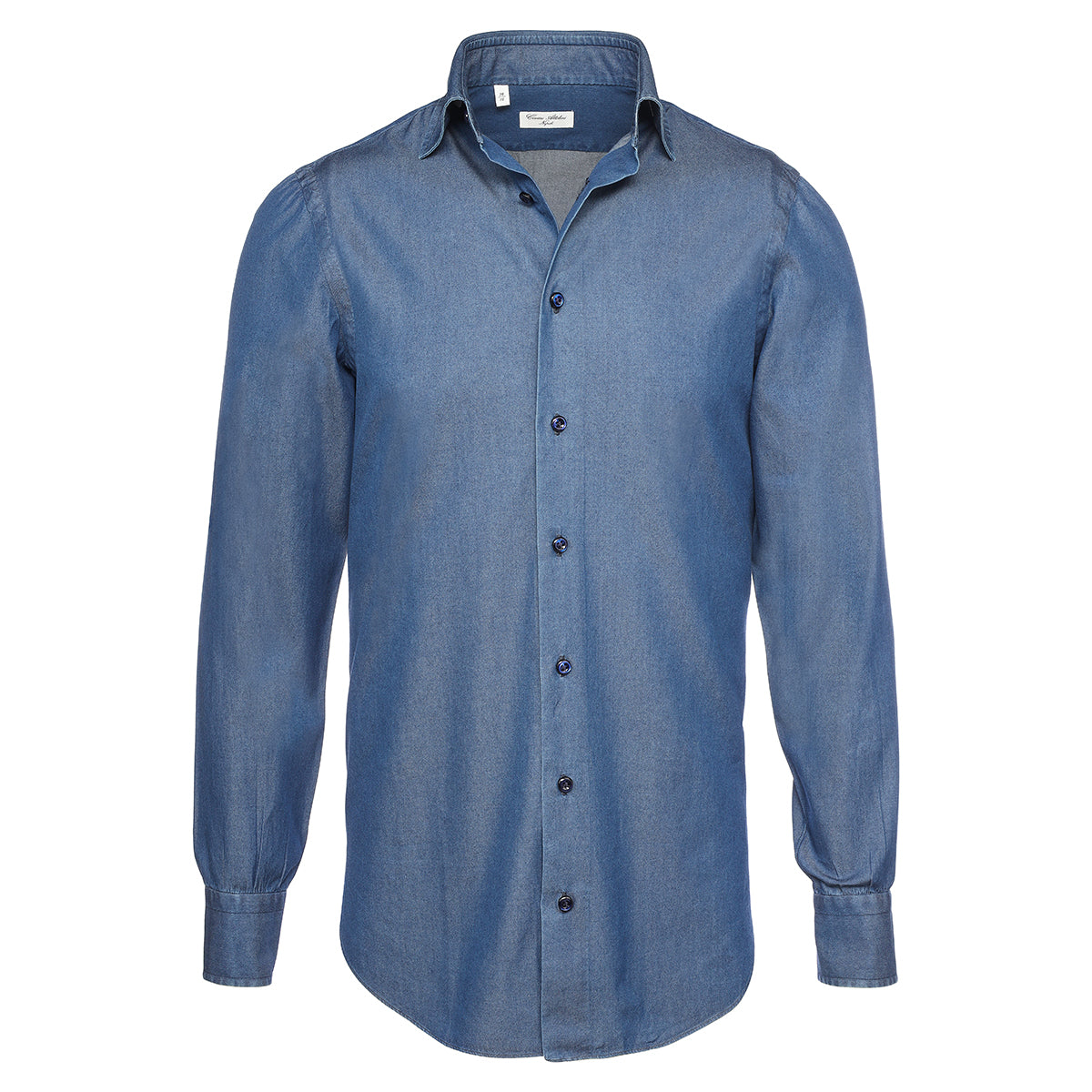 Dark denim color shirt. Entirely cut and sewn by hand by the skilled hands of our shirt-makers in our workshop. The ideal shirt to create a leisure look while ensuring comfort.