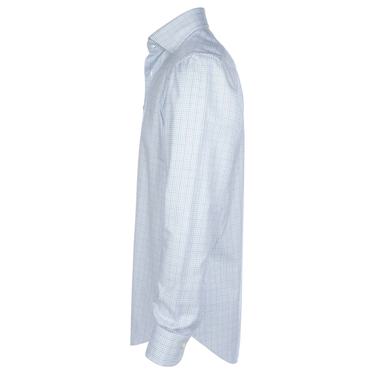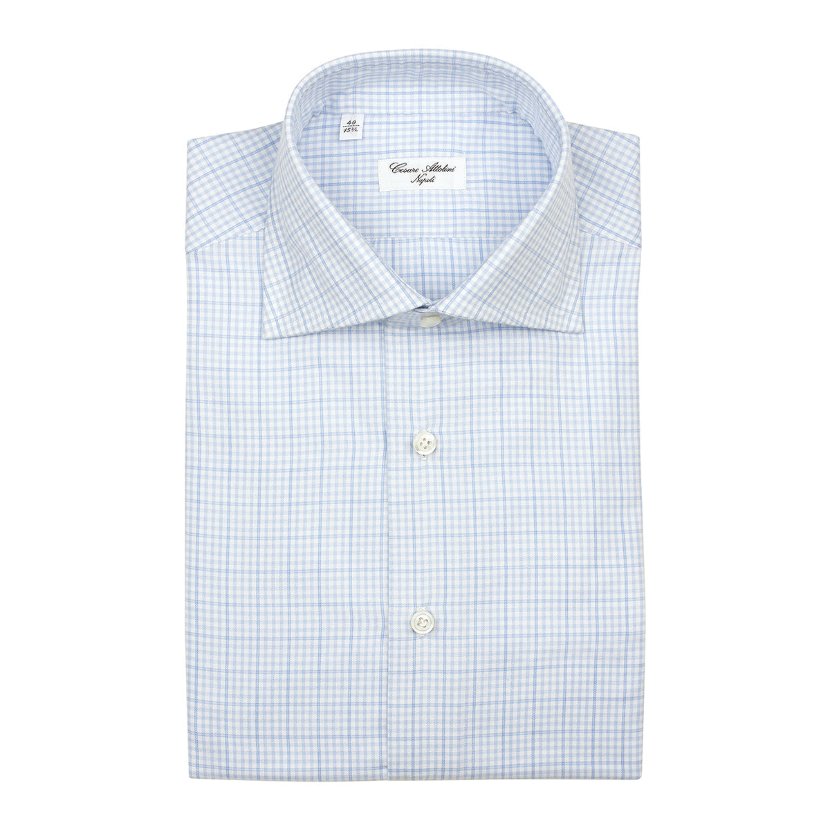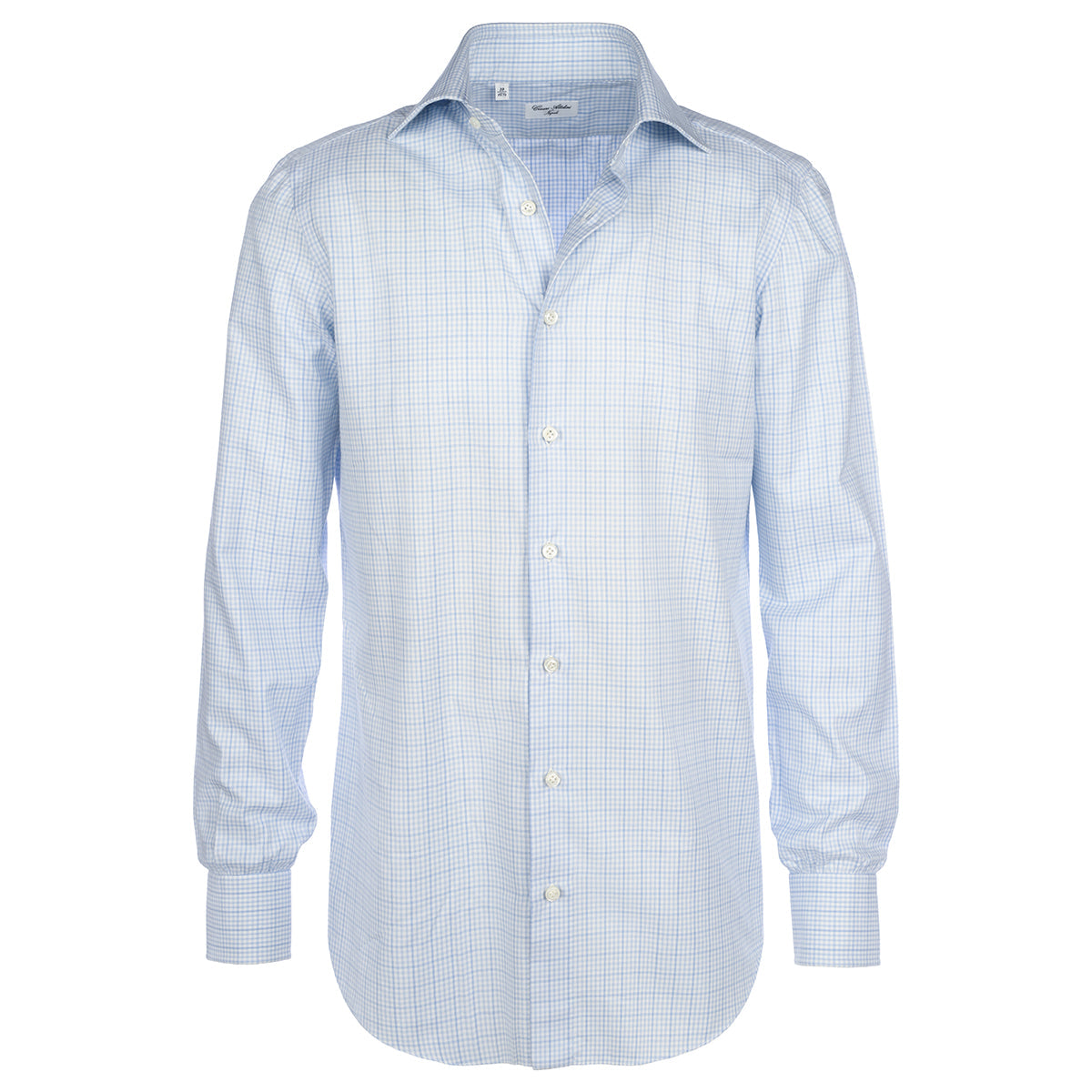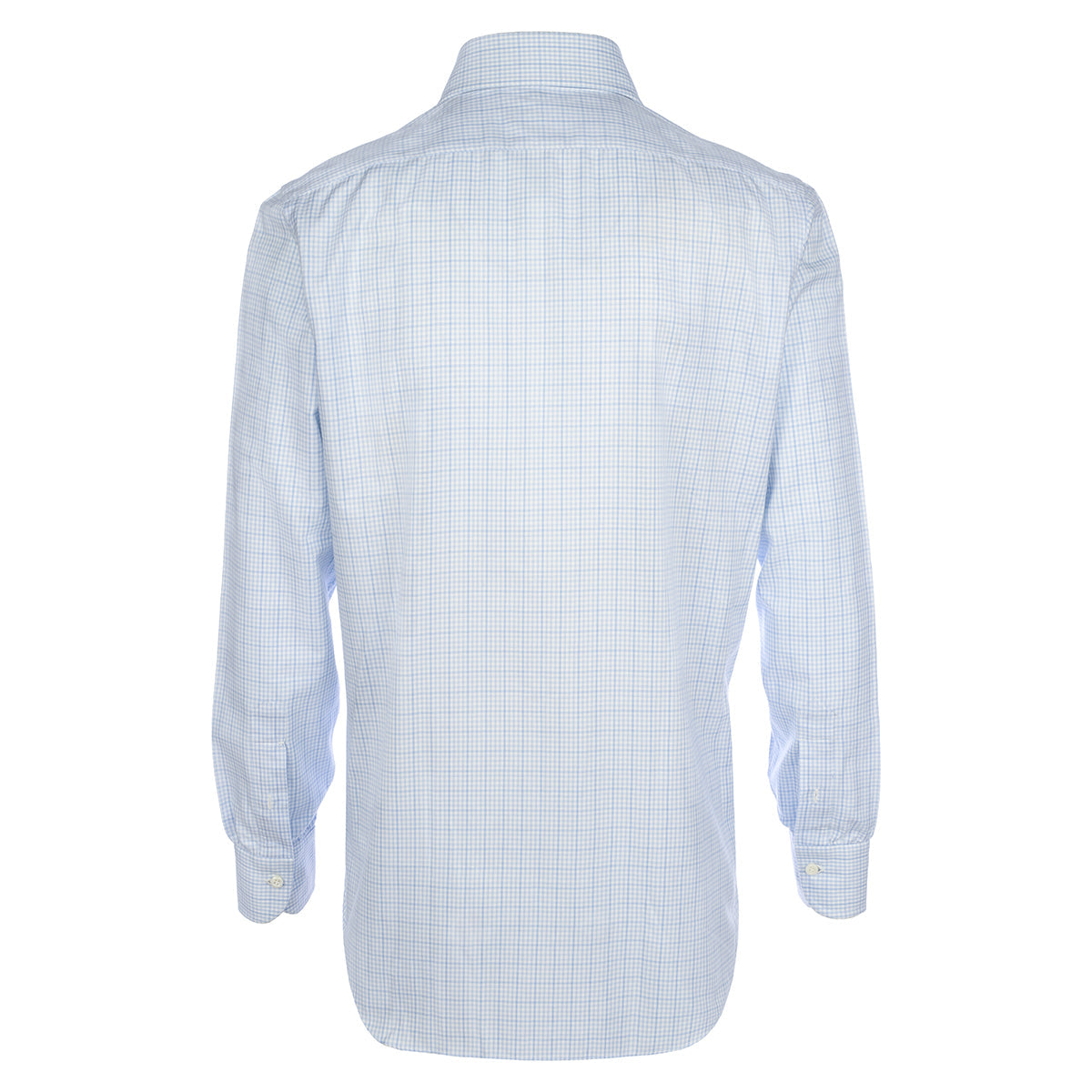 White cotton shirt with light blue framework. Entirely cut and sewn by hand by the skilled hands of our shirt-makers in our workshop. It is a versatile shirt, ideal for creating a leisure look and ensuring comfort without compromising elegance.