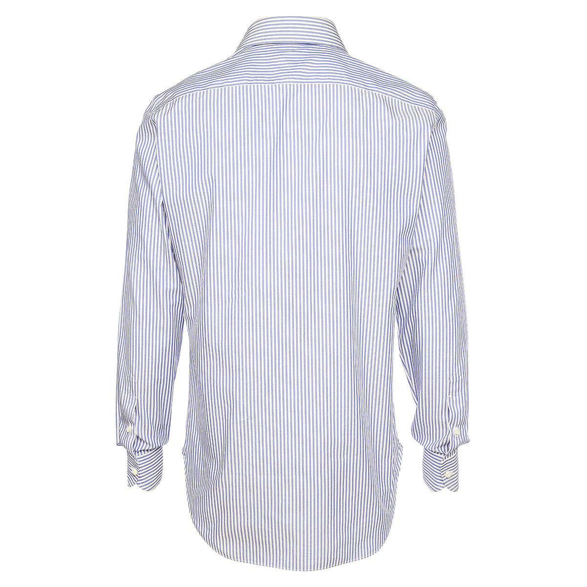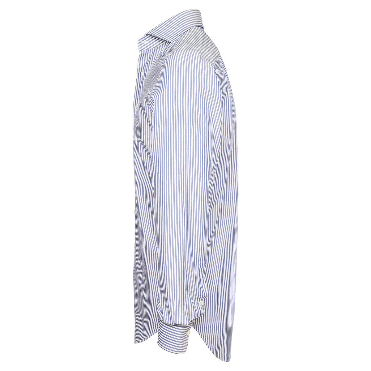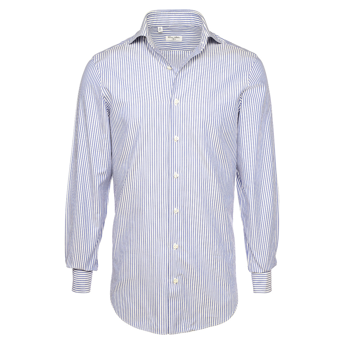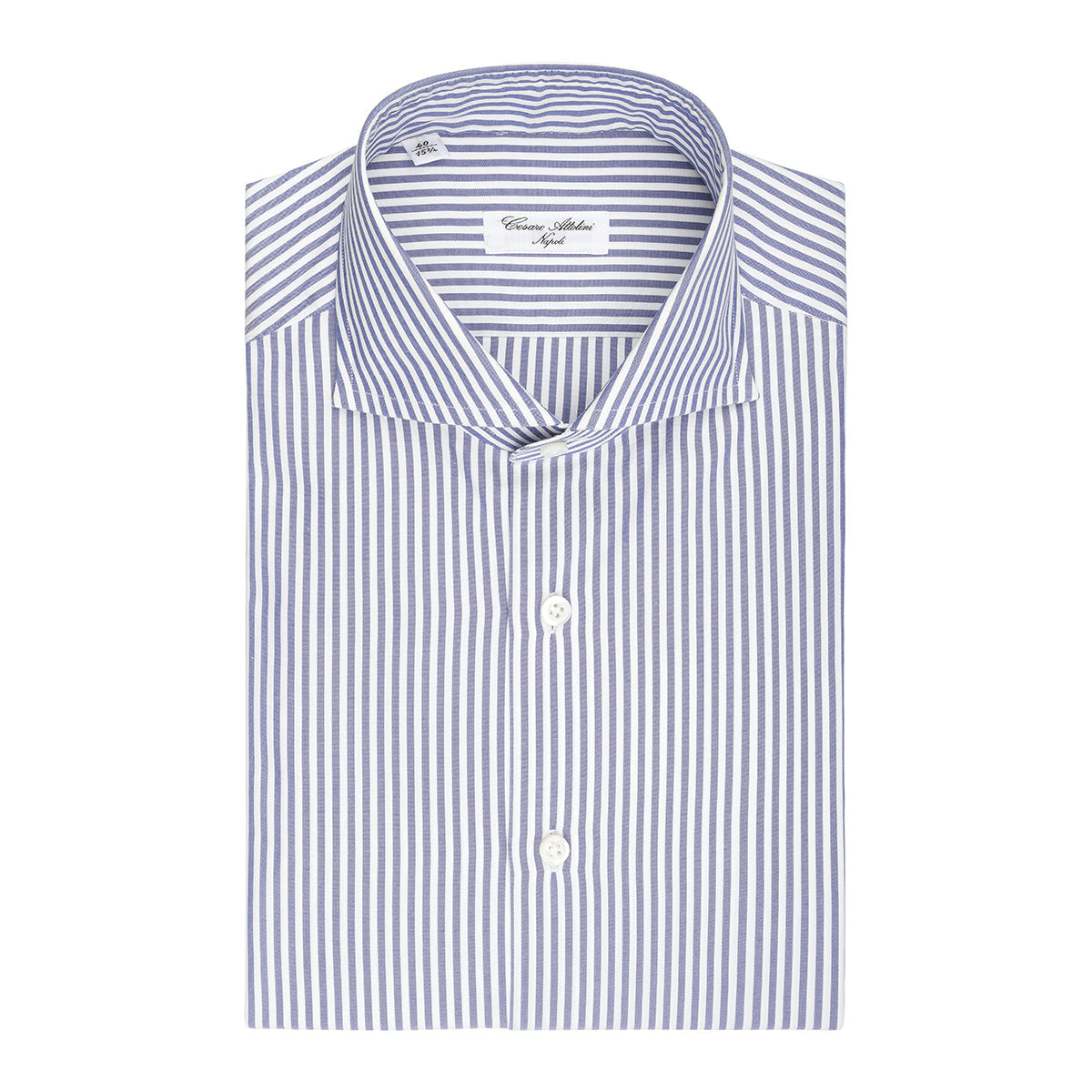 White and blue cotton shirt with alternating striped pattern. Entirely hand-cut and sewn by the skilled hands of our shirt-makers in our workshop. A versatile shirt, perfect to complete a formal and leisure look.