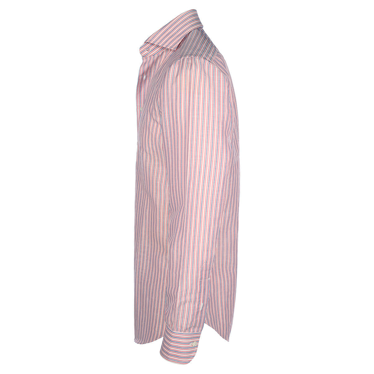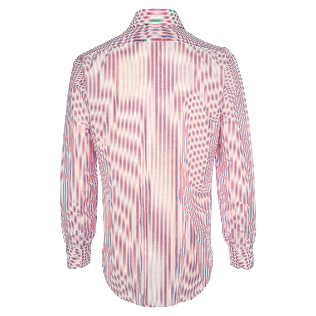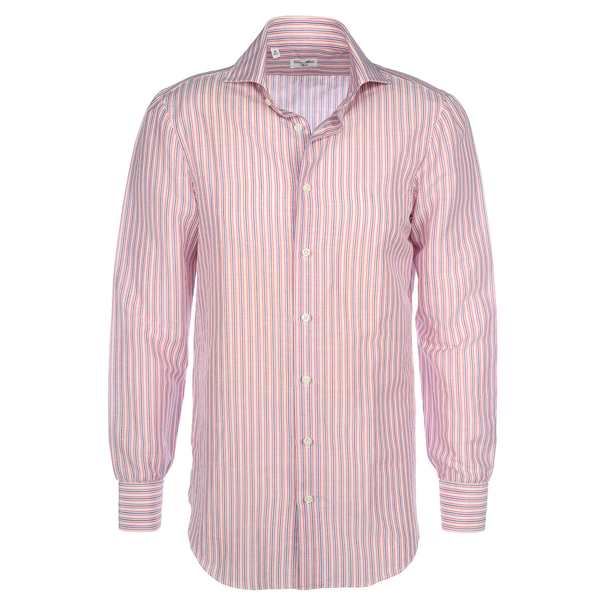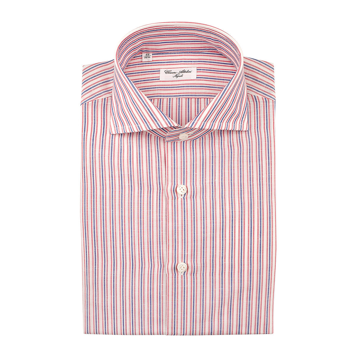 White, red and blue cotton and linen shirt with alternating striped pattern. Entirely cut and sewn by hand by the skilled hands of our shirt-makers in our workshop. A versatile shirt, ideal for creating a look for both business and leisure, ensuring comfort without compromising elegance.