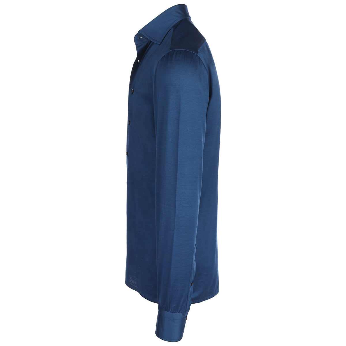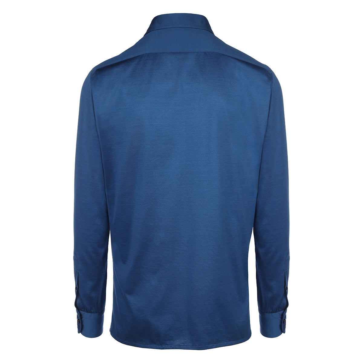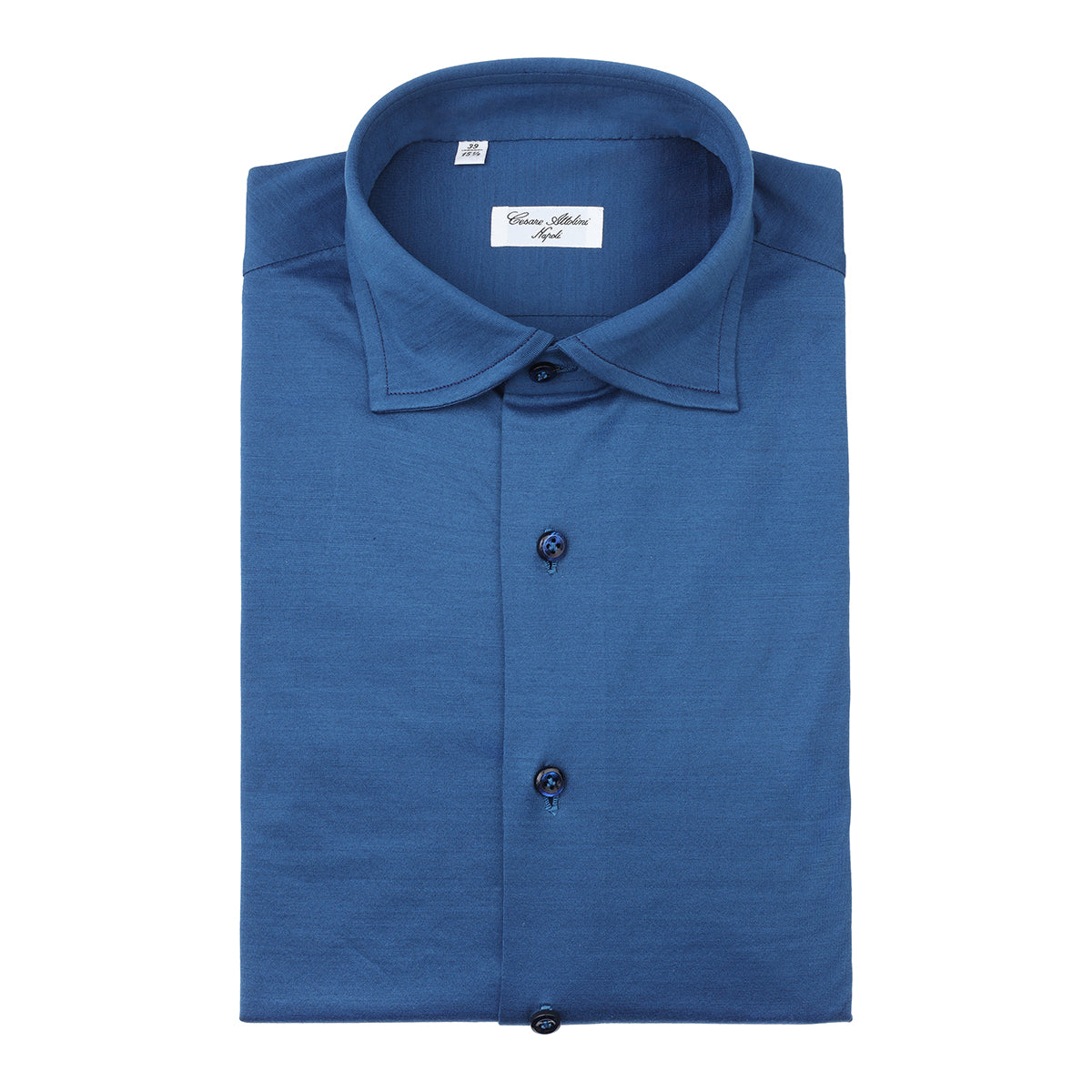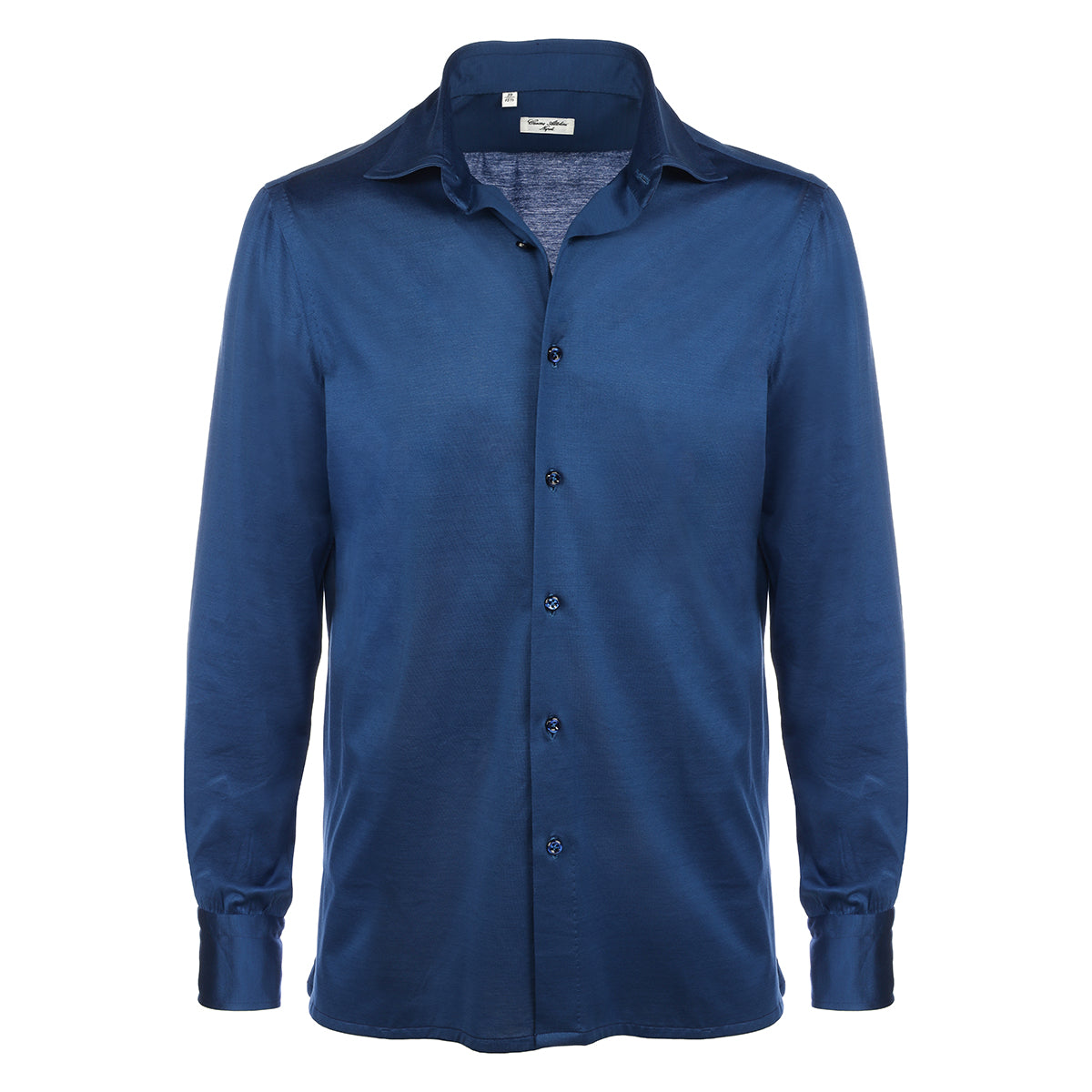 Blue jersey cotton shirt. Entirely cut and sewn by hand by the skilled hands of our shirt-makers in our workshop. An ideal shirt to create a leisure look and ensuring comfort without compromising elegance.