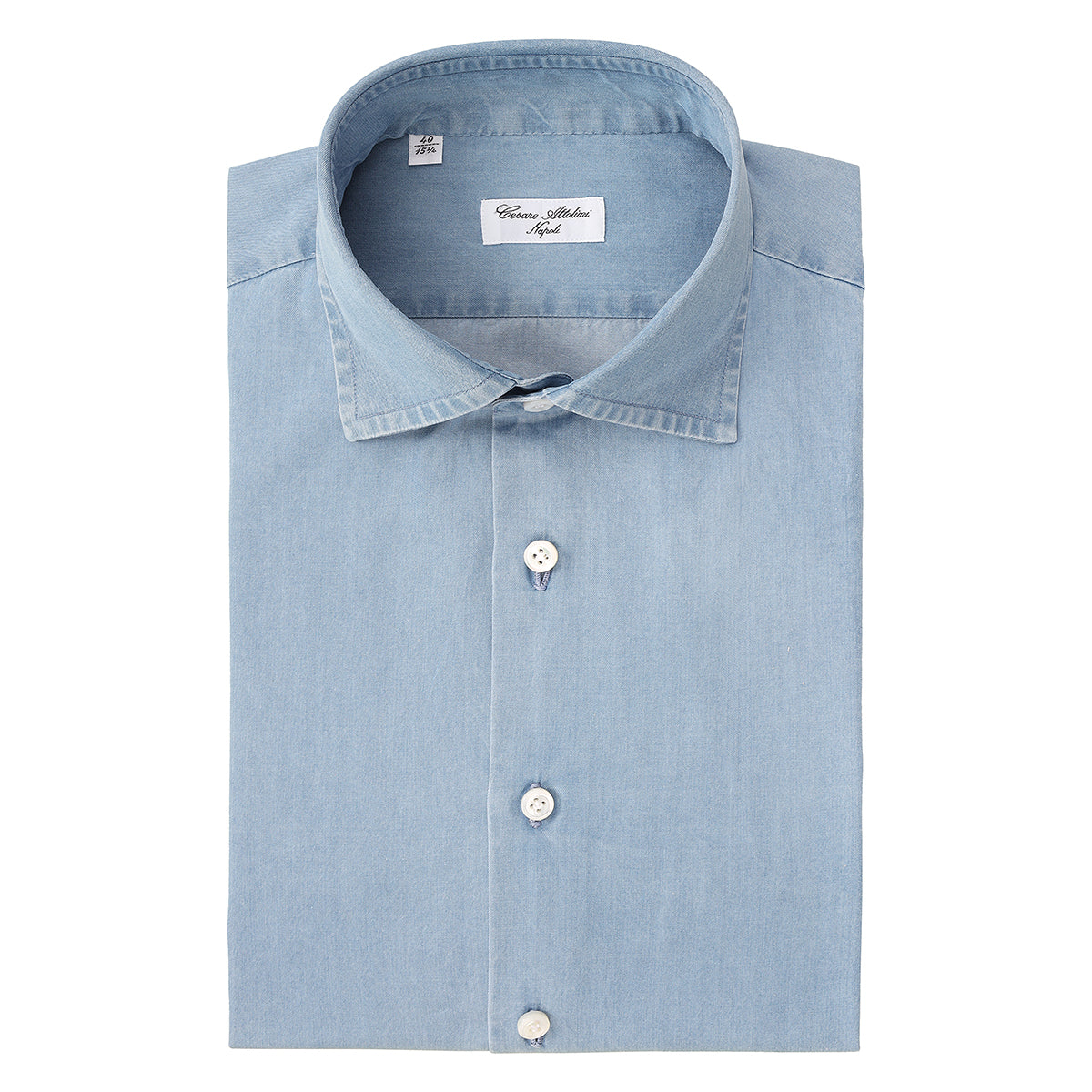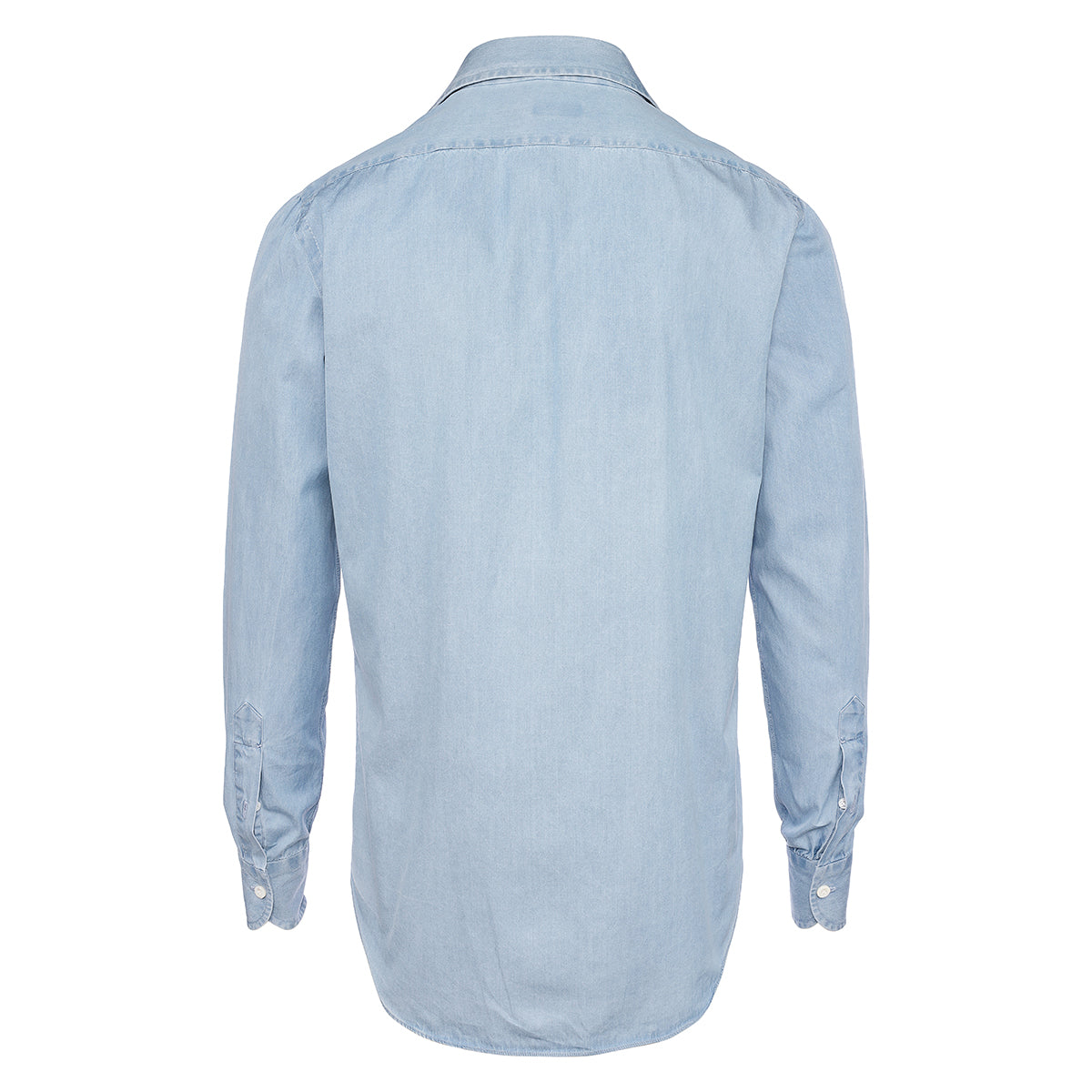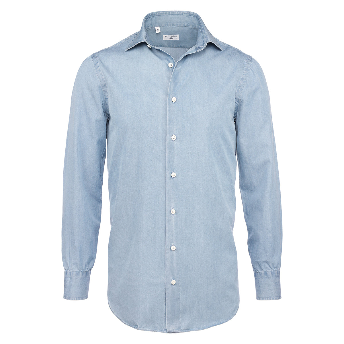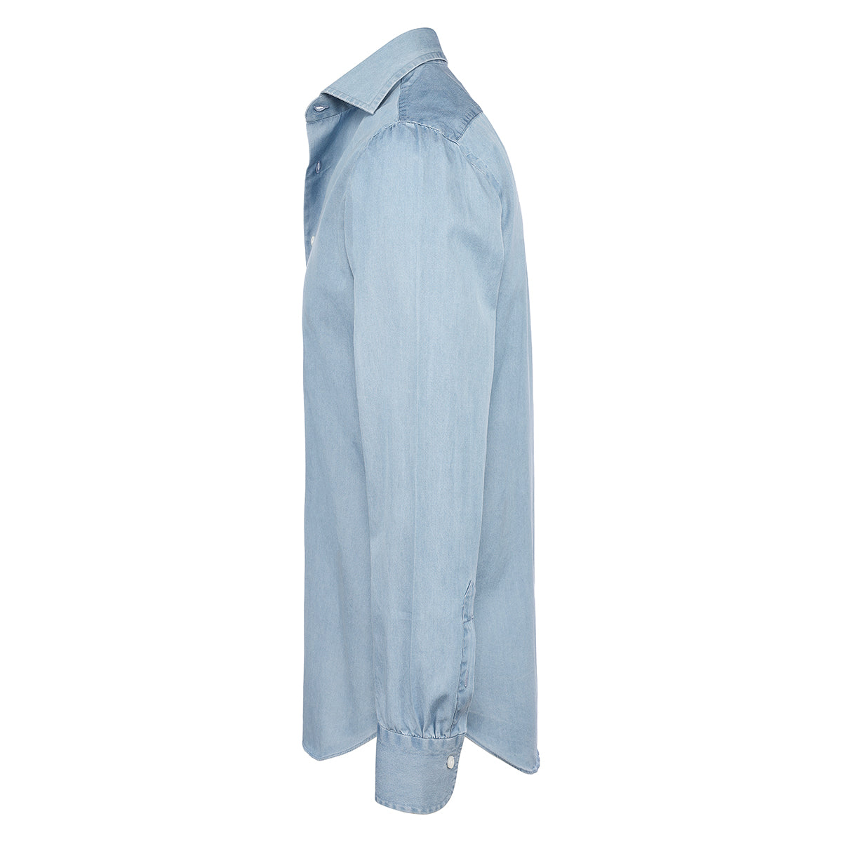 Shirt in light denim treated with a special enzymatic wash to give a vintage and sporty look, entirely cut and sewn by hand in our laboratory by the skilled hands of our master shirt makers. It is a versatile shirt, ideal for creating a leisure look, ensuring comfort and practicality without compromising on elegance.