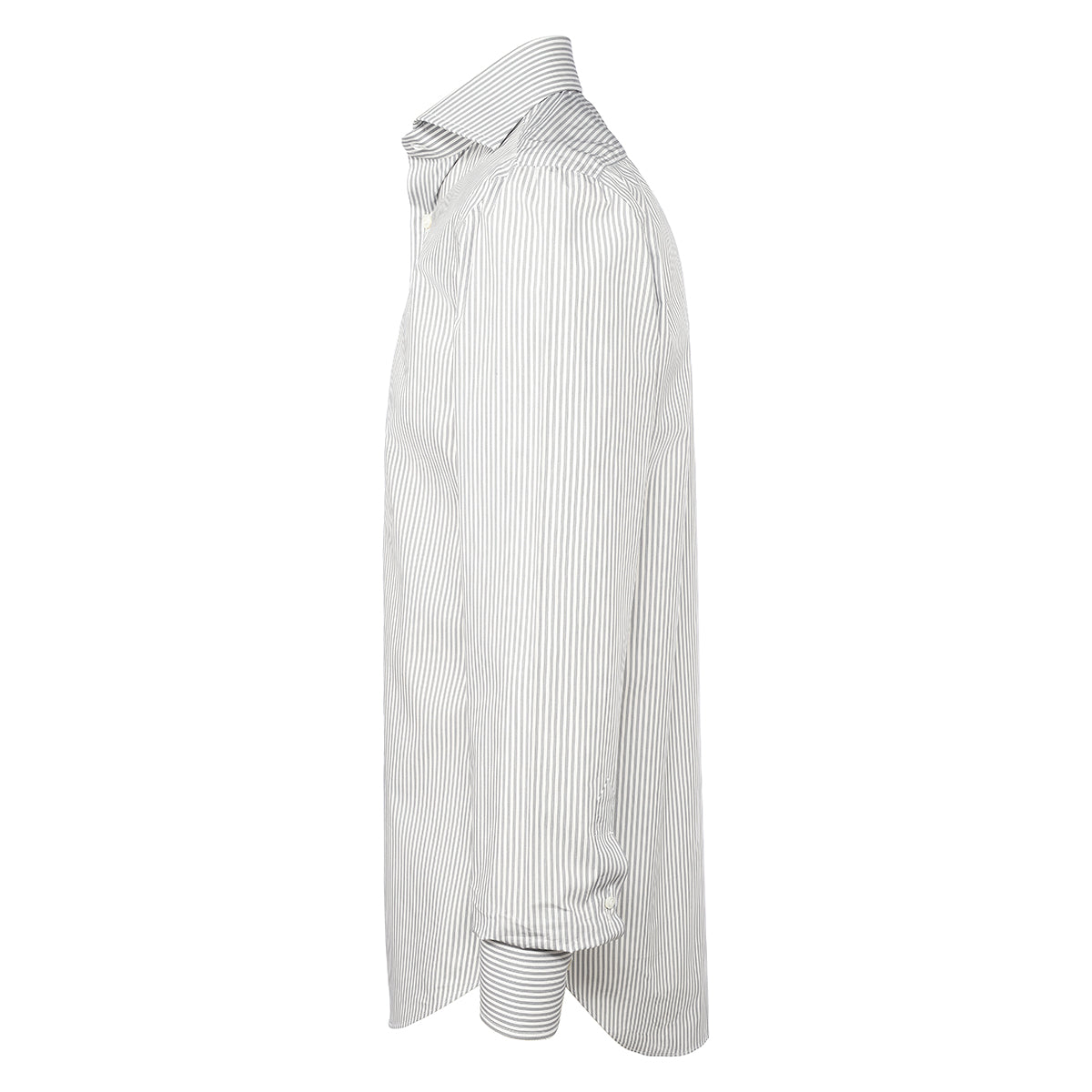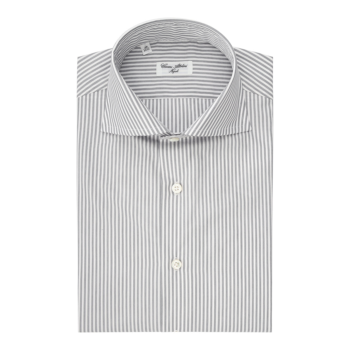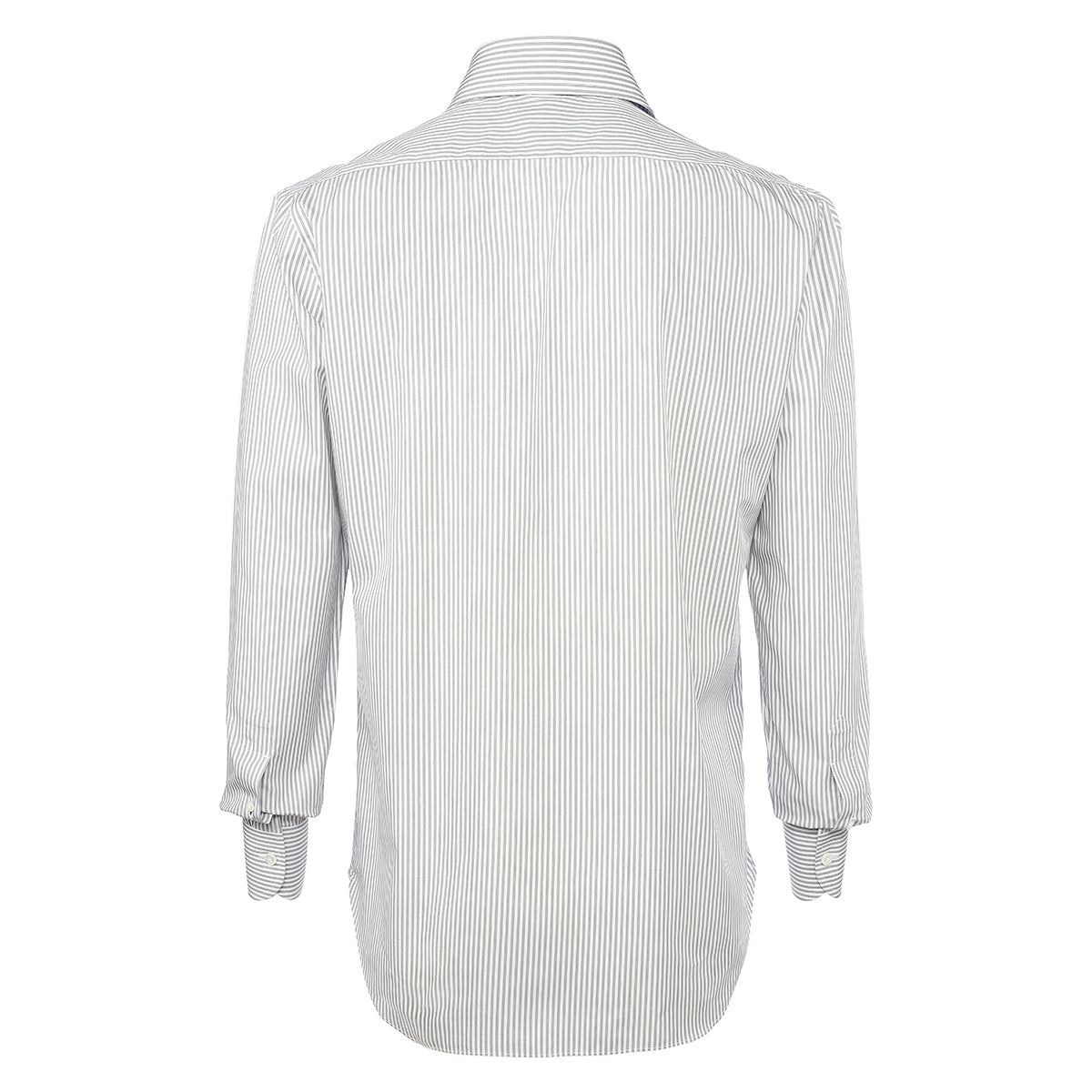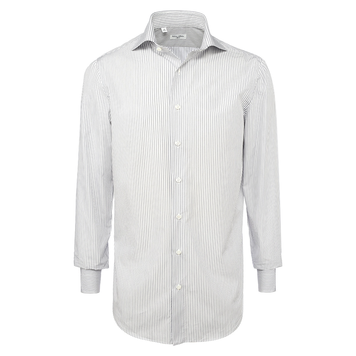 White and gray cotton shirt with alternating striped pattern entirely hand-cut and sewn in our workshop by the skilled hands of our shirt-makers. It is a versatile shirt ideal for creating a look for both business and leisure, ensuring comfort and practicality without compromising on elegance.