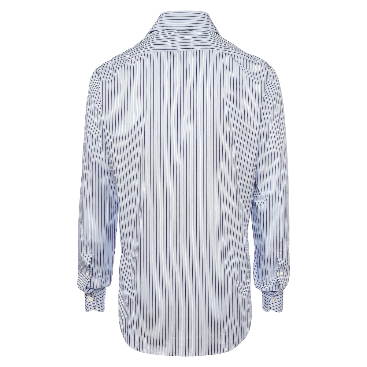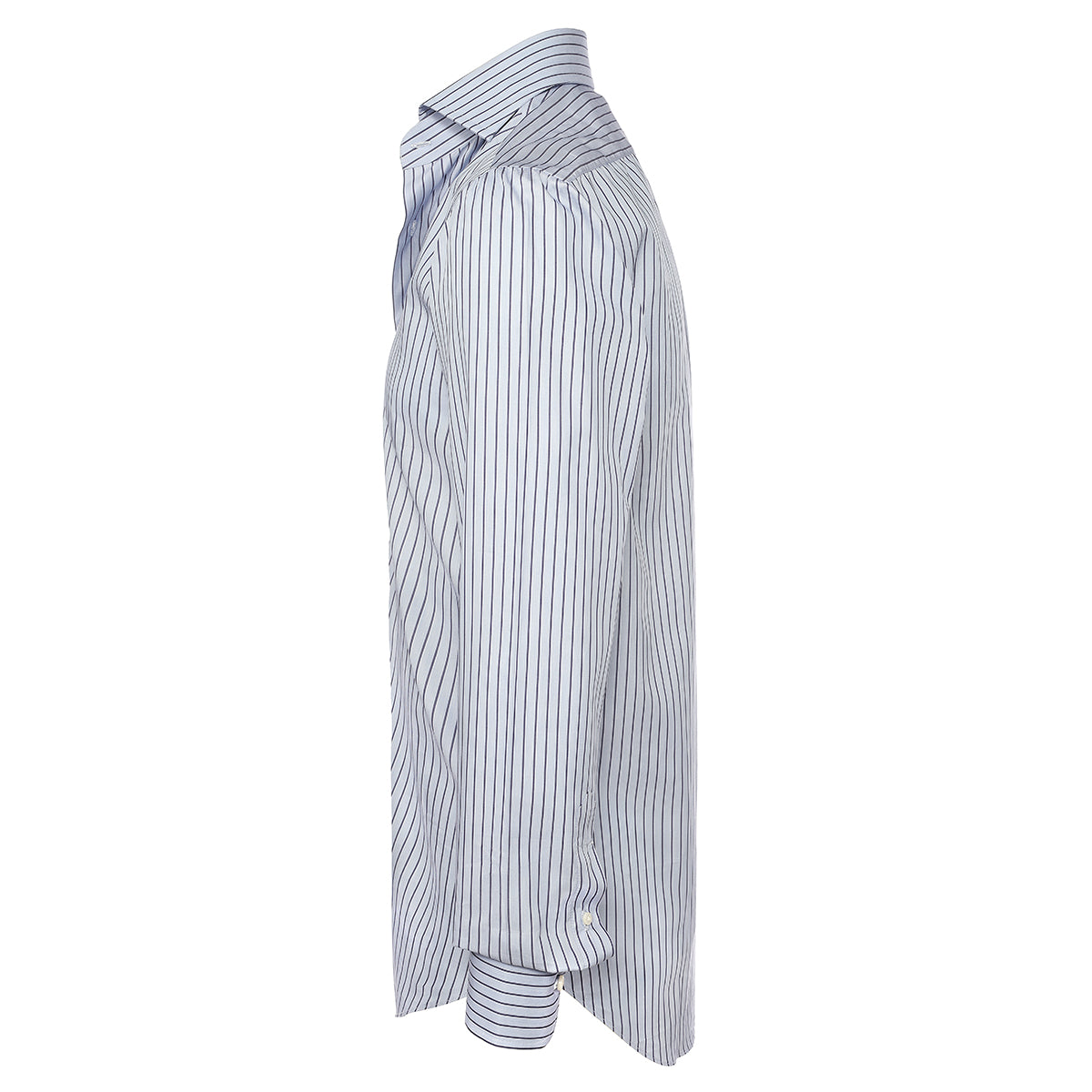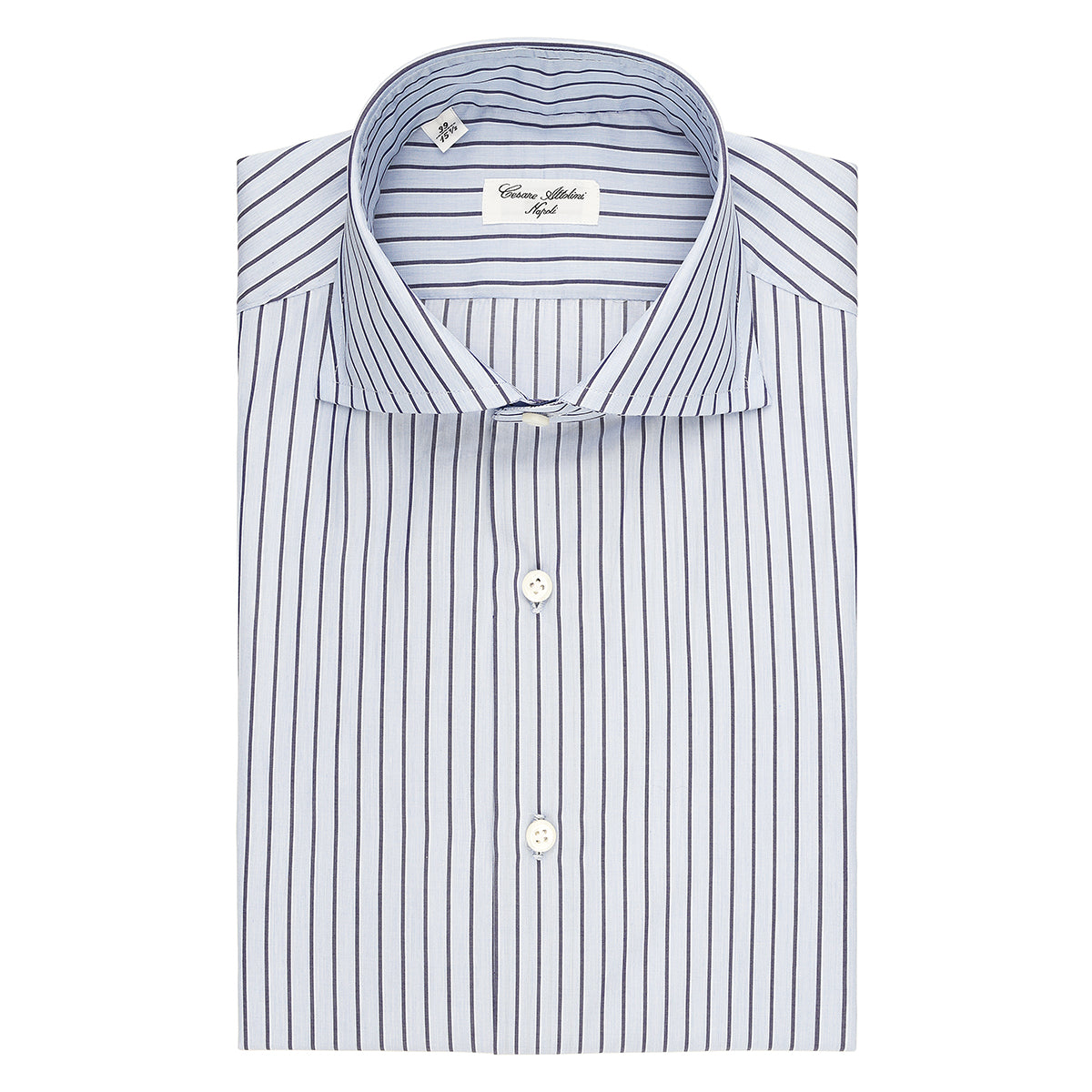 Sky blue and blue cotton shirt with alternating striped pattern entirely hand-cut and sewn in our workshop by the skilled hands of our shirt-makers. It is a versatile shirt ideal for both business and formal occasions.