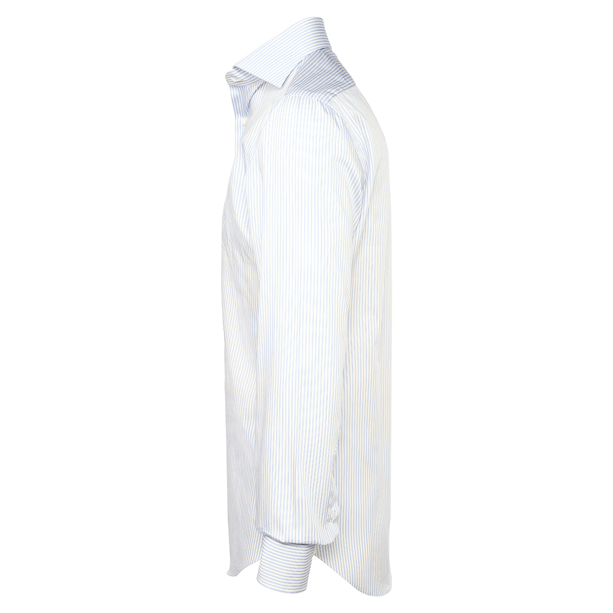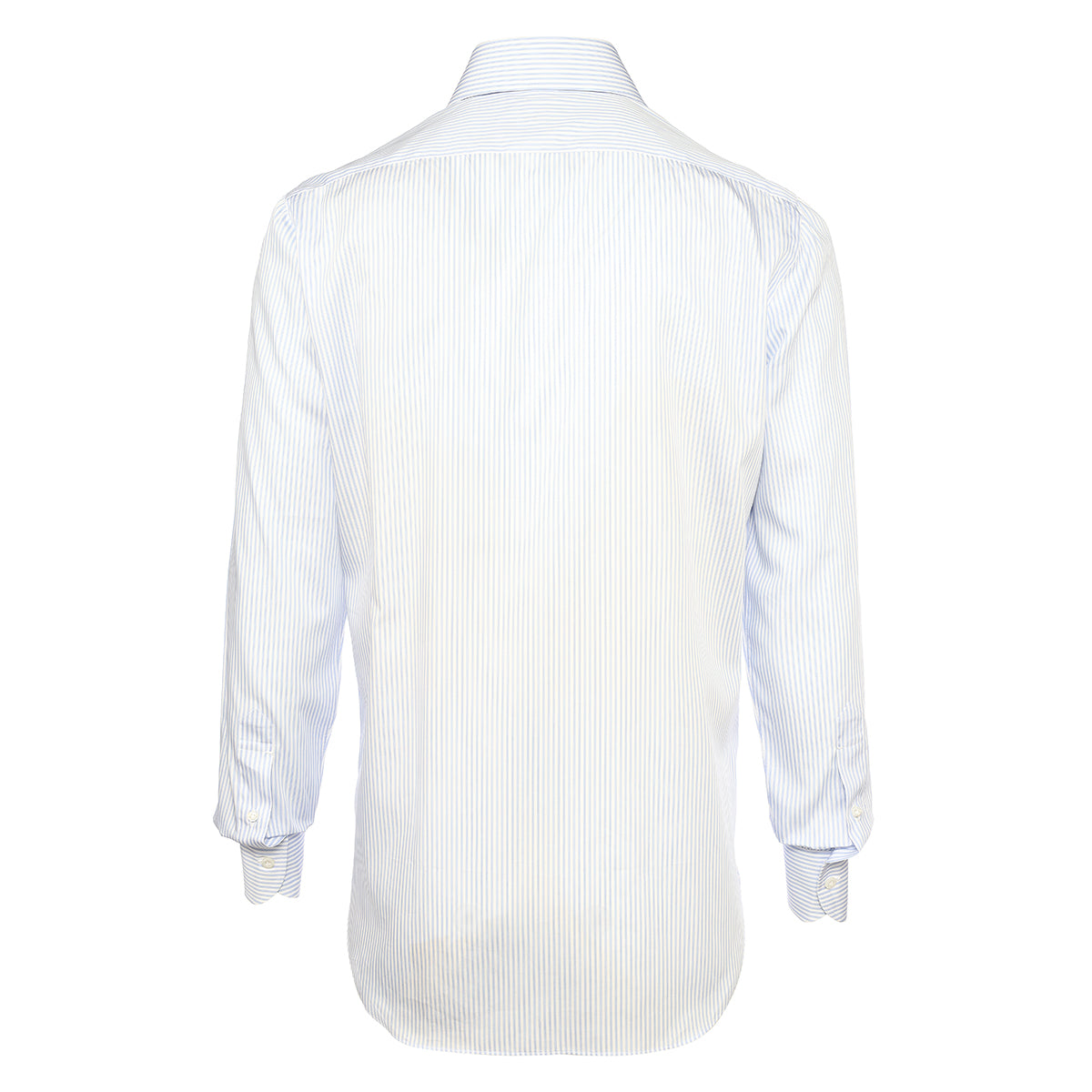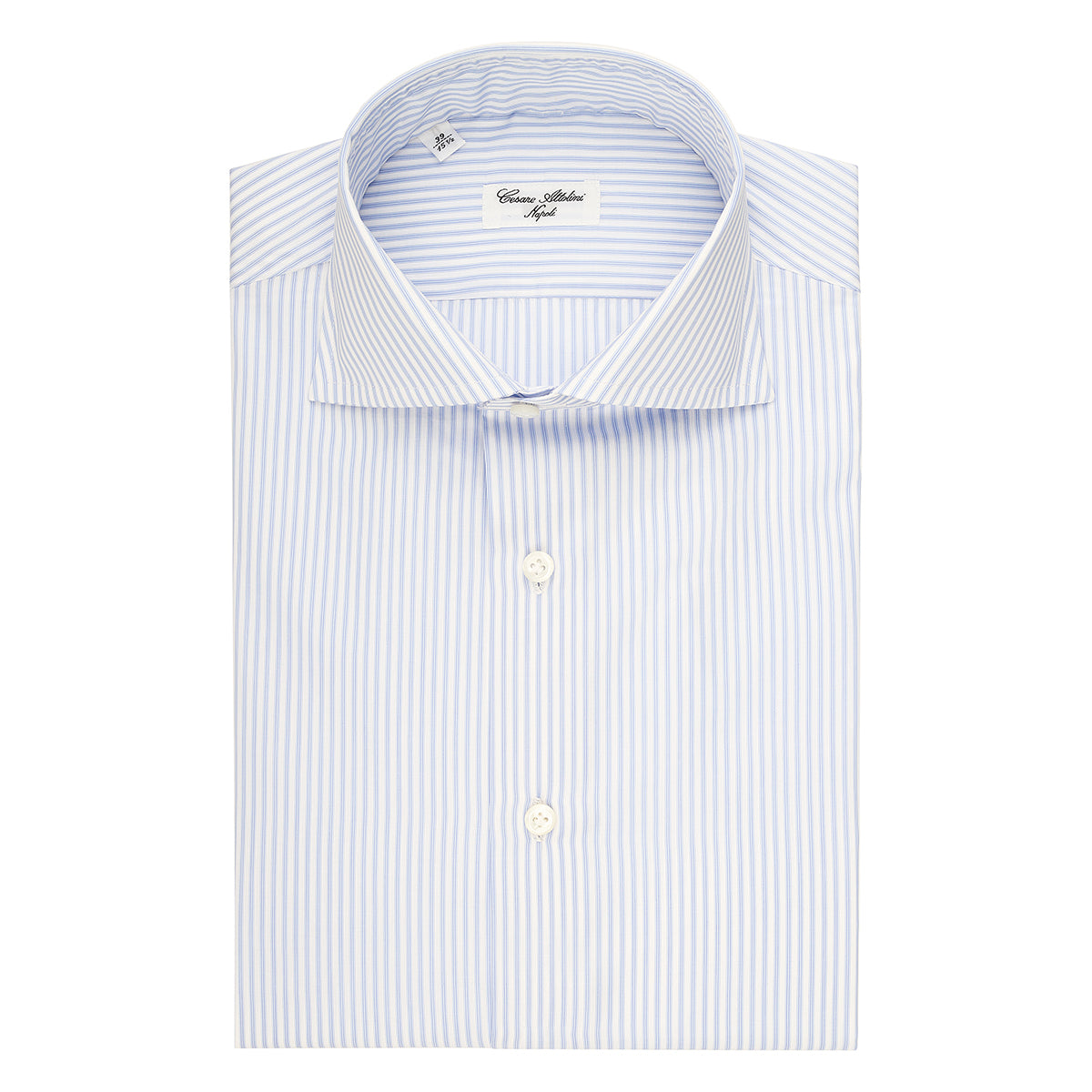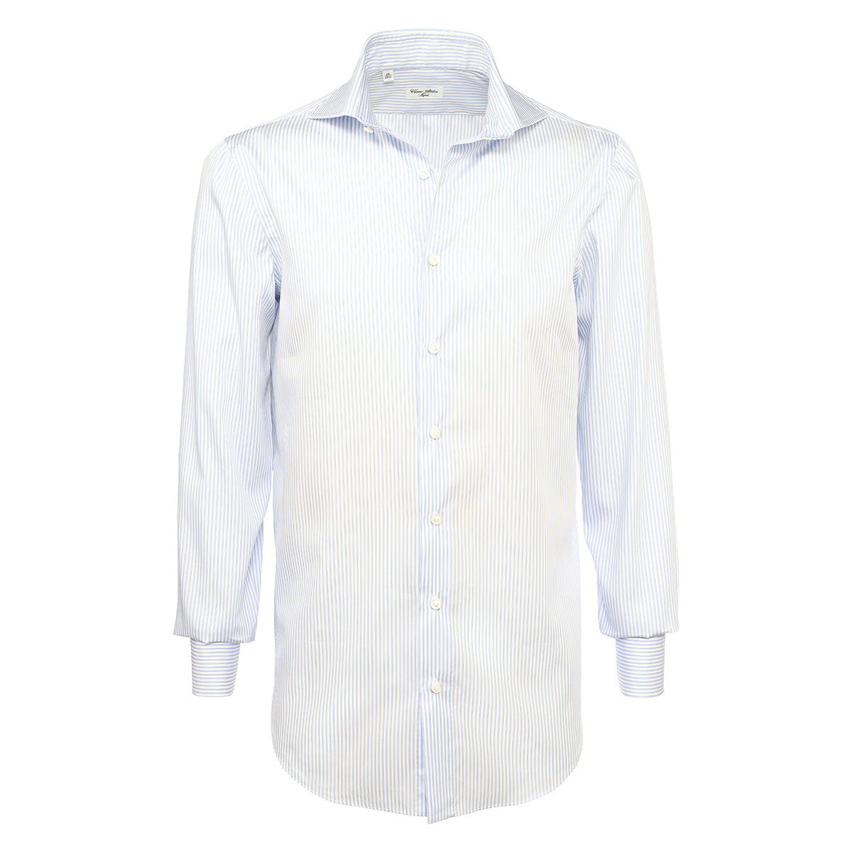 White and light blue cotton shirt with alternating striped pattern entirely hand-cut and sewn in our workshop by the skilled hands of our shirt-makers. It is a versatile shirt ideal for both business and formal occasions.