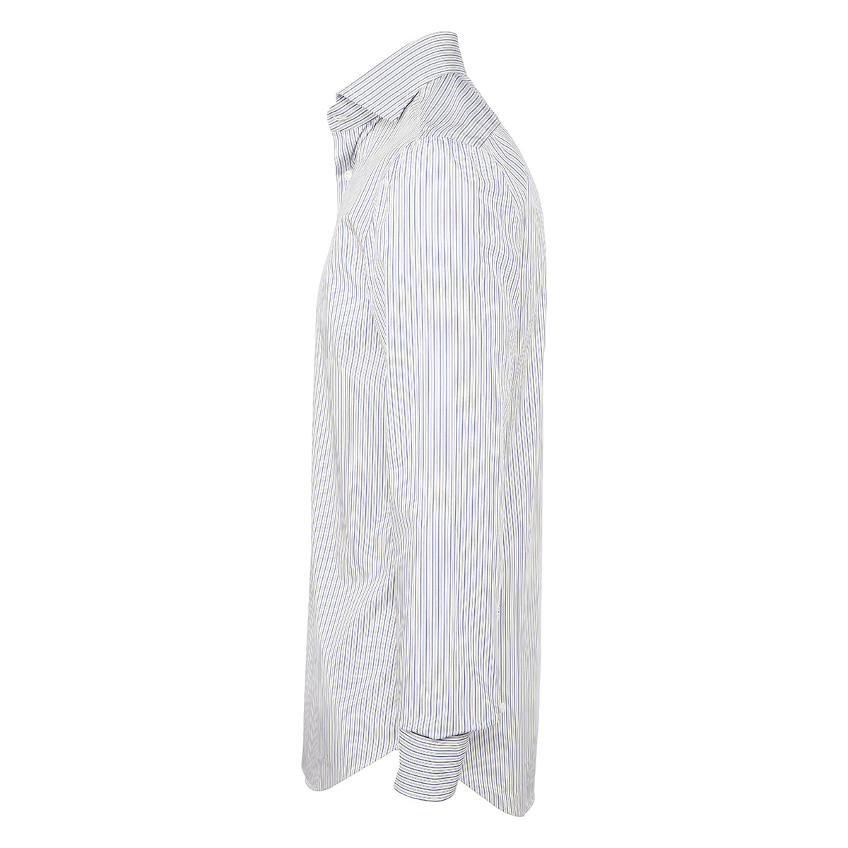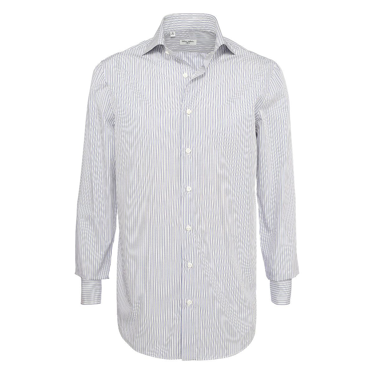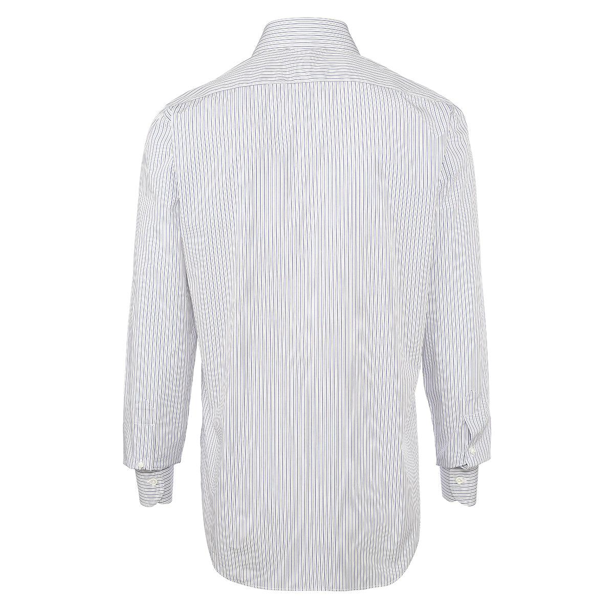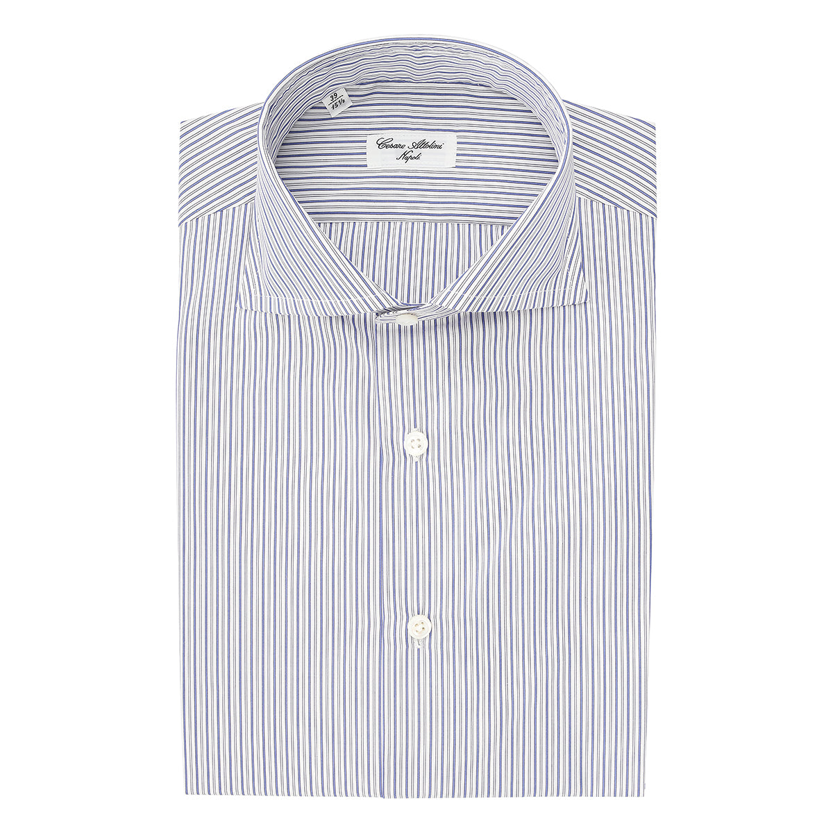 White and blue cotton shirt with alternating striped pattern entirely hand-cut and sewn in our workshop by the skilled hands of our shirt-makers. It is a versatile shirt ideal for both business and formal occasions.