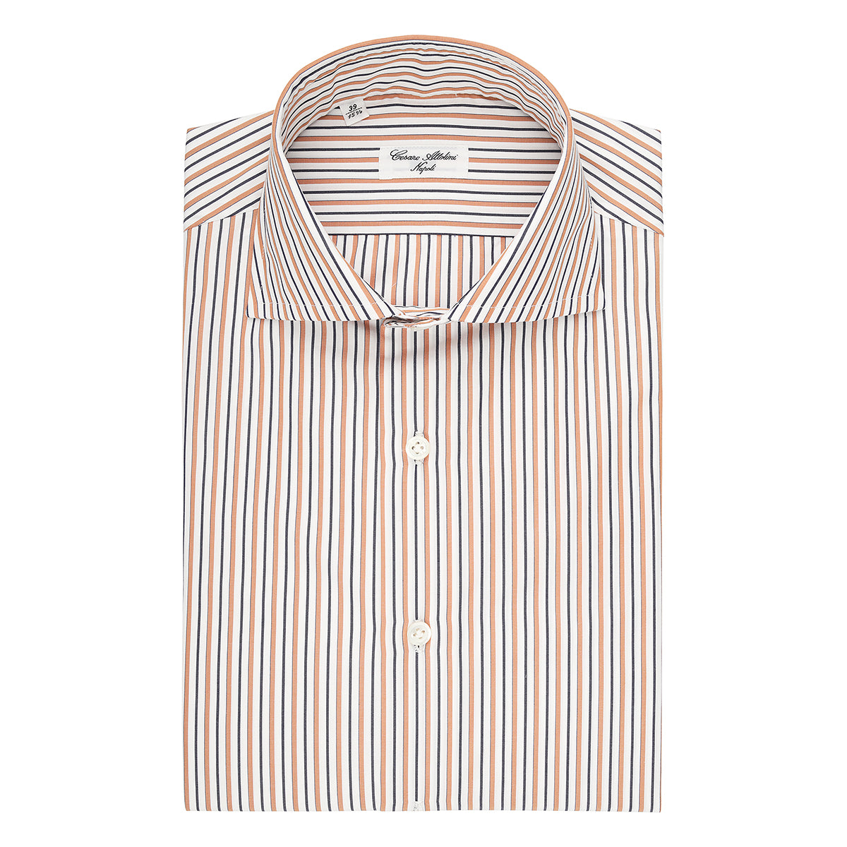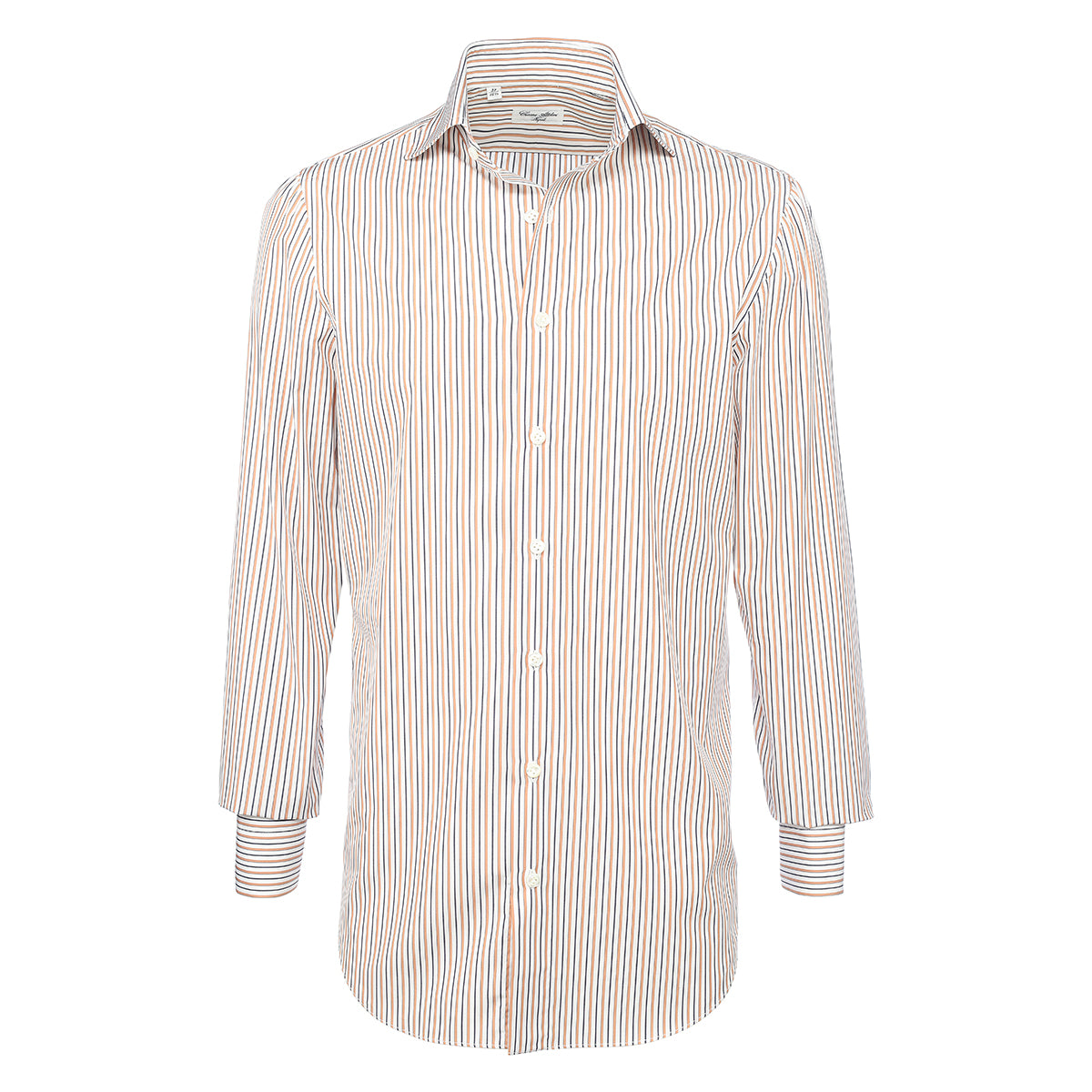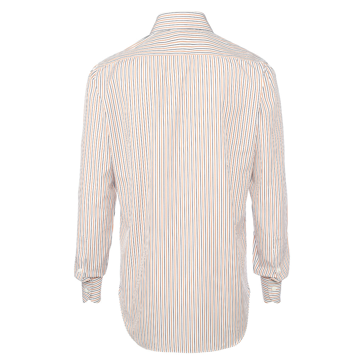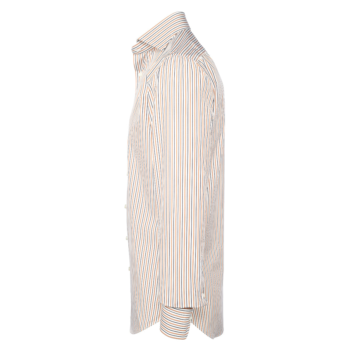 White, blue and orange cotton shirt with alternating striped pattern entirely hand-cut and sewn in our workshop by the skilled hands of our shirt-makers. It is a versatile shirt perfect to complete a formal and leisure look.
