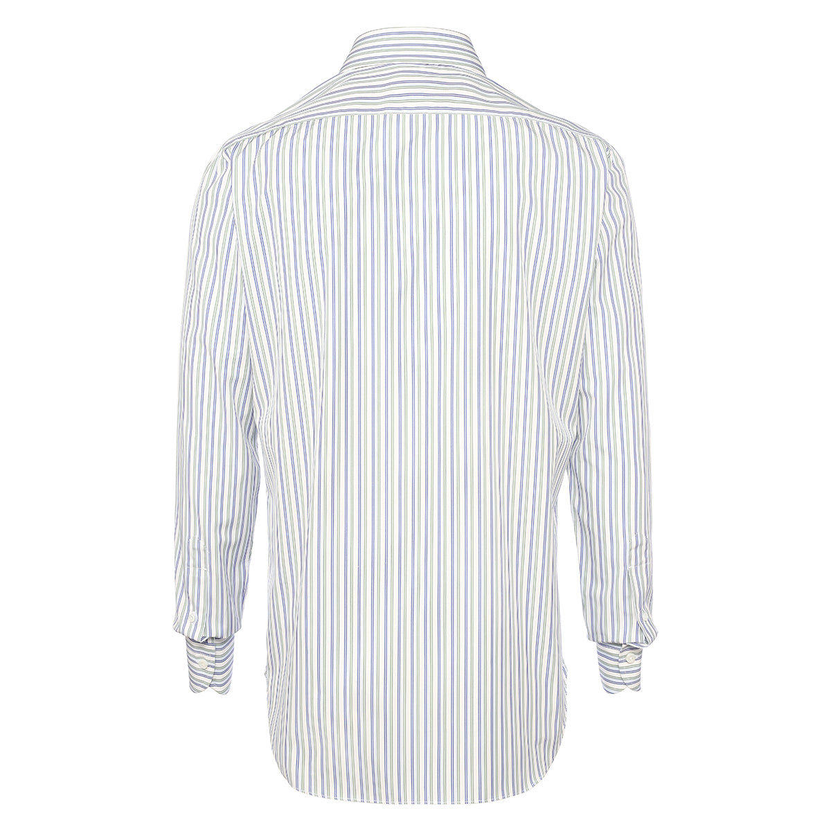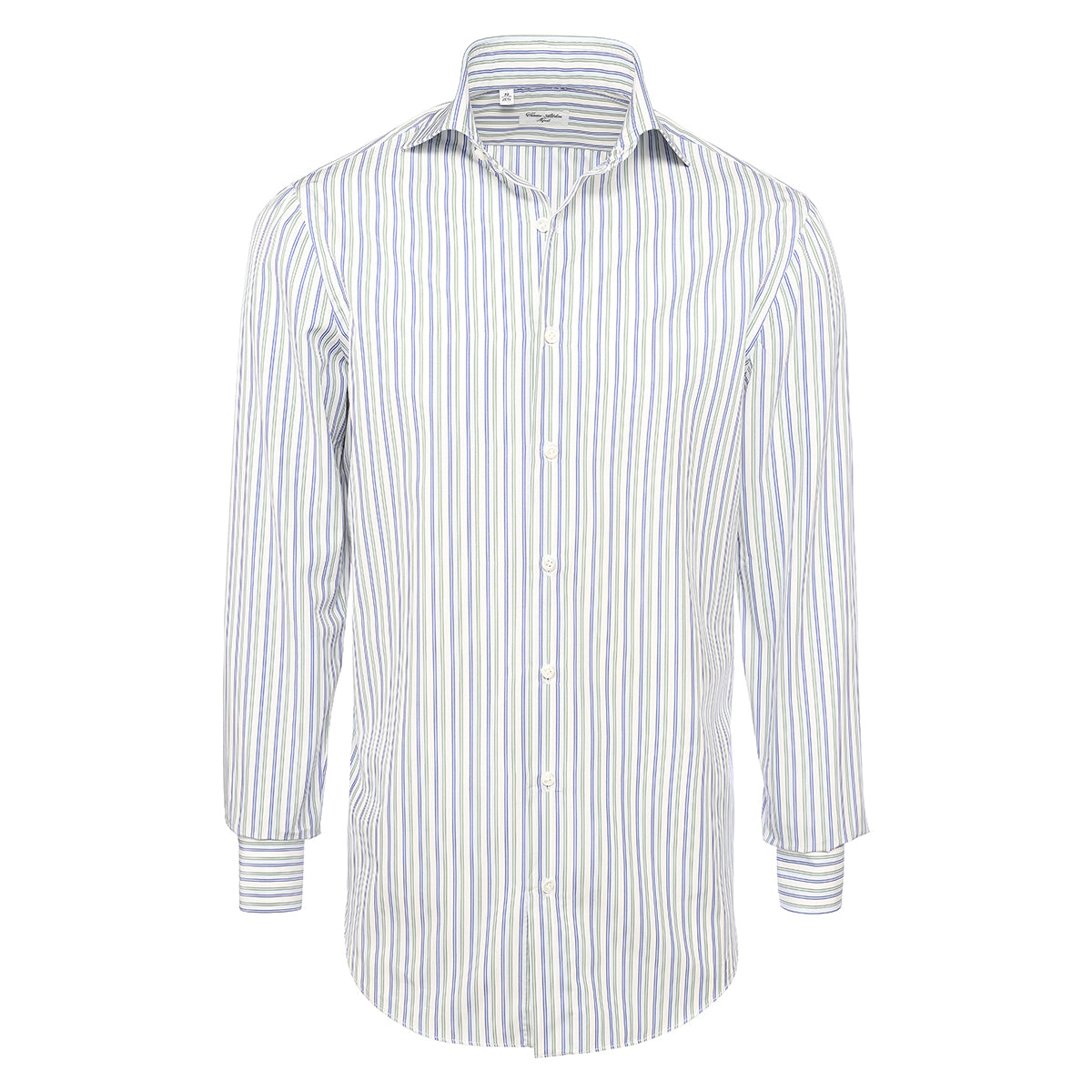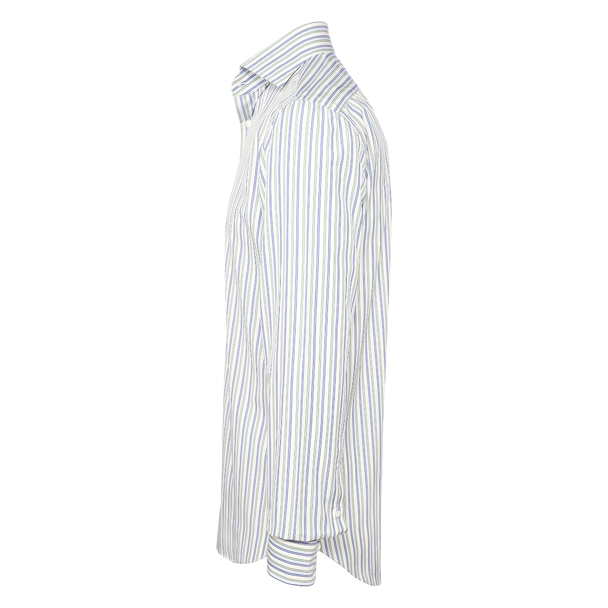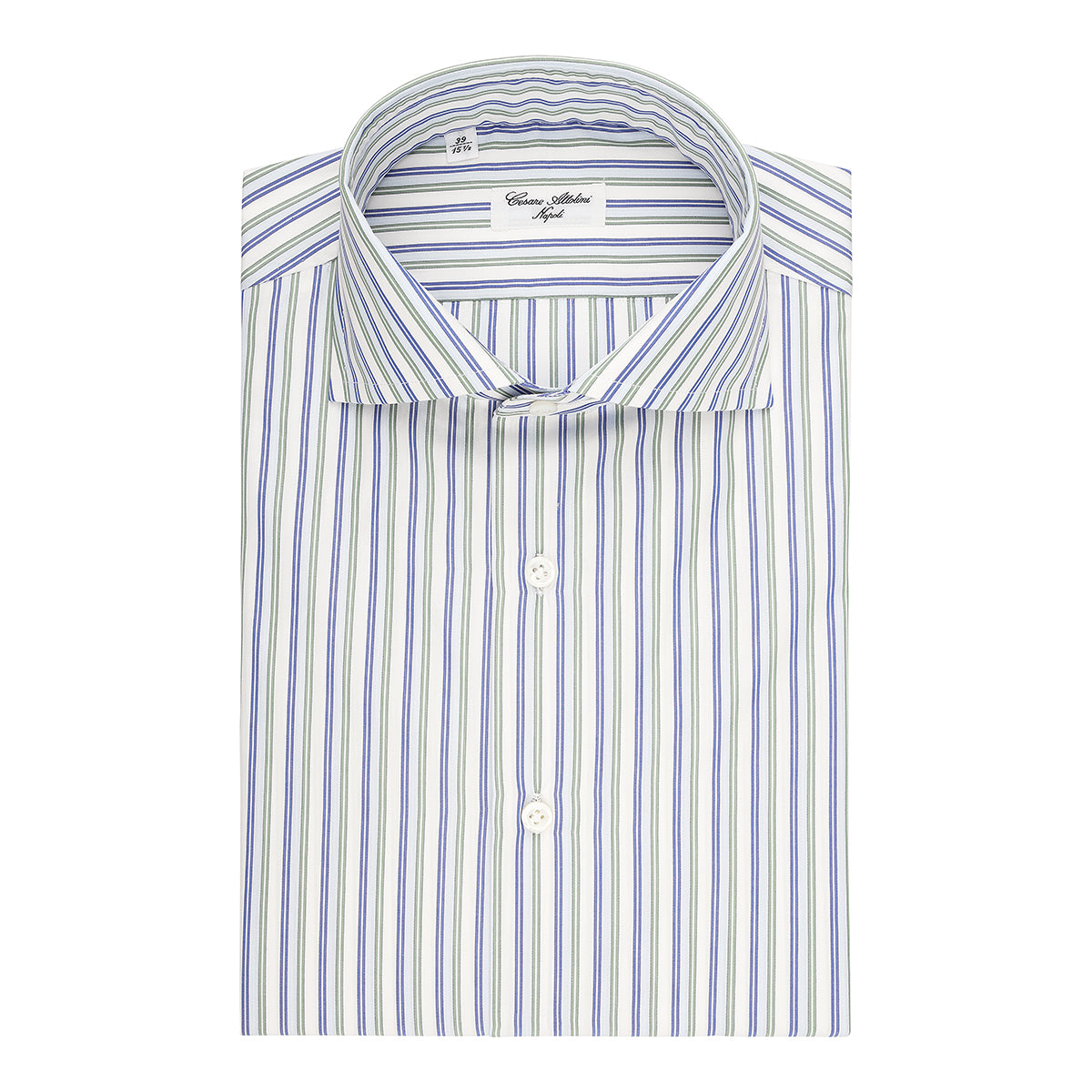 White, cerulean blue and green cotton shirt with alternating striped pattern entirely hand-cut and sewn in our workshop by the skilled hands of our shirt-makers. It is a versatile shirt perfect to complete a formal and leisure look.