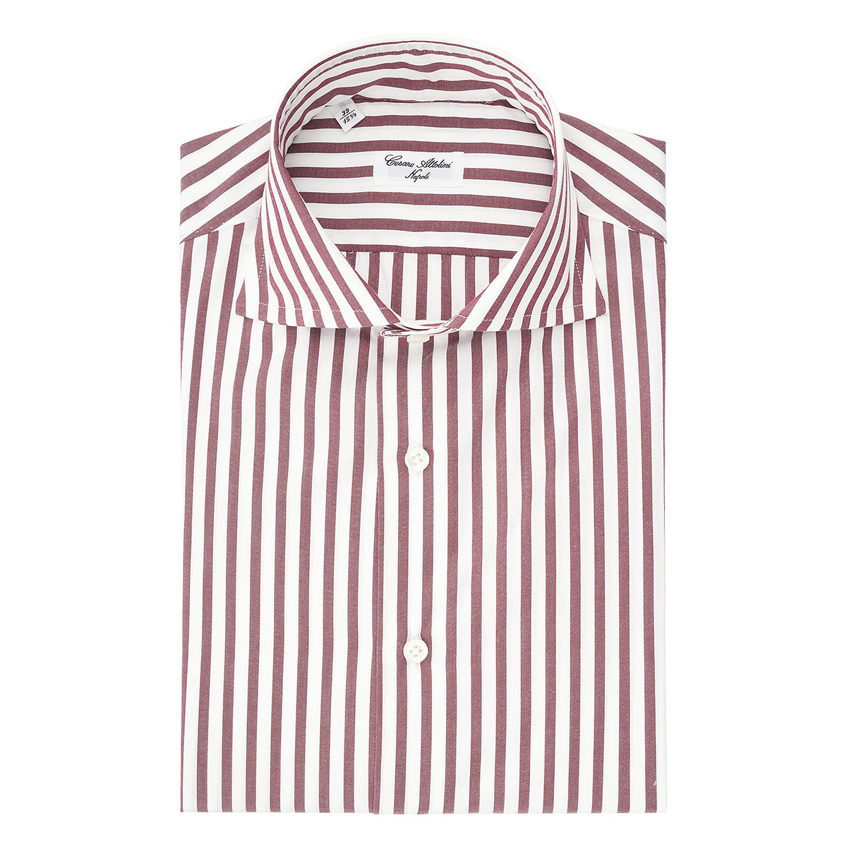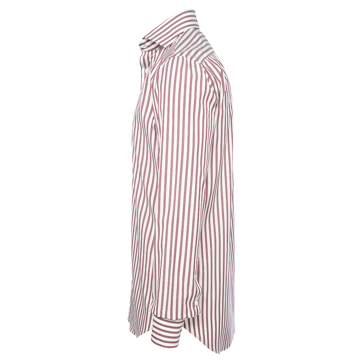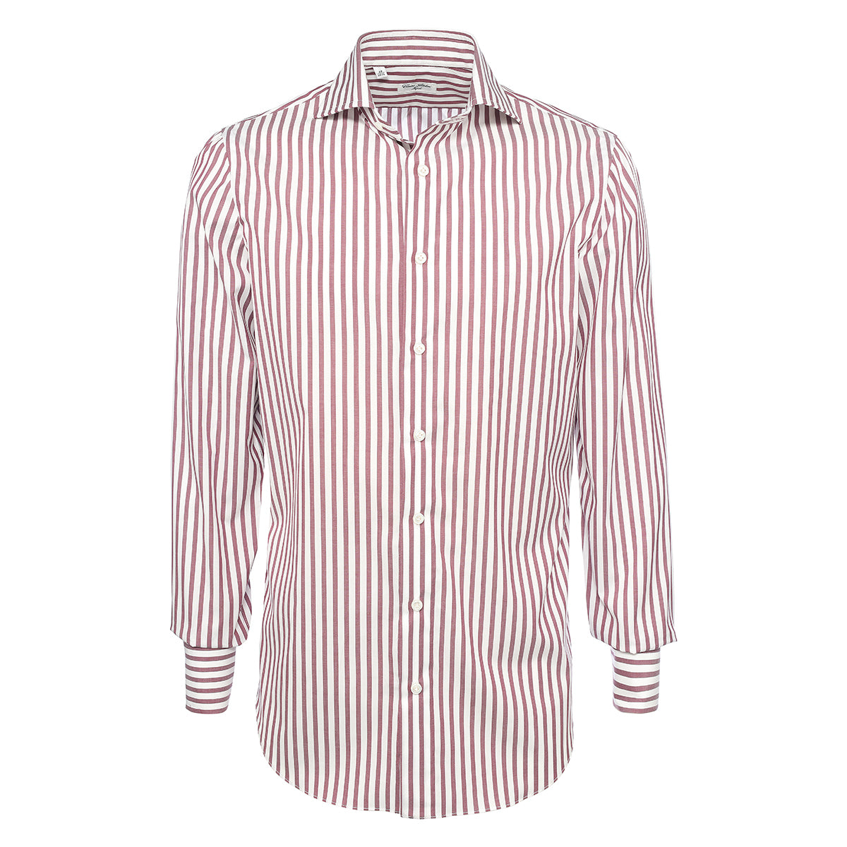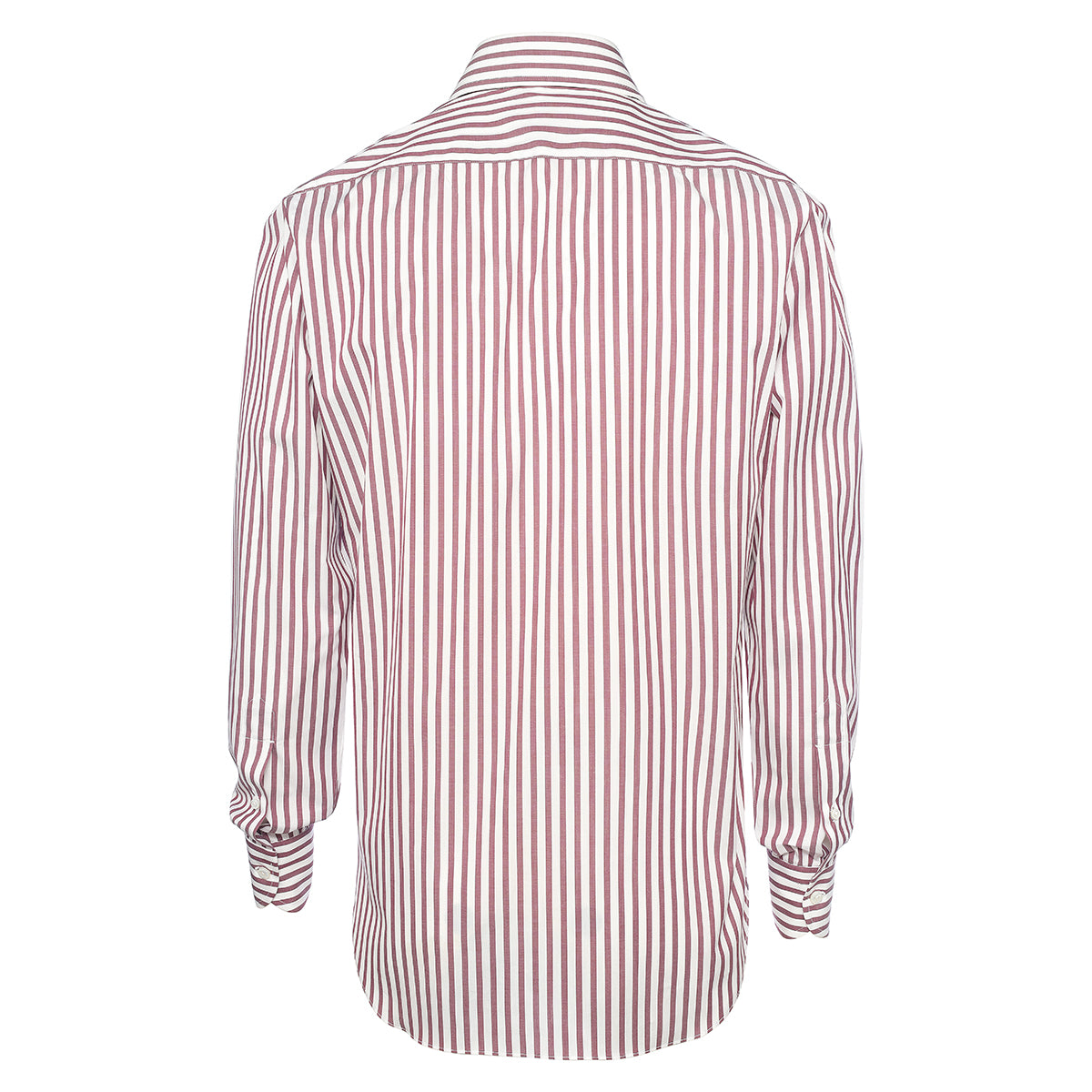 White and plum red cotton shirt with alternating striped pattern entirely hand-cut and sewn in our workshop by the skilled hands of our shirt-makers. It is a versatile shirt ideal for creating a look for both business and leisure, ensuring comfort and practicality without compromising on elegance.