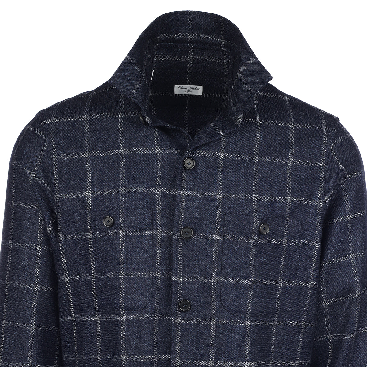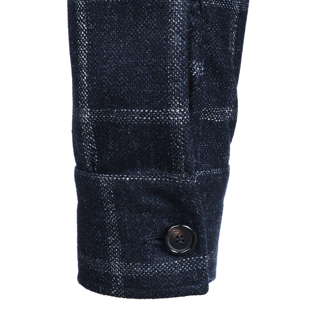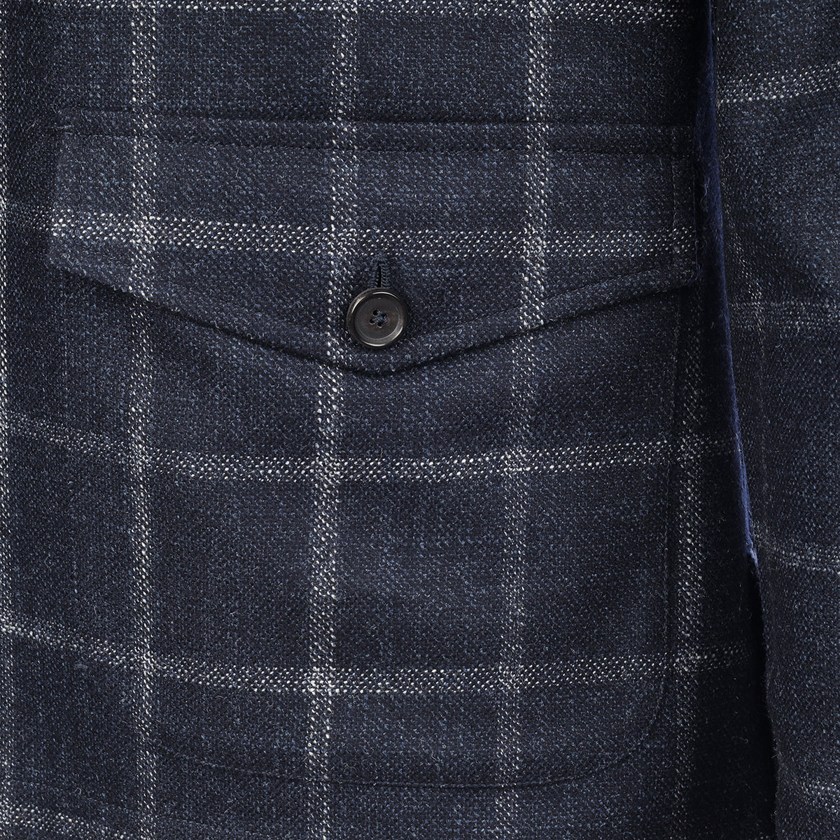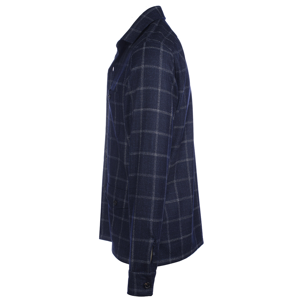 Wool, silk and cashmere blue check white overshirt. Two patch pockets with flaps and two breast pockets with button. Entirely cut and sewn by the skilled hands of our shirt-makers by hand in our workshop. Ideal shirt to create a long-time look, ensuring comfort.