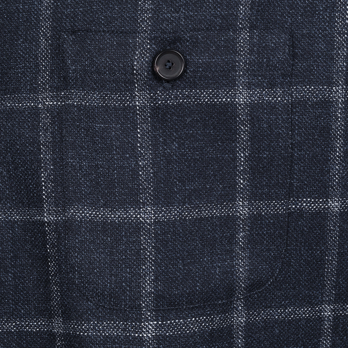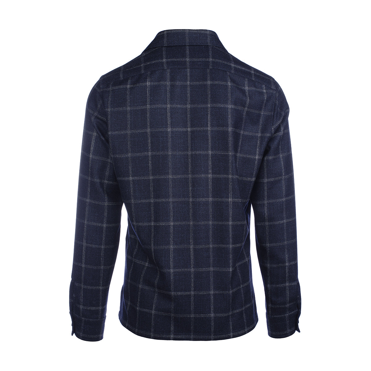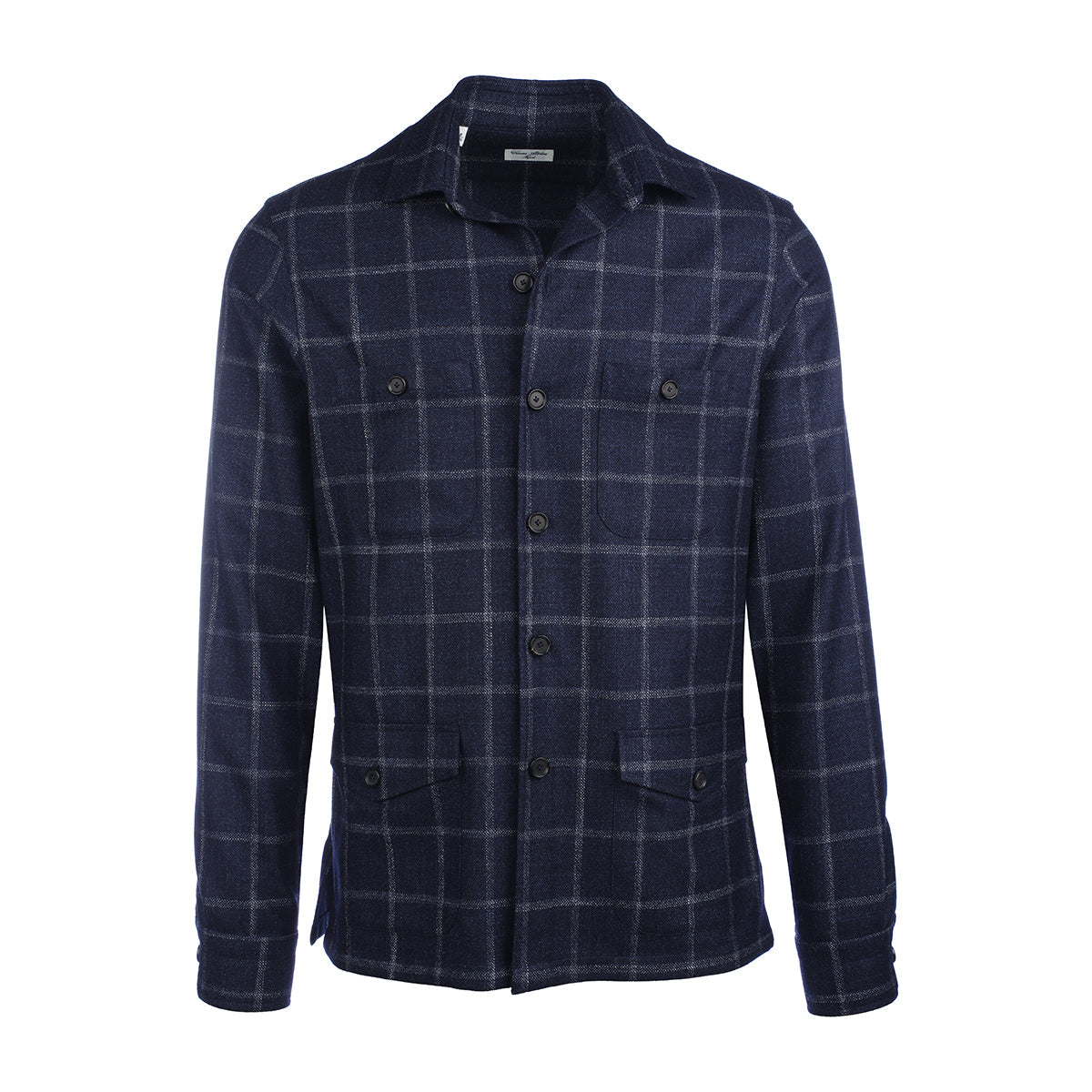 Wool, silk and cashmere blue check white overshirt. Two patch pockets with flaps and two breast pockets with button. Entirely cut and sewn by the skilled hands of our shirt-makers by hand in our workshop. Ideal shirt to create a long-time look, ensuring comfort.
