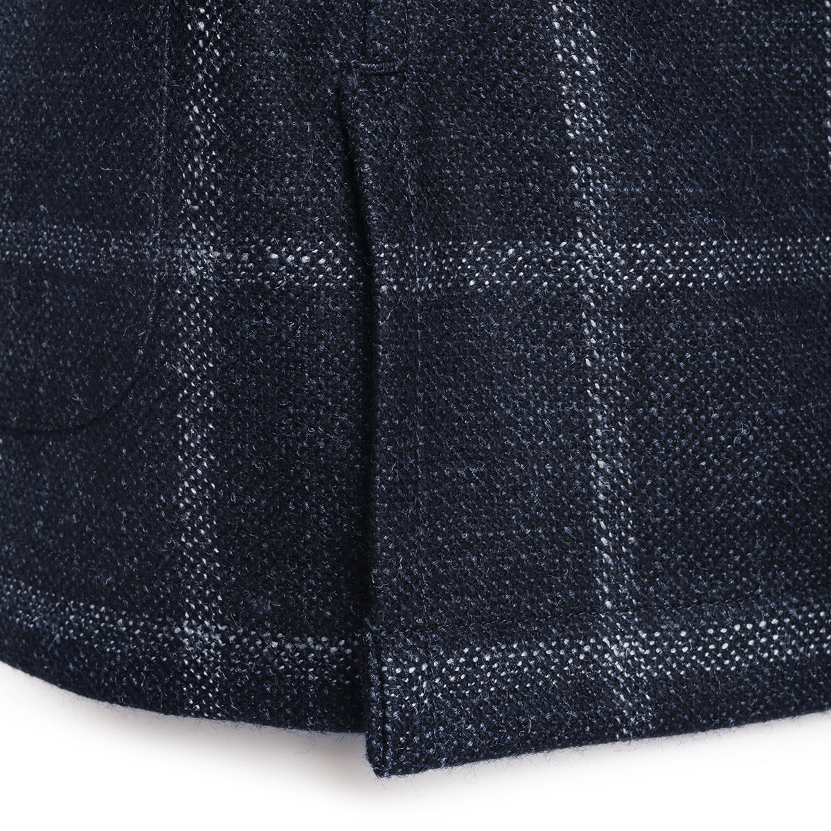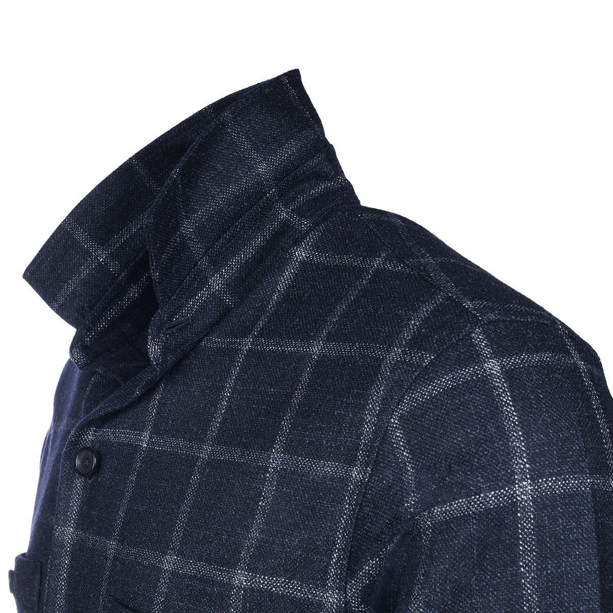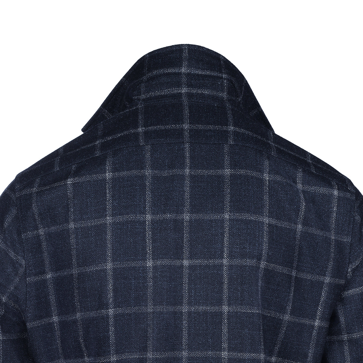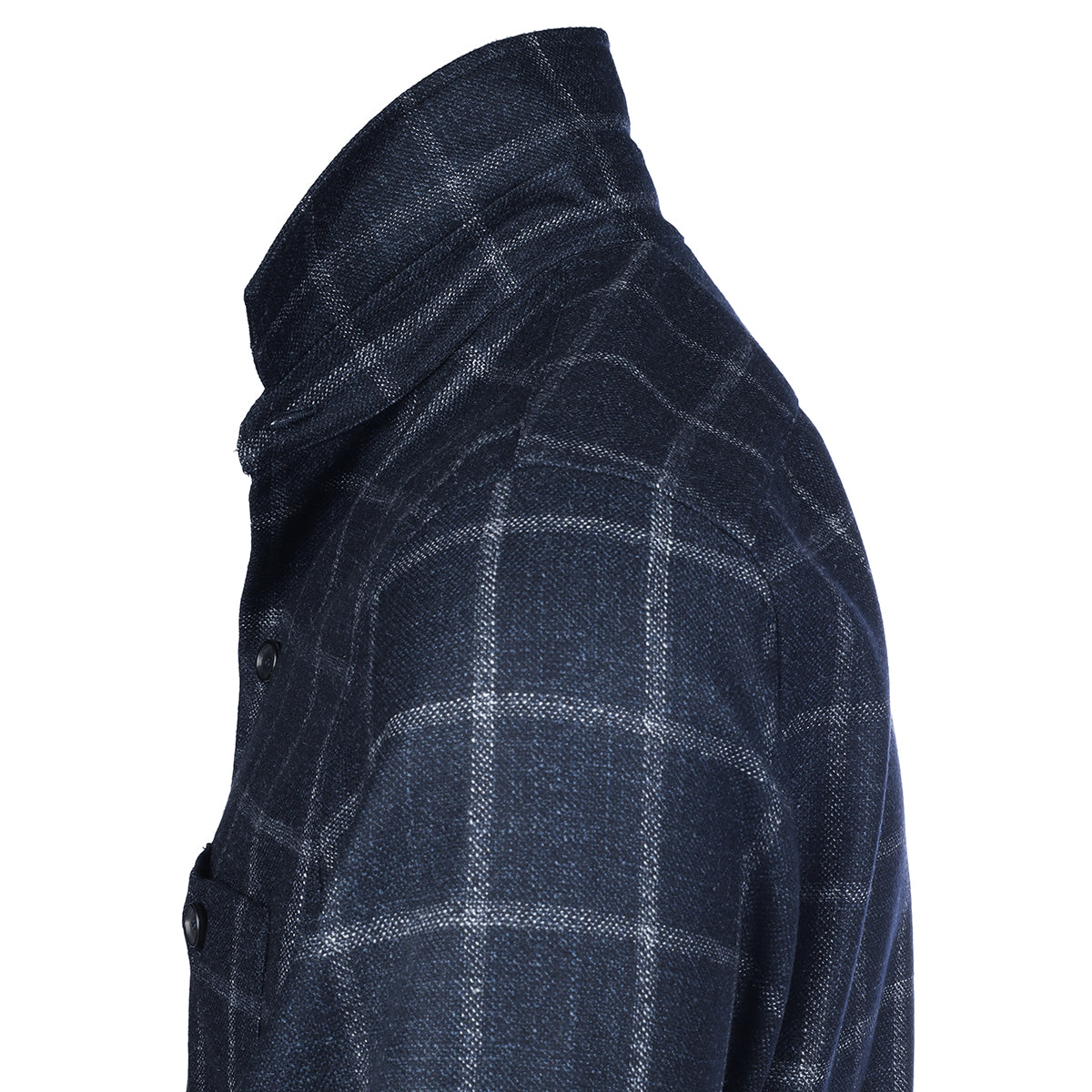 Wool, silk and cashmere blue check white overshirt. Two patch pockets with flaps and two breast pockets with button. Entirely cut and sewn by the skilled hands of our shirt-makers by hand in our workshop. Ideal shirt to create a long-time look, ensuring comfort.