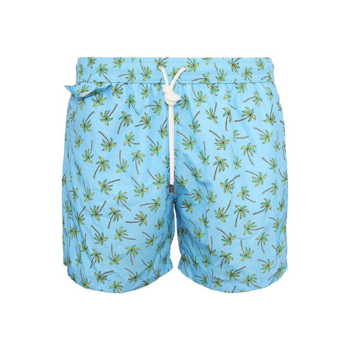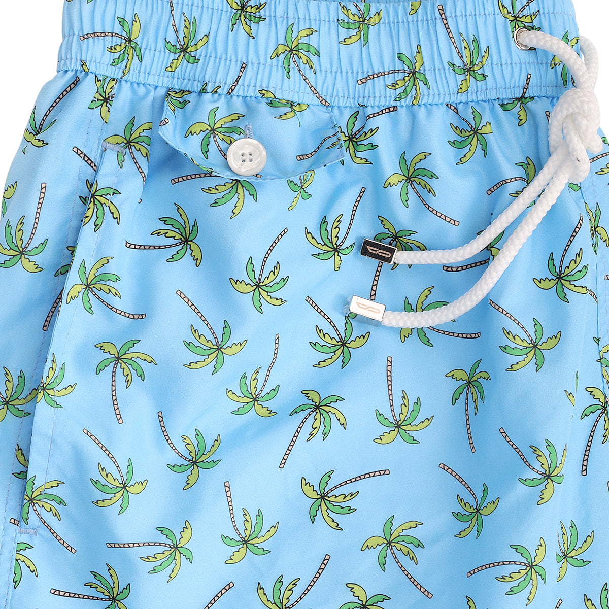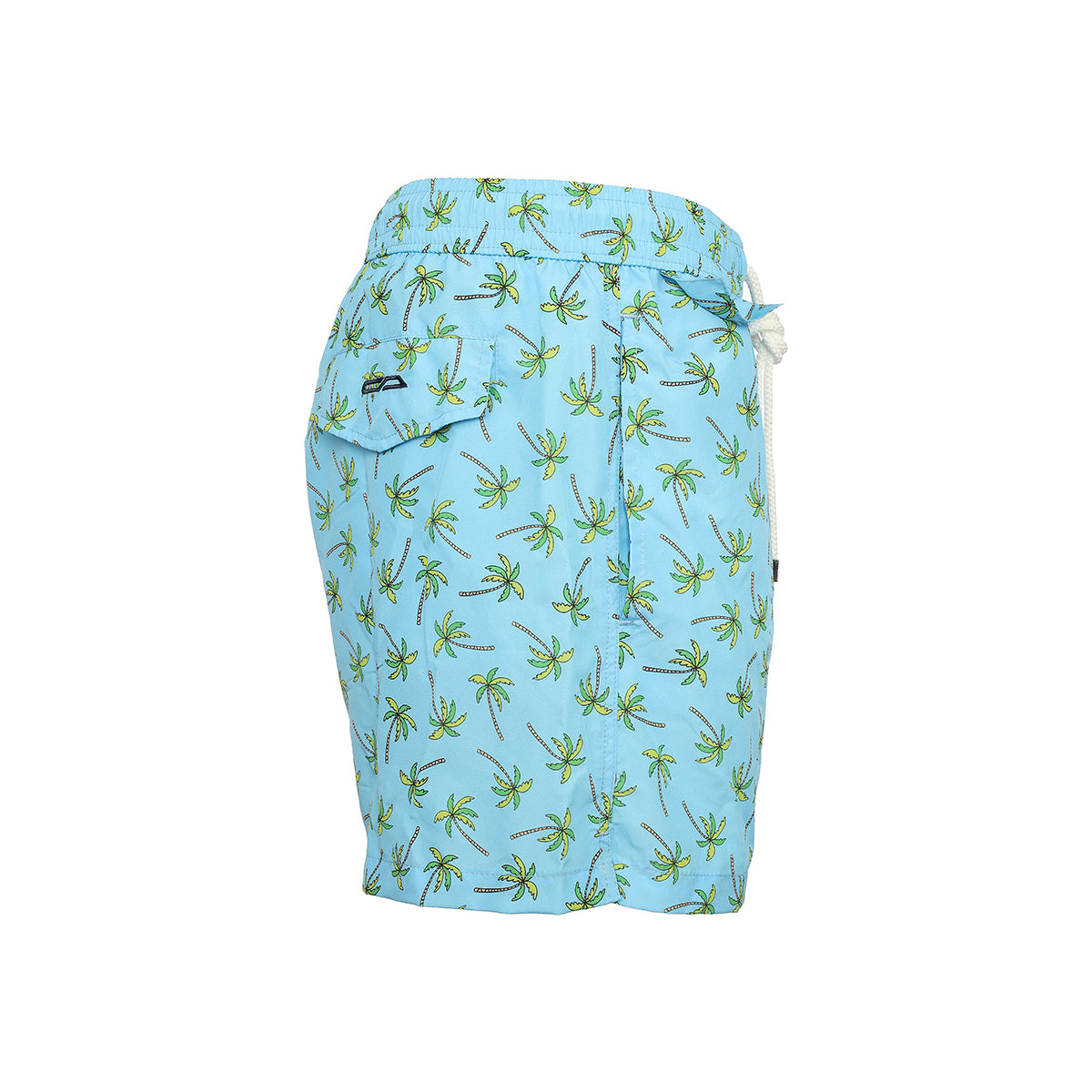 Light blue swimming trunks with palm design in green color, drawstring and metal cords end, 2 pockets with mini pocket and button on the front, 1 rear pocket and swimwear bag