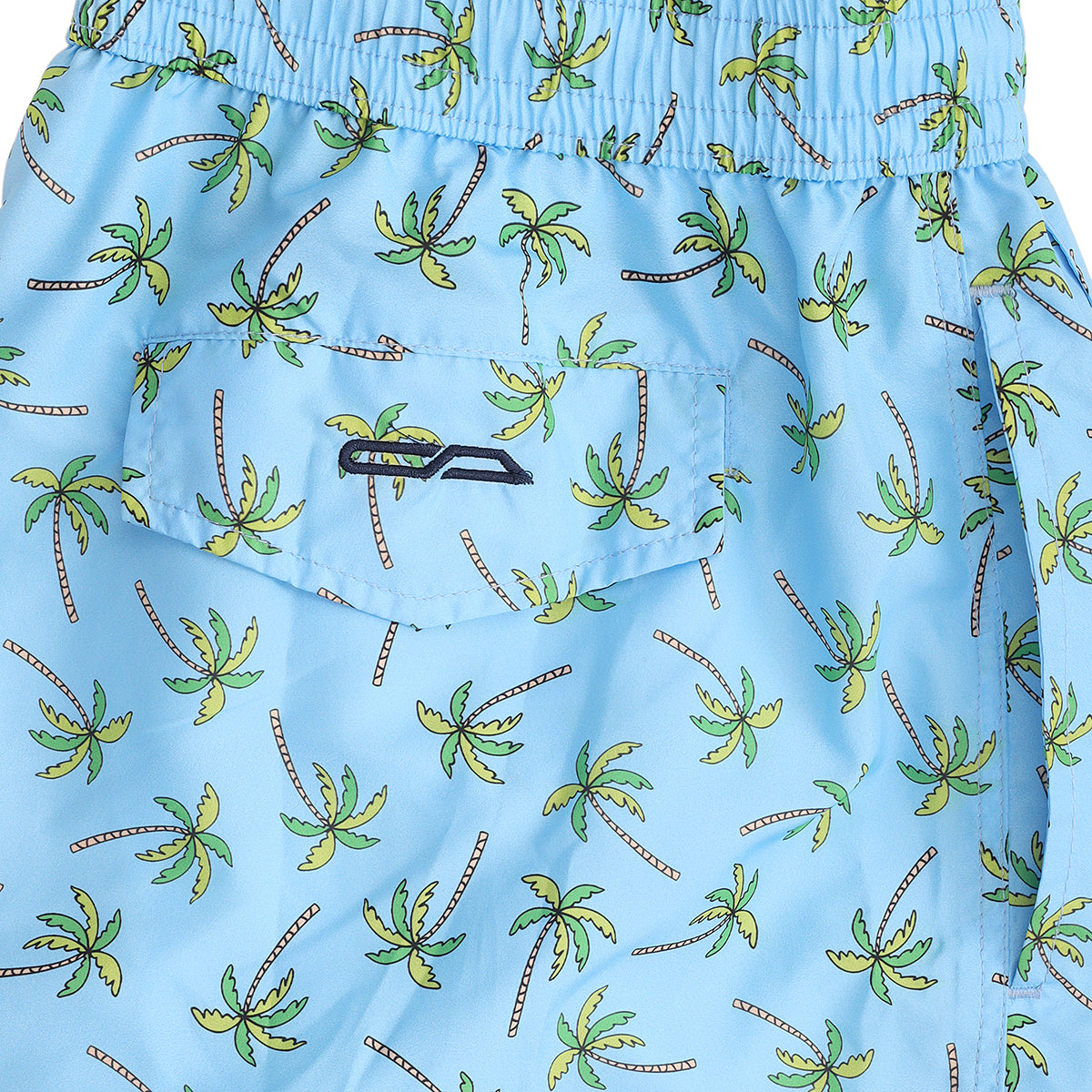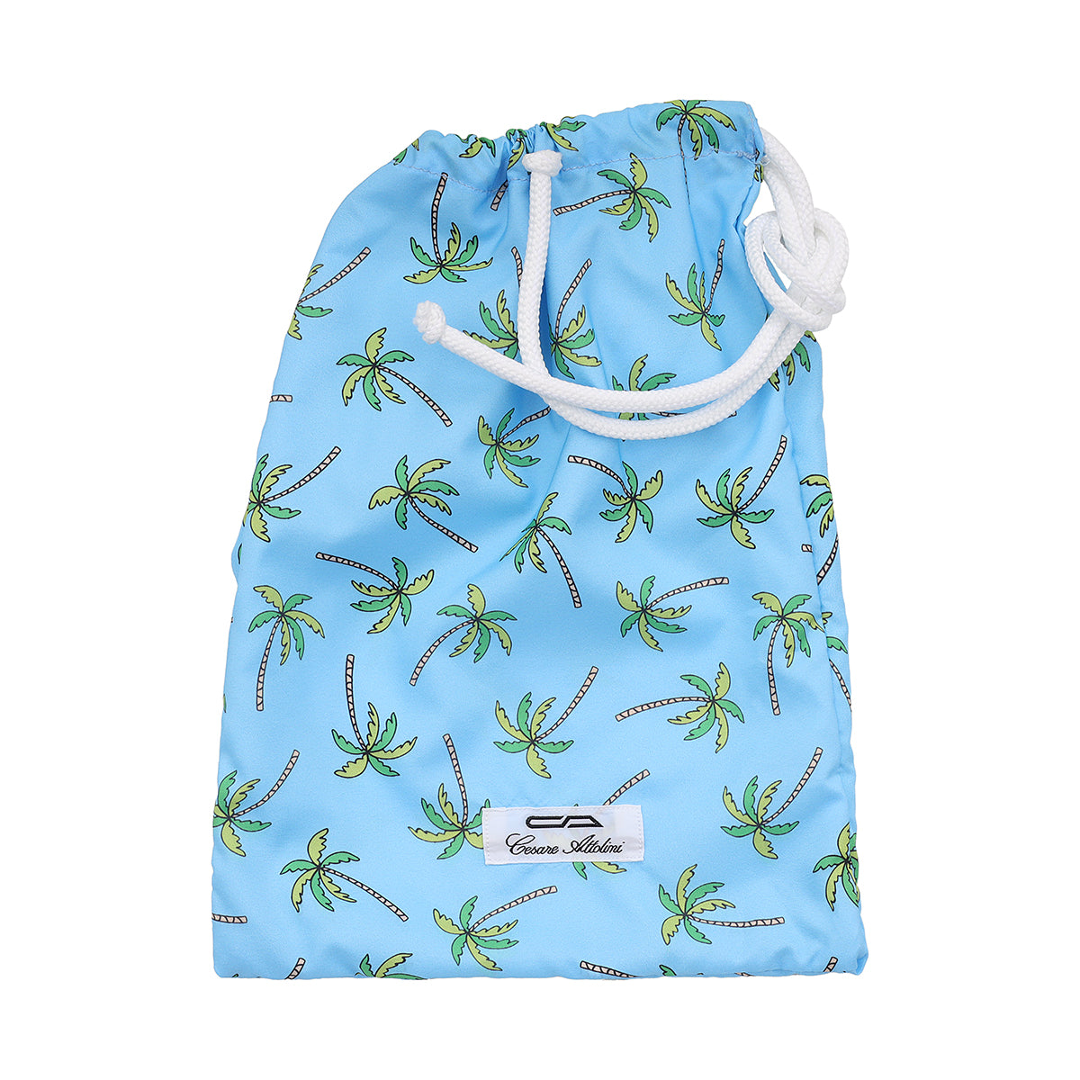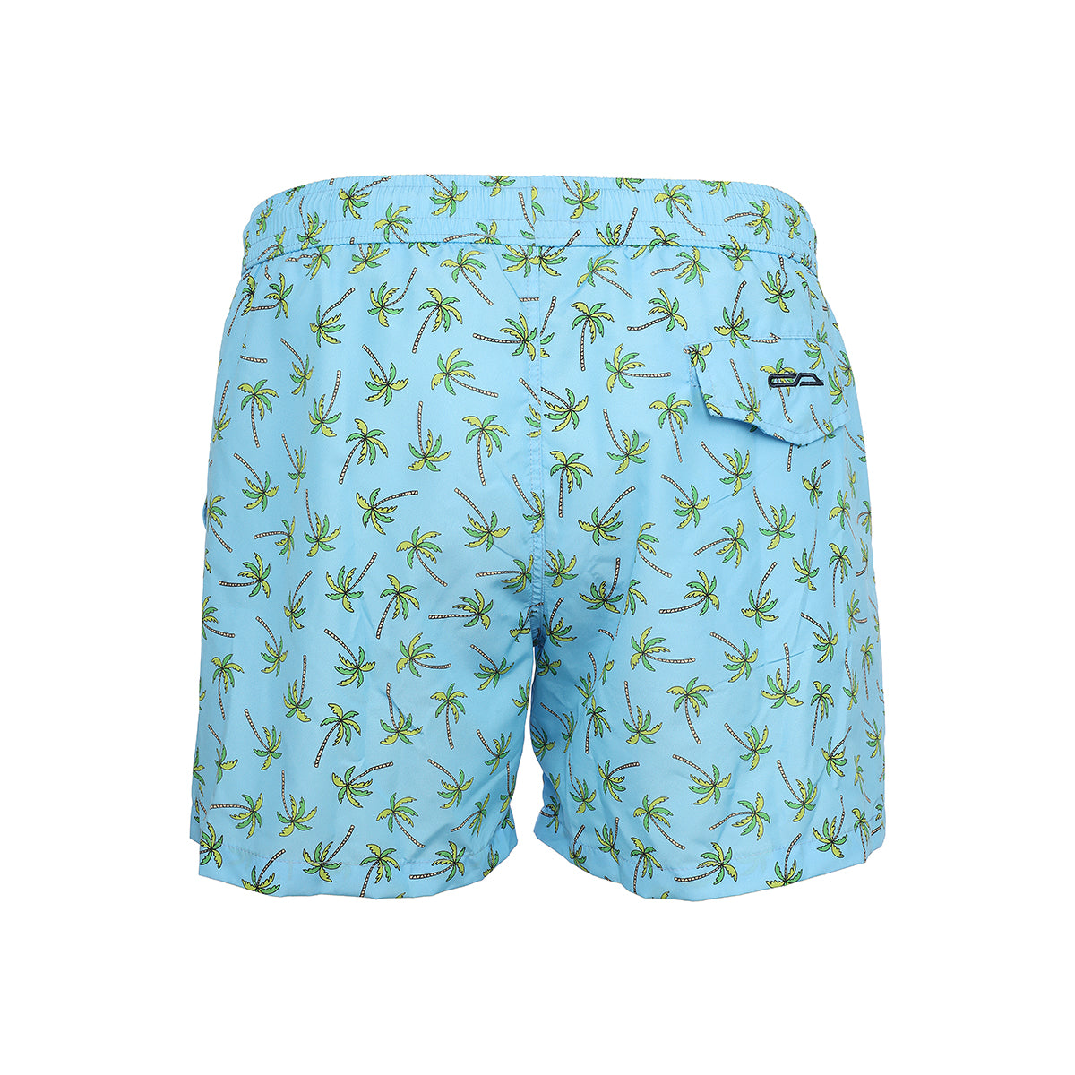 Light blue swimming trunks with palm design in green color, drawstring and metal cords end, 2 pockets with mini pocket and button on the front, 1 rear pocket and swimwear bag