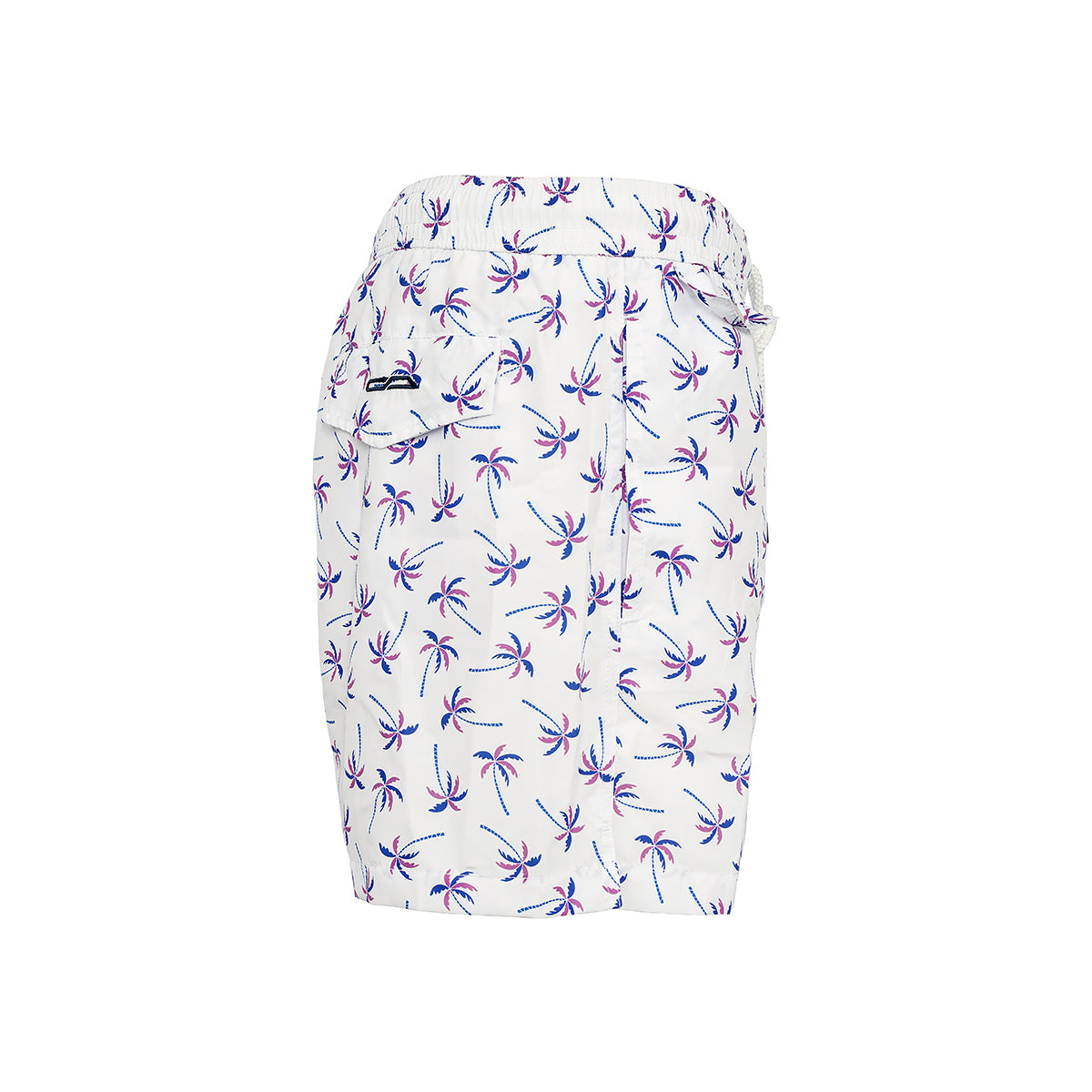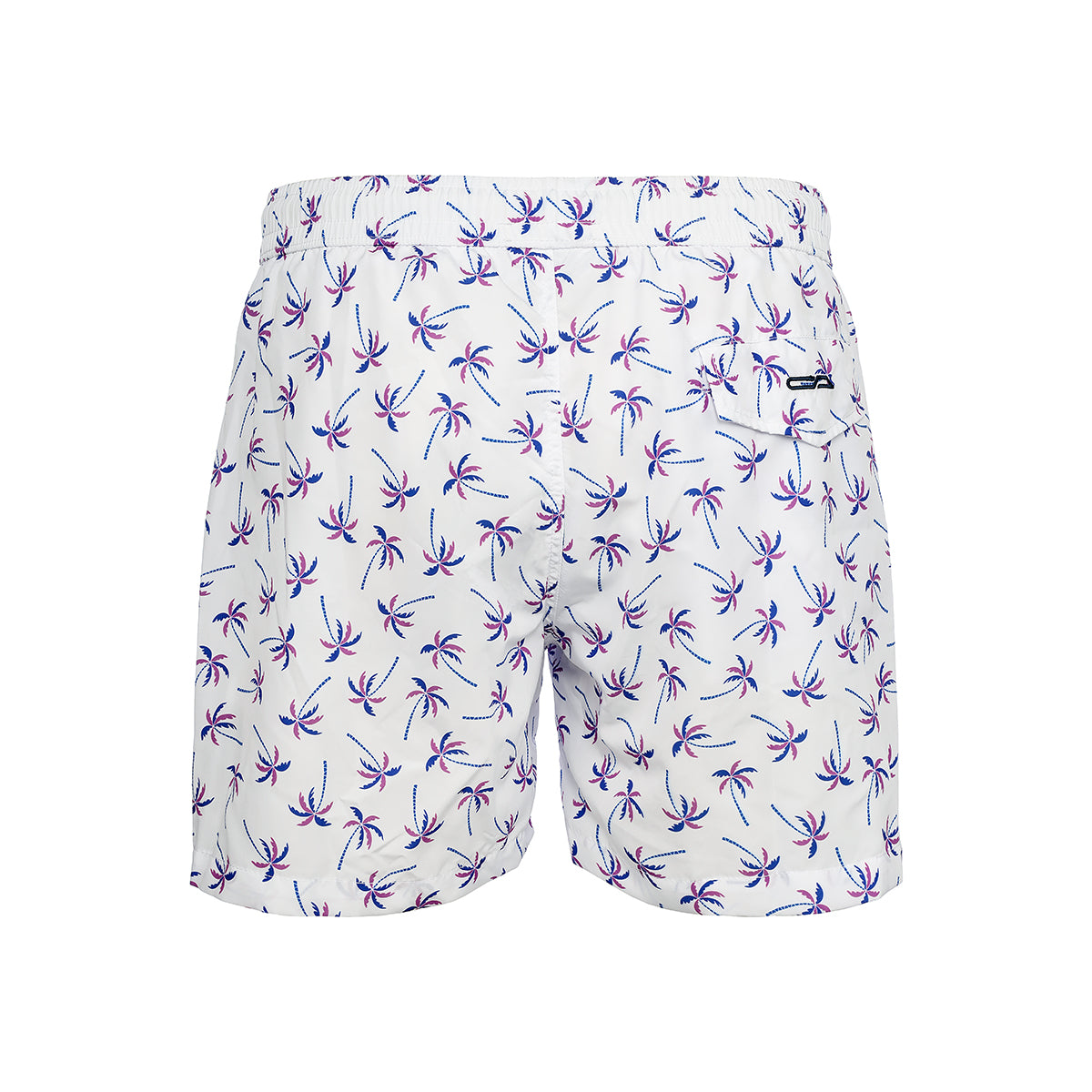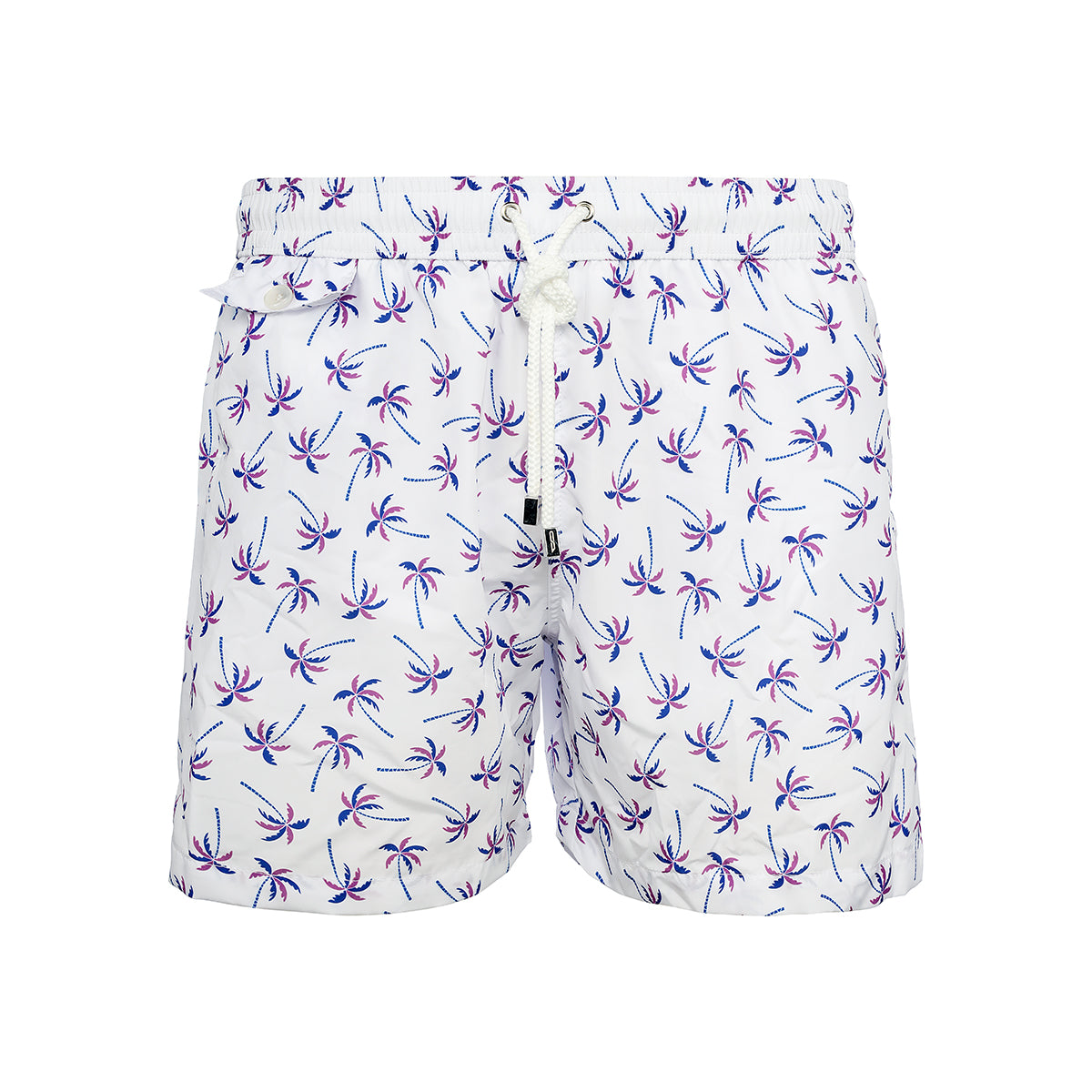 White swimming trunks with palm design in blu color , drawsting and metal cords end, 2 pockets with mini pocket and button on the front, 1 rear pocket and swimwear bag