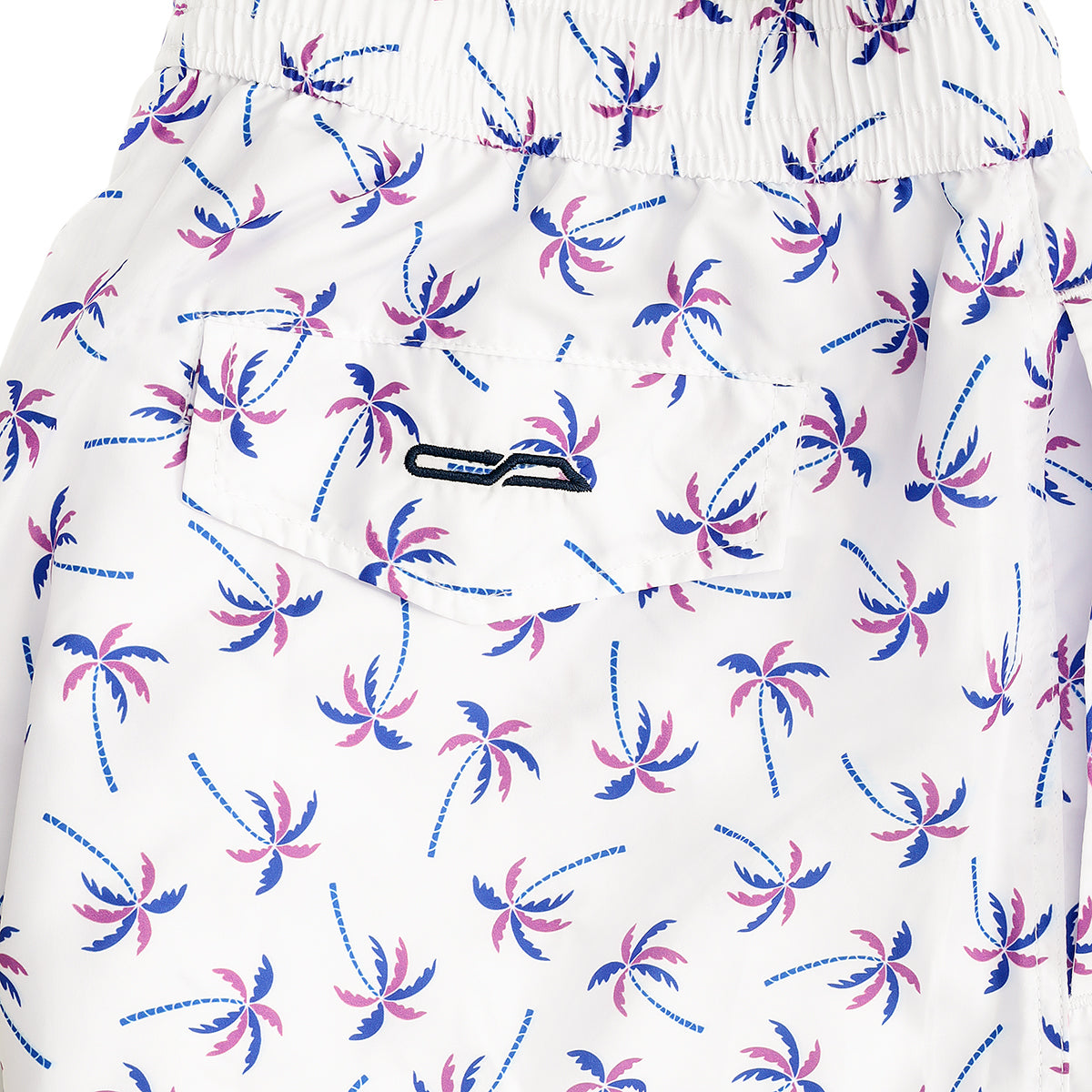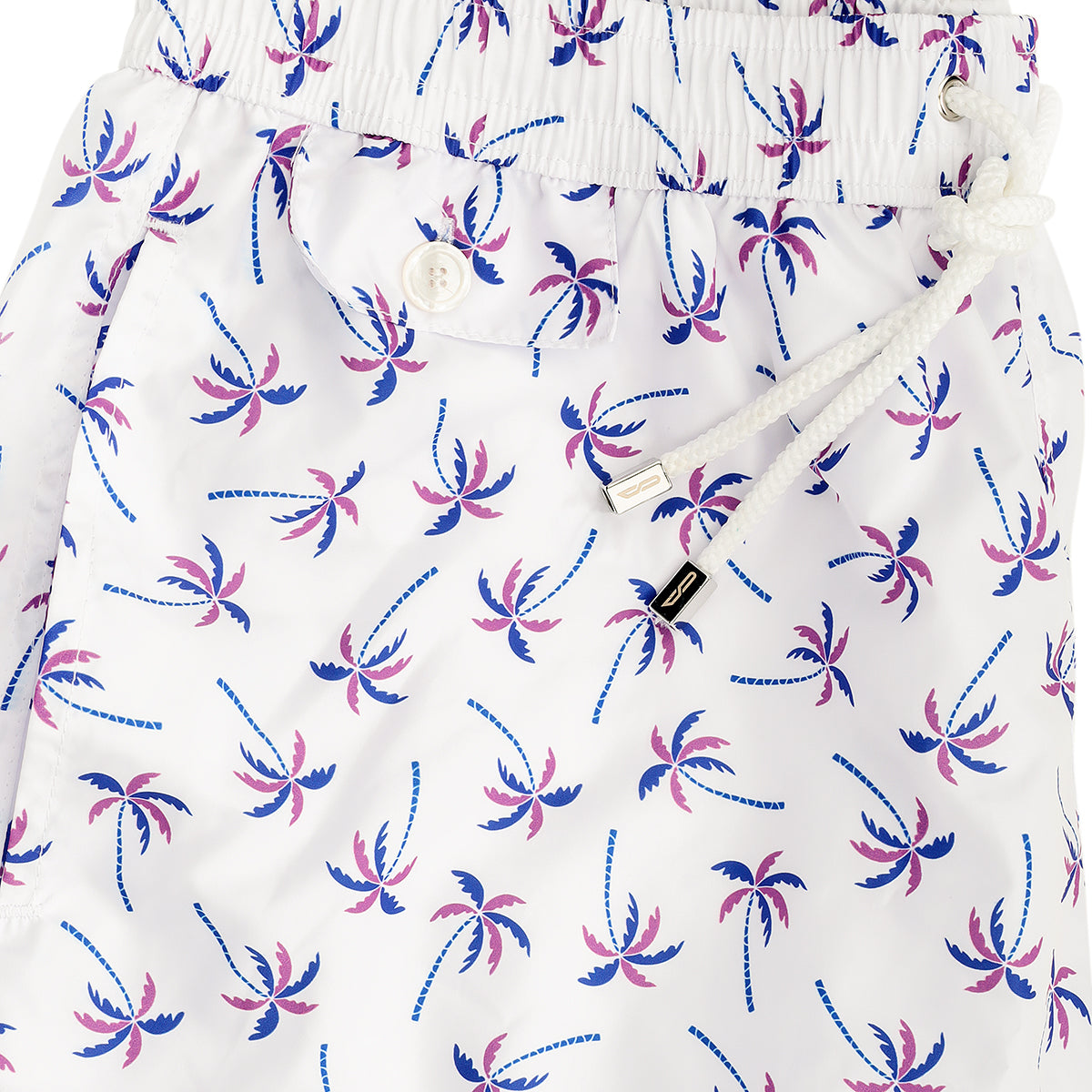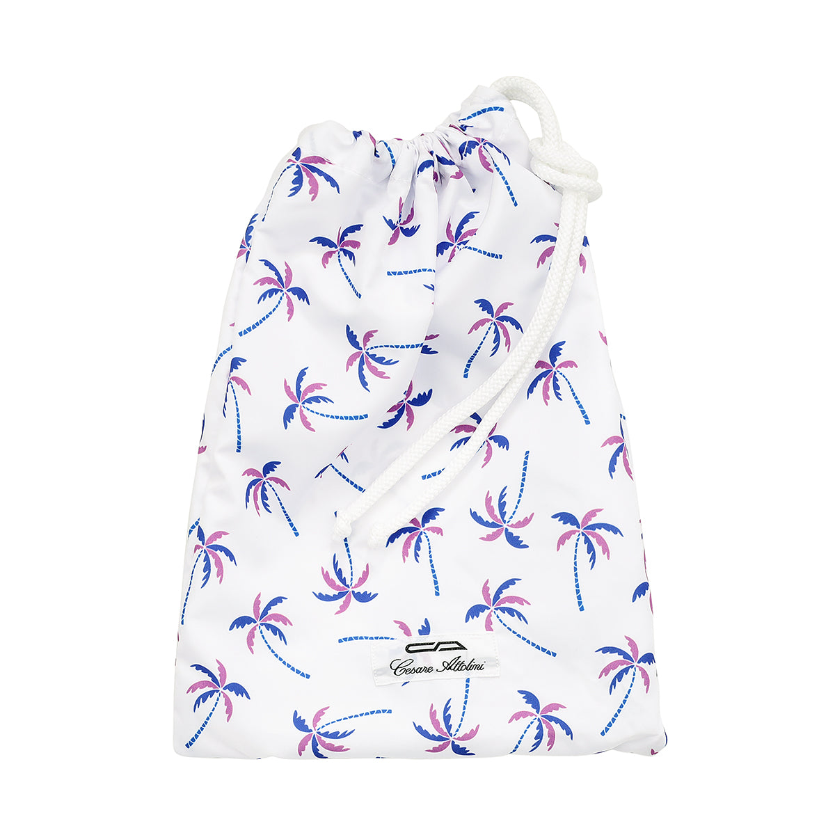 White swimming trunks with palm design in blu color , drawsting and metal cords end, 2 pockets with mini pocket and button on the front, 1 rear pocket and swimwear bag