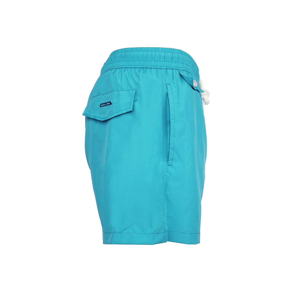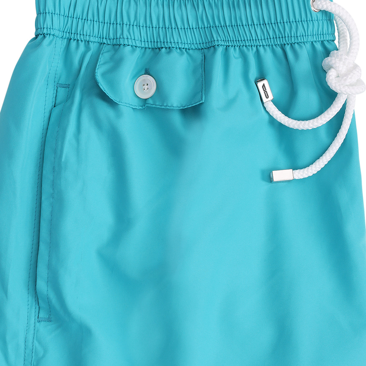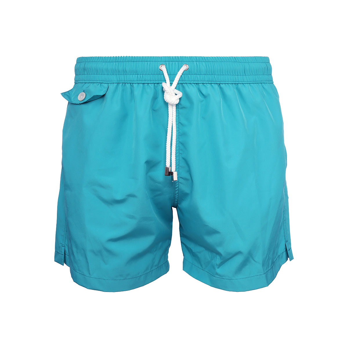 Plain sea water color swimming trunks with drawstring and metal cords end, 2 pockets with mini pocket and button on the front, 1 rear pocket and swimwear bag