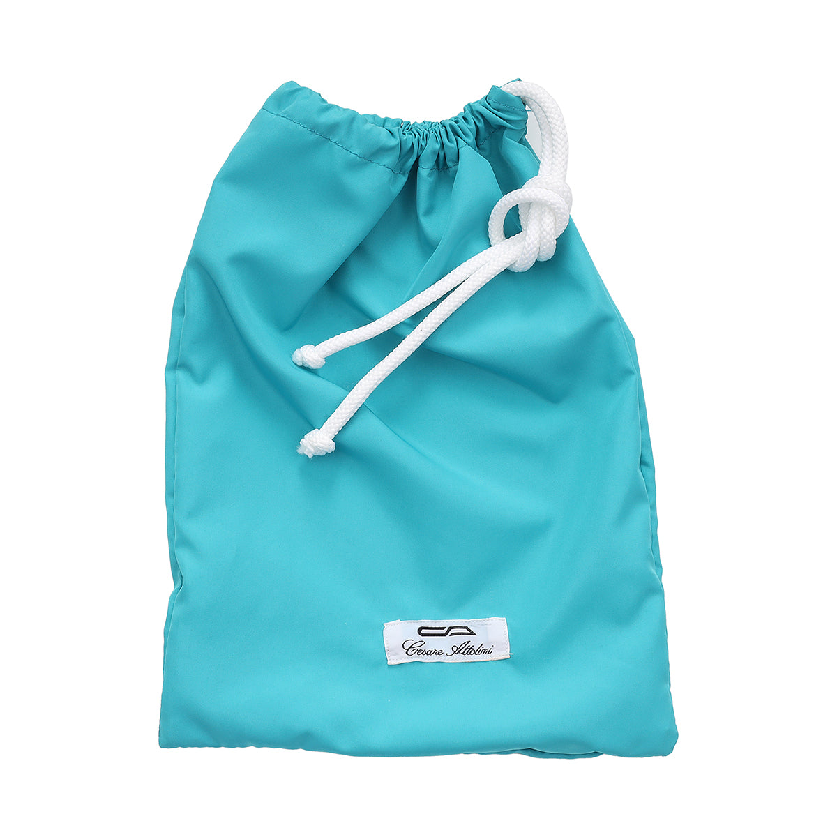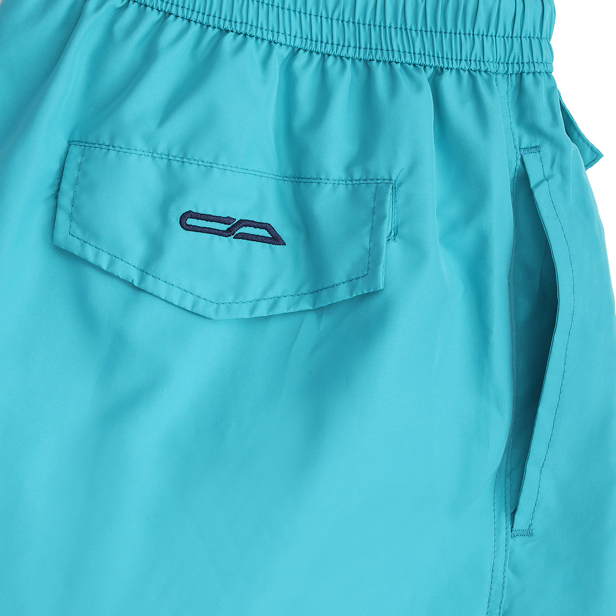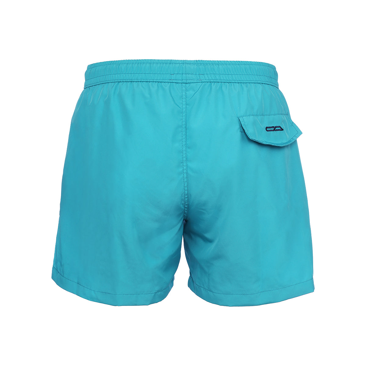 Plain sea water color swimming trunks with drawstring and metal cords end, 2 pockets with mini pocket and button on the front, 1 rear pocket and swimwear bag