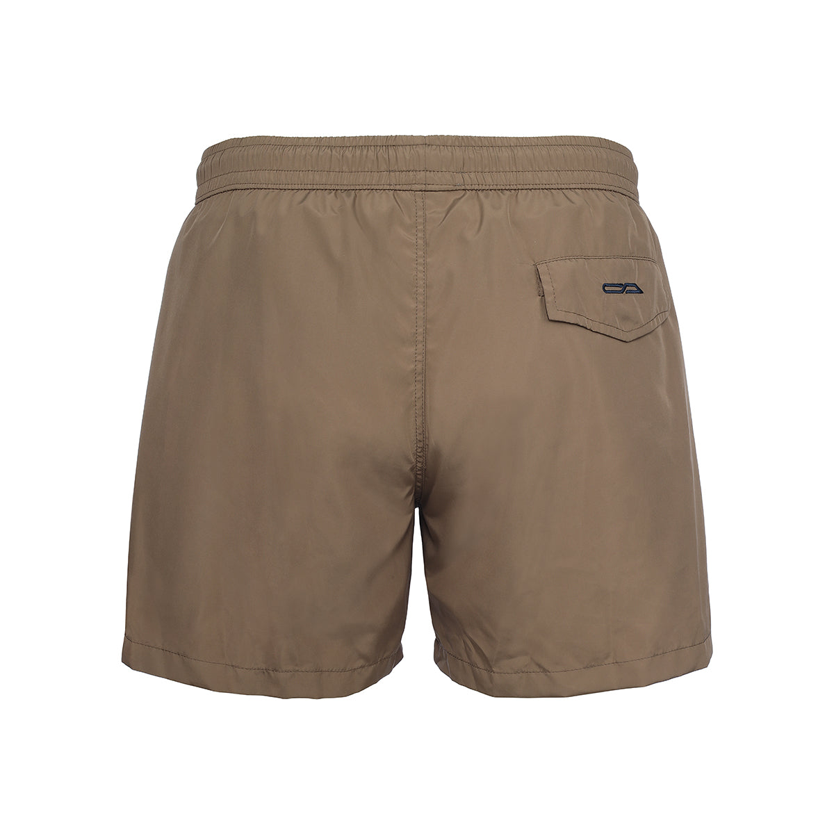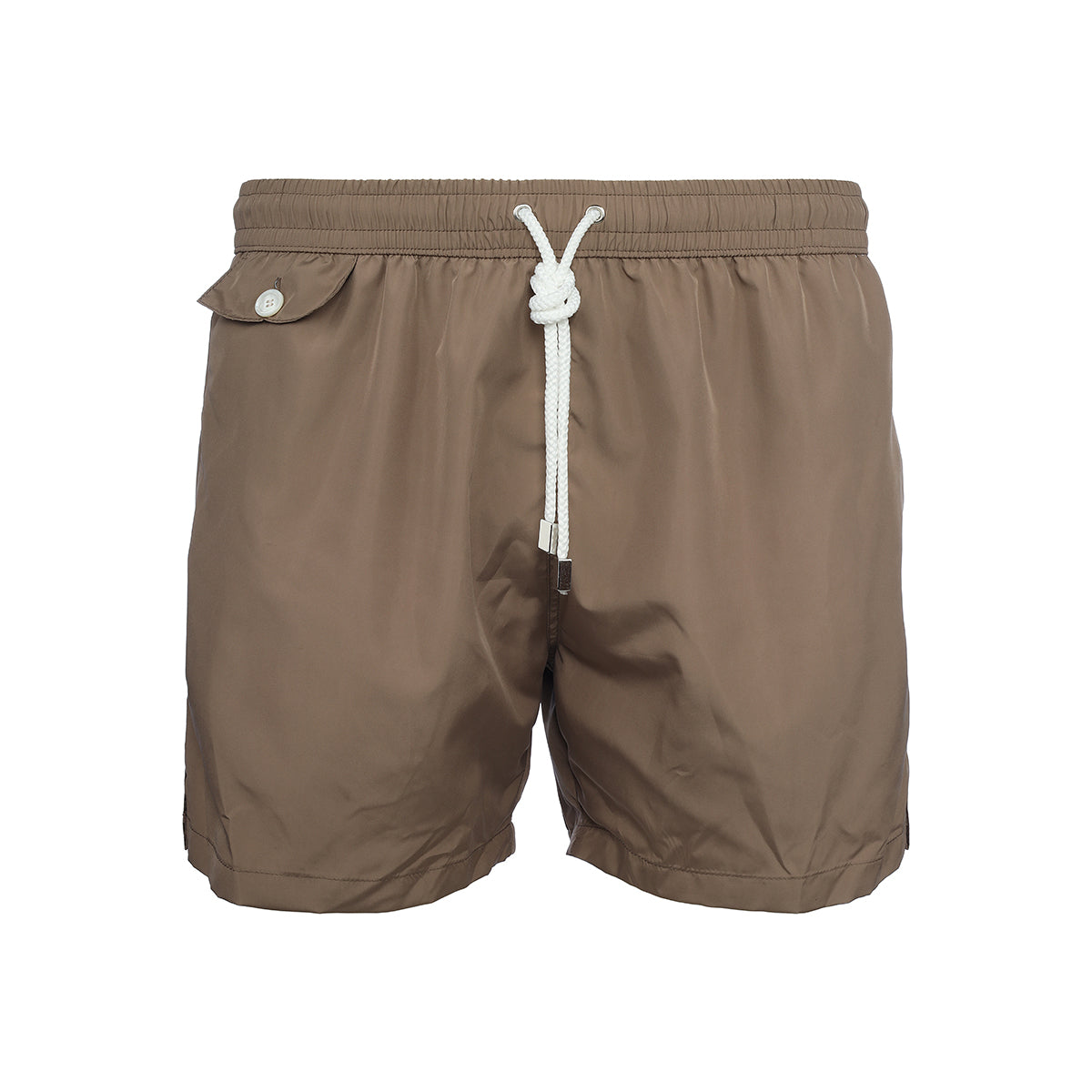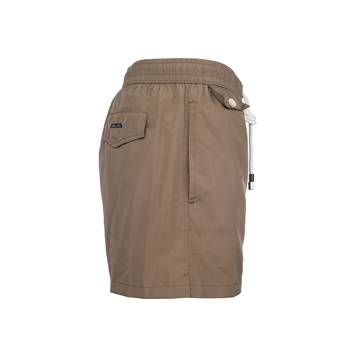 Plain beige swimming trunks with drawstring and metal cords end, 2 pockets with mini pocket and button on the front, 1 rear pocket and swimwear bag