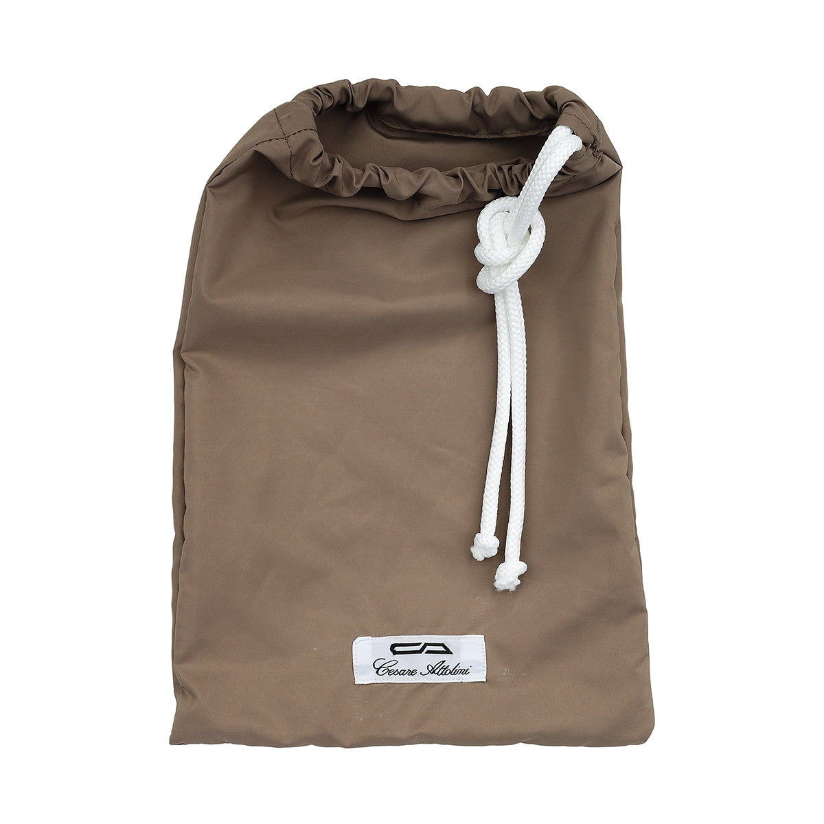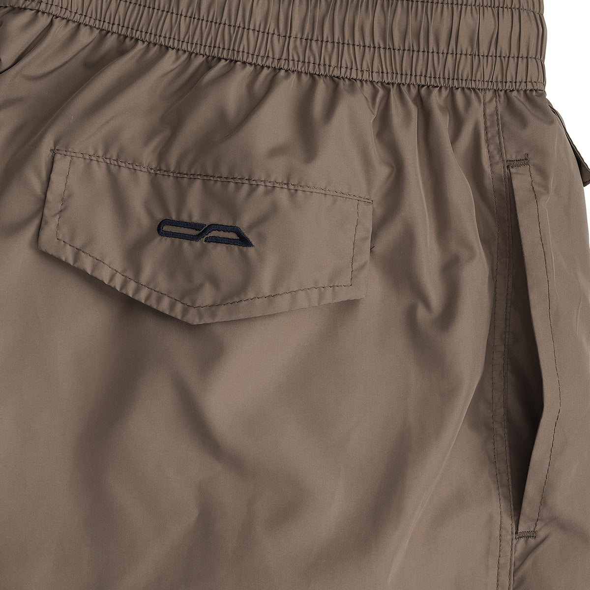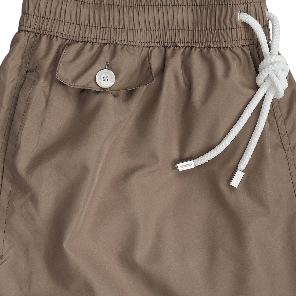 Plain beige swimming trunks with drawstring and metal cords end, 2 pockets with mini pocket and button on the front, 1 rear pocket and swimwear bag