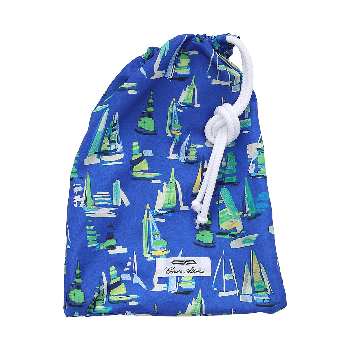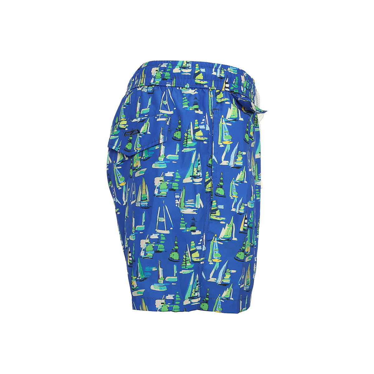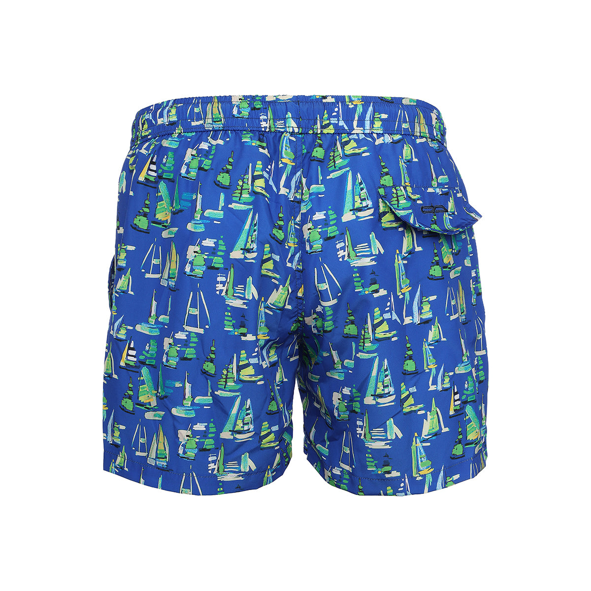 blue swimming trunks with boat design in multicolor color, drawstring and metal cords end, 2 pockets with mini pocket and button on the front, 1 rear pocket and swimwear bag