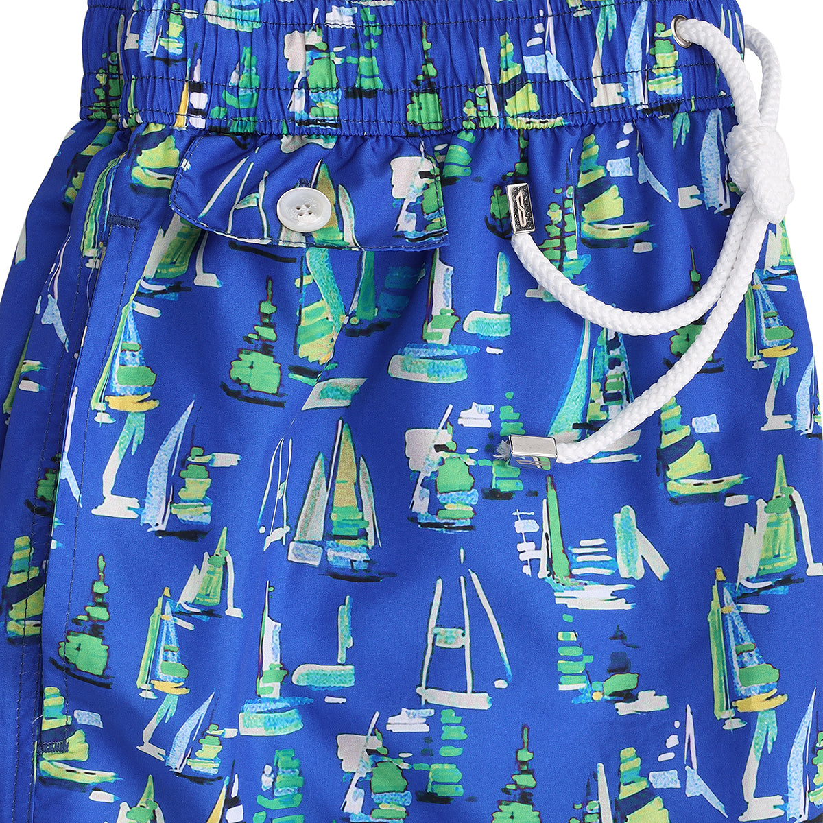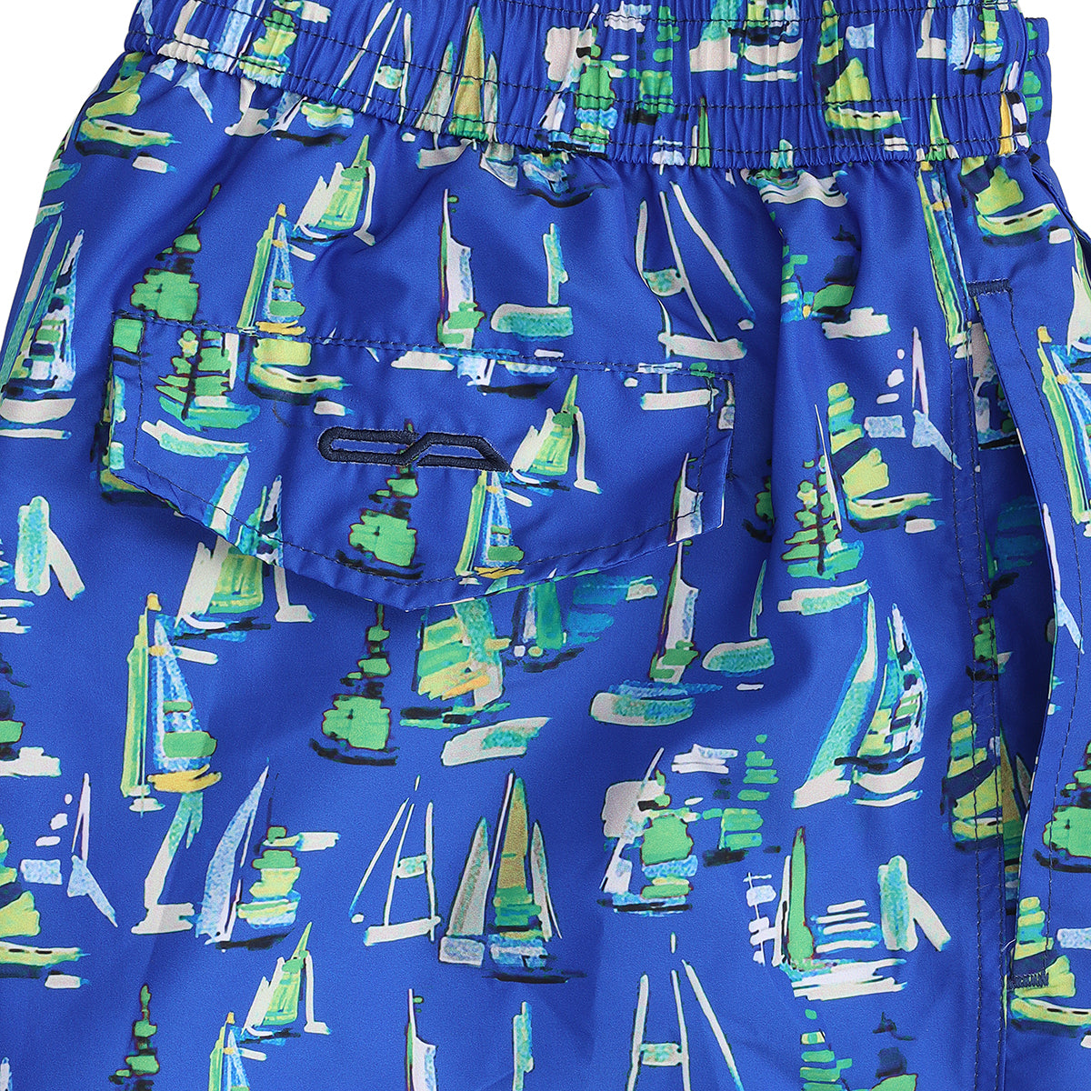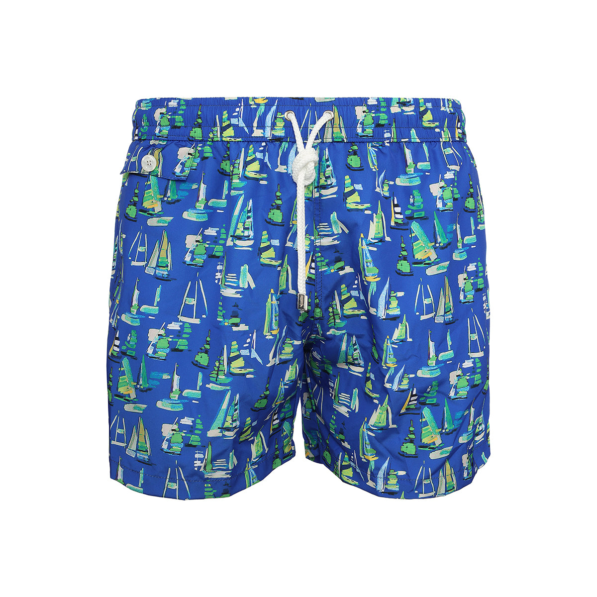 blue swimming trunks with boat design in multicolor color, drawstring and metal cords end, 2 pockets with mini pocket and button on the front, 1 rear pocket and swimwear bag