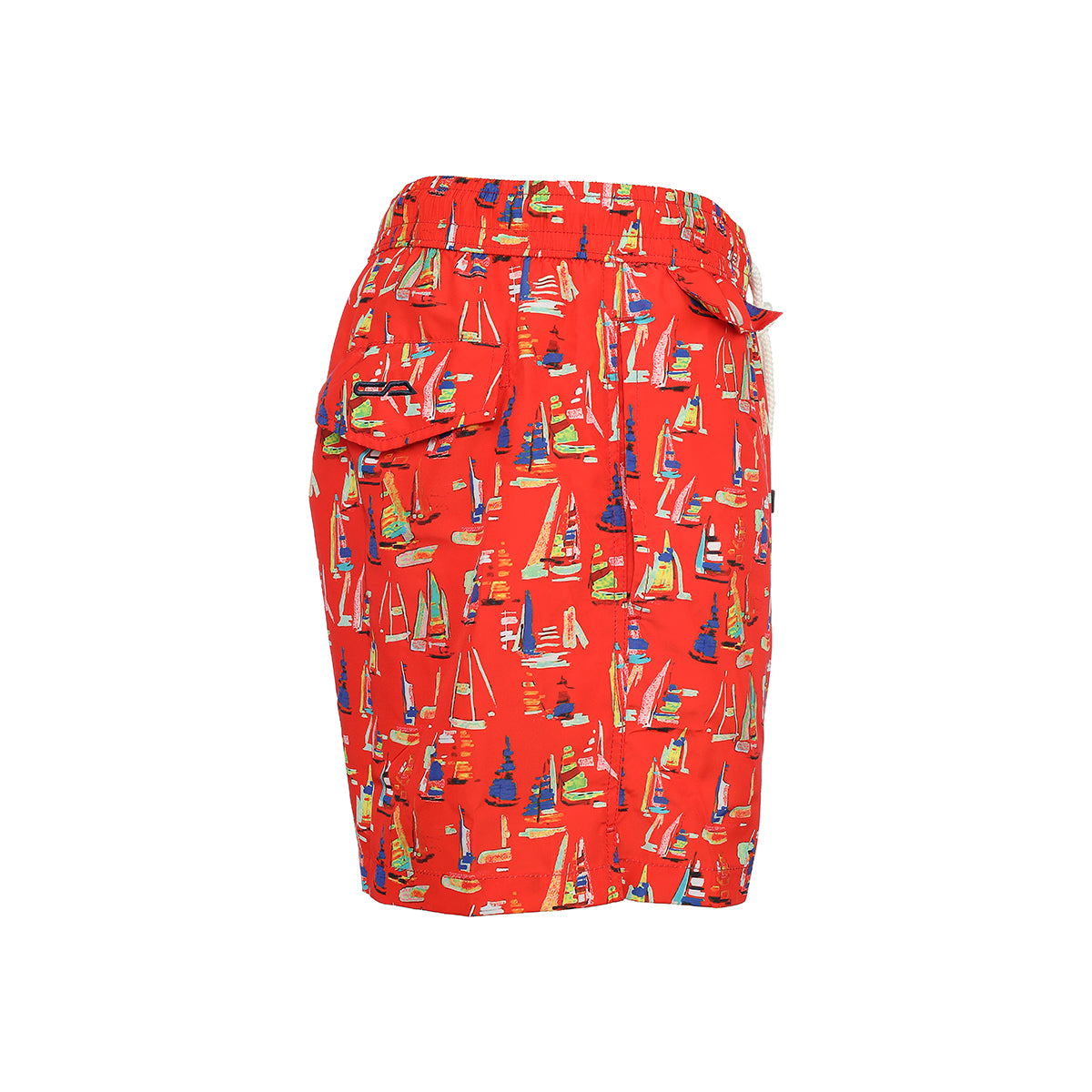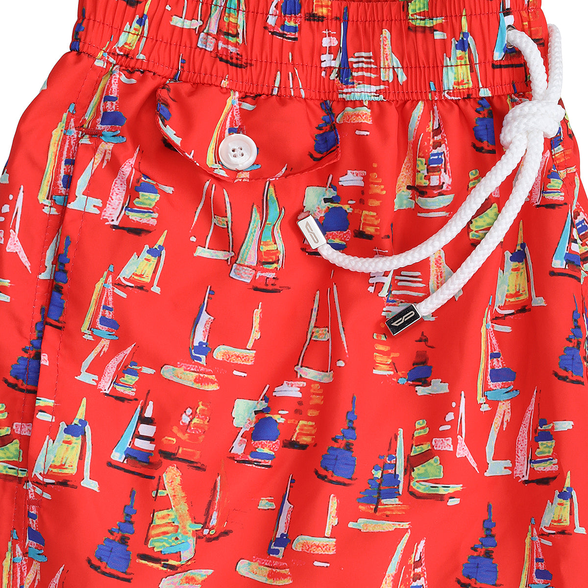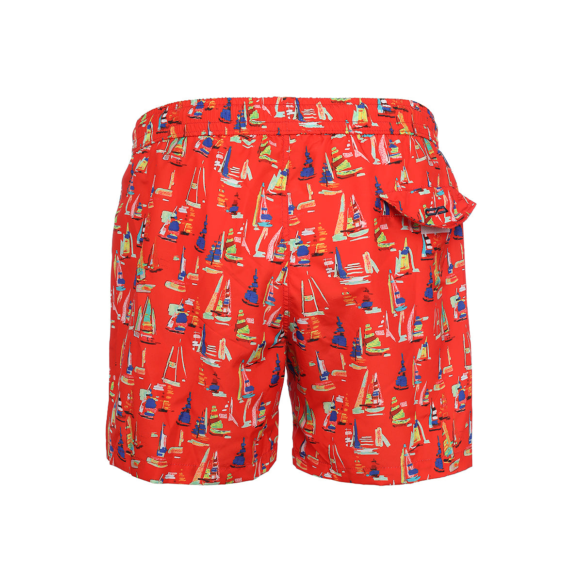 red swimming trunks with boat design in multicolor color, drawstring and metal cords end, 2 pockets with mini pocket and button on the front, 1 rear pocket and swimwear bag