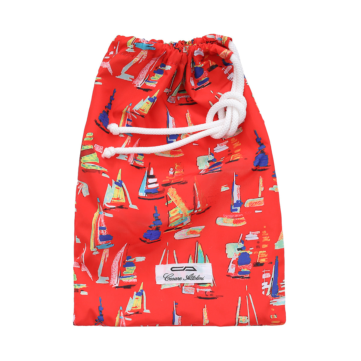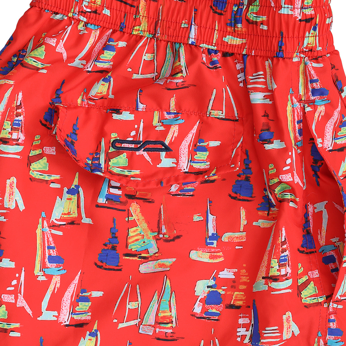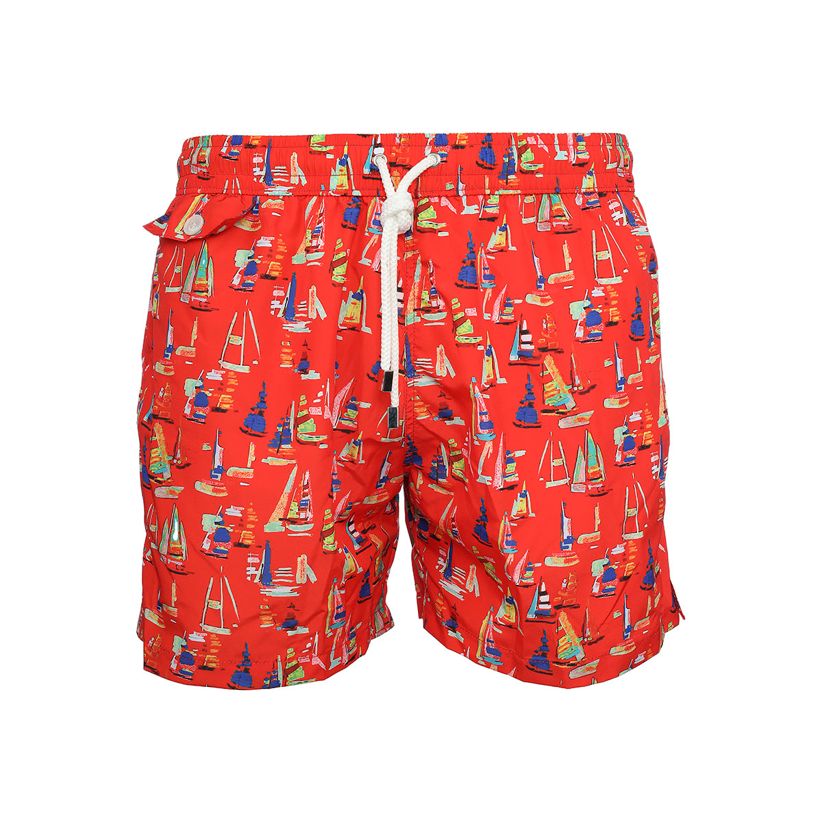 red swimming trunks with boat design in multicolor color, drawstring and metal cords end, 2 pockets with mini pocket and button on the front, 1 rear pocket and swimwear bag