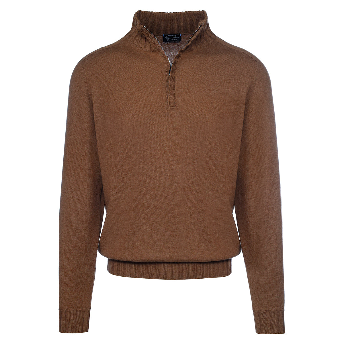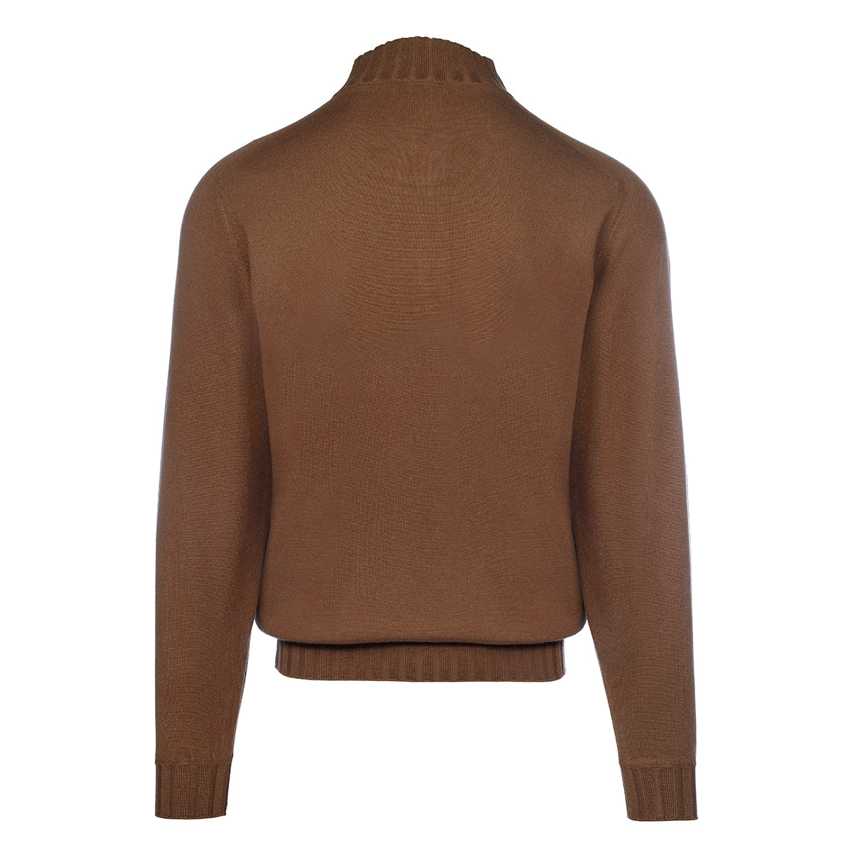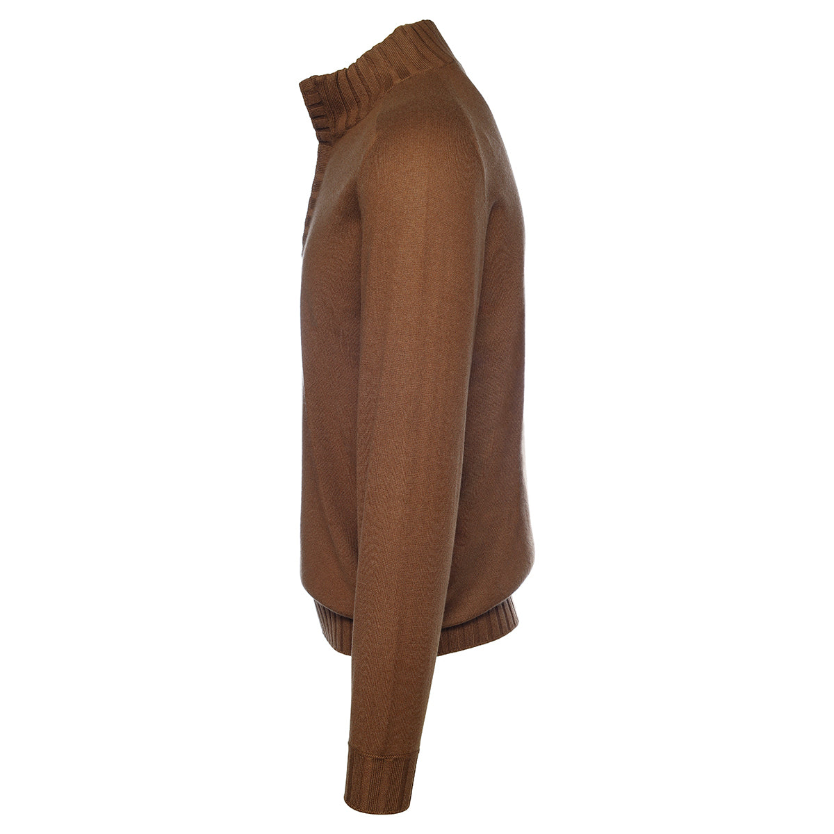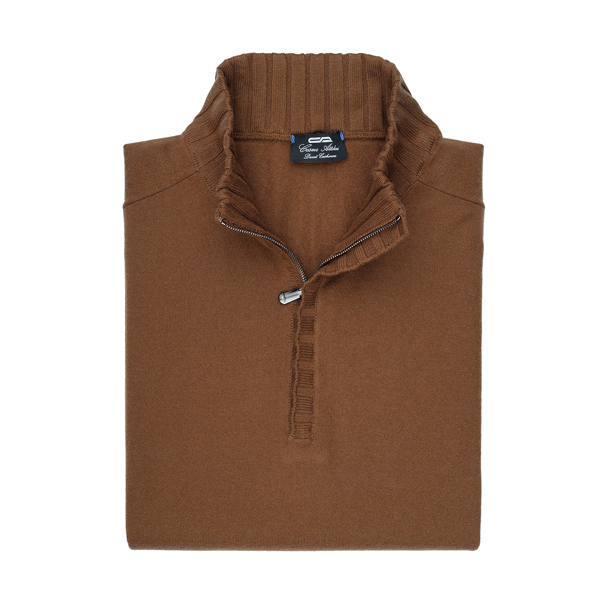 Brown zippered sweater in cashmere duvet with ribbed neck, cuffs and flounce. Made in our artisan workshop on the shores of Lake Trasimeno. The precious pure cashmere yarn and the exclusive Duvet processing make it unique.