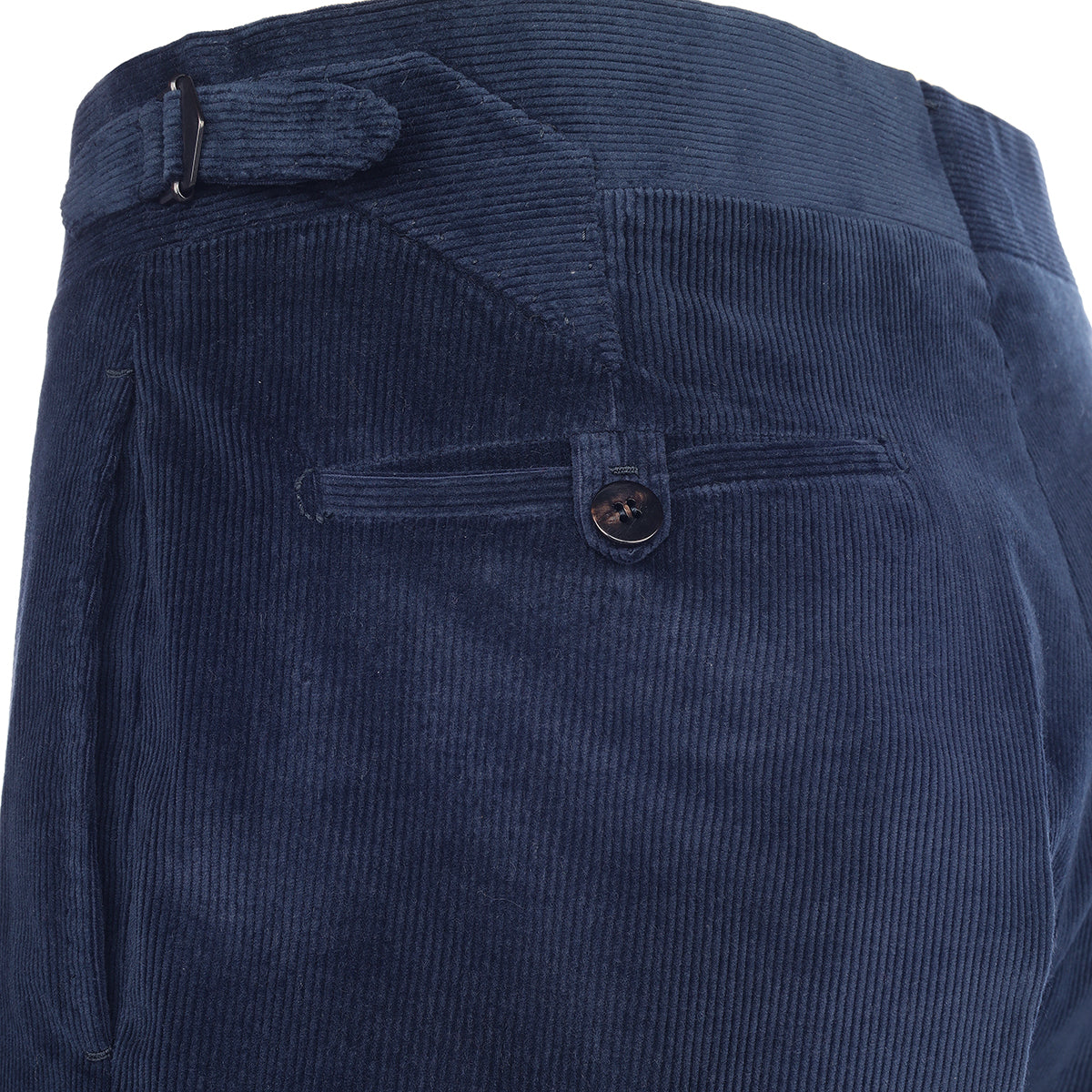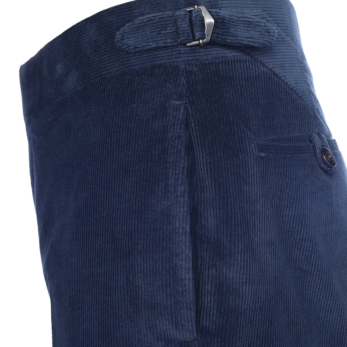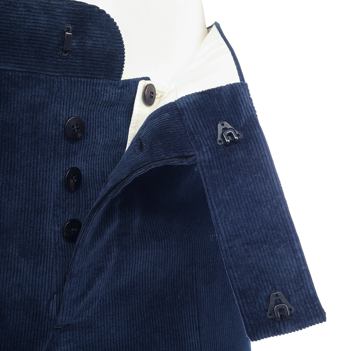 Plain avion blue corduroy pants without pleats. Seam pockets, buttons and waistband, extended strap without belt loops, one pocket with flap on the front and two back pockets with frogs. Entirely cut and hand-sewn in Casalnuovo, by our master craftsmen. This garment is ideal for completing a sporty or leisure outfit with style and elegance.