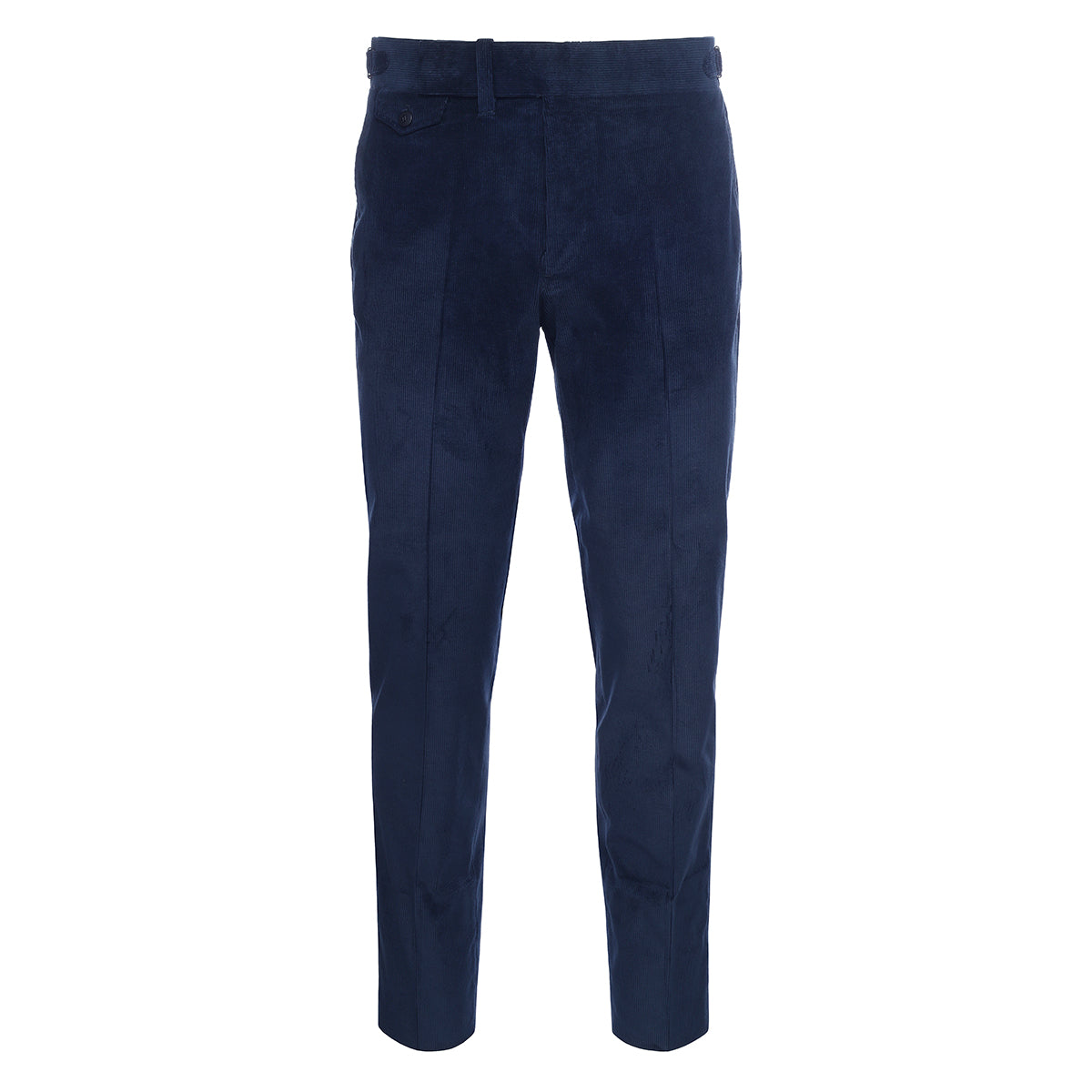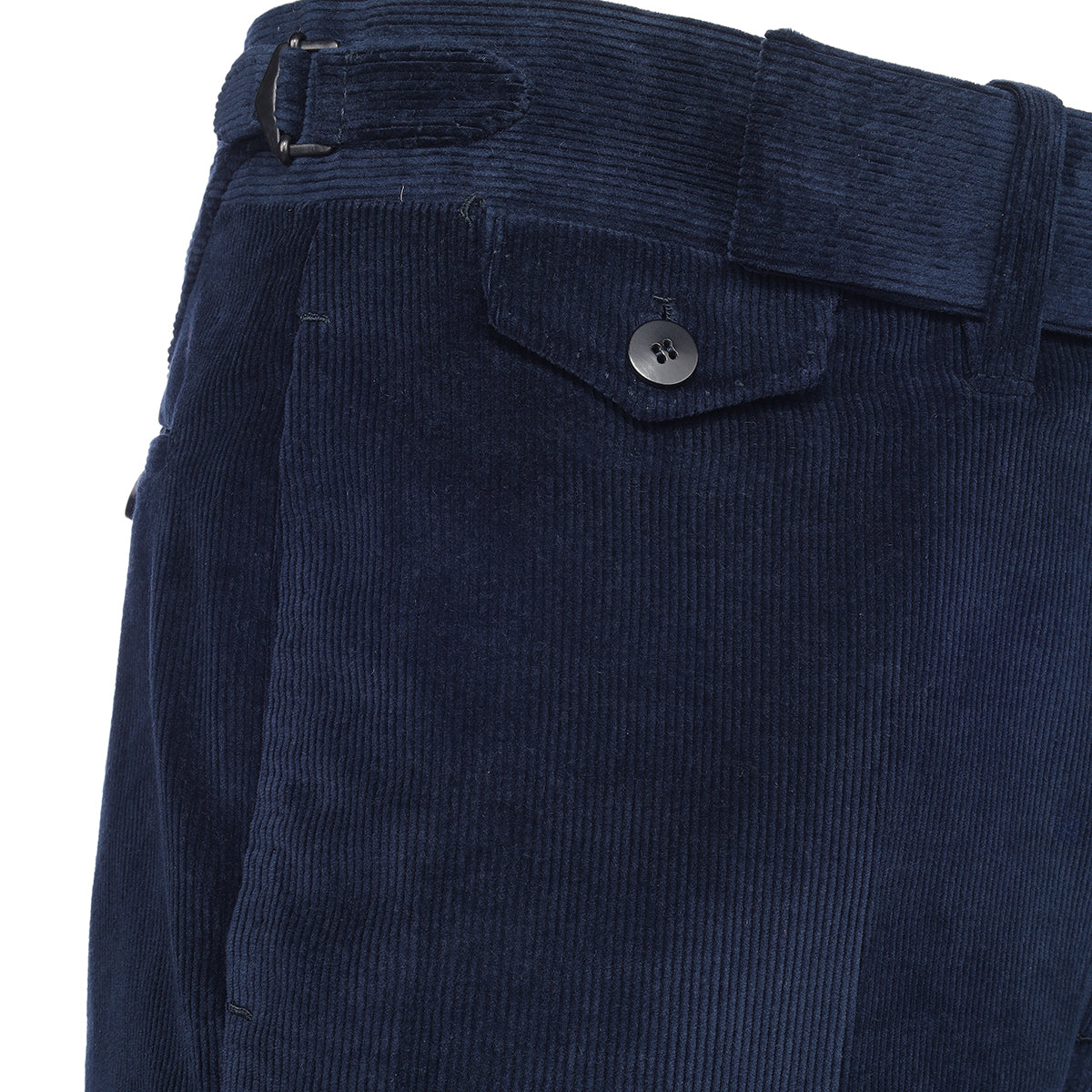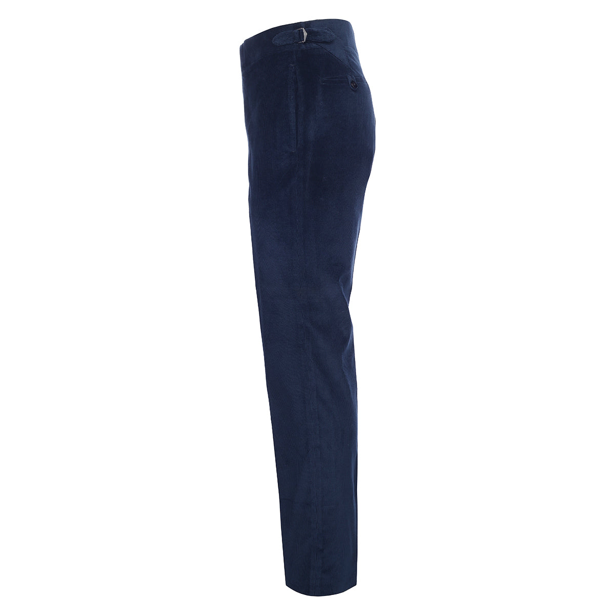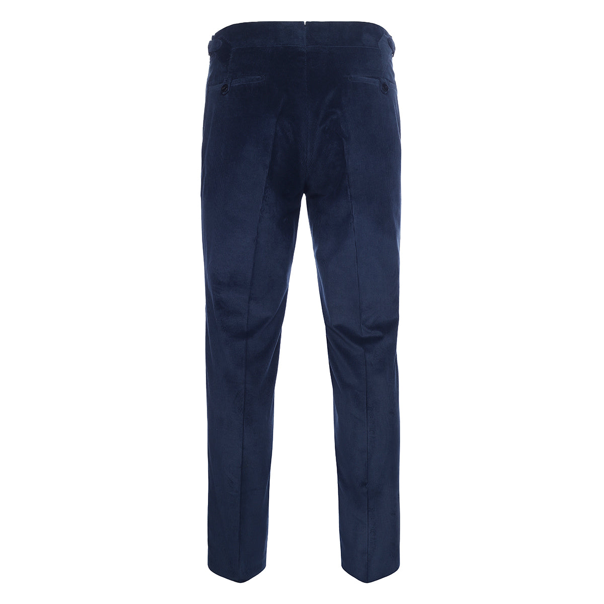 Plain avion blue corduroy pants without pleats. Seam pockets, buttons and waistband, extended strap without belt loops, one pocket with flap on the front and two back pockets with frogs. Entirely cut and hand-sewn in Casalnuovo, by our master craftsmen. This garment is ideal for completing a sporty or leisure outfit with style and elegance.