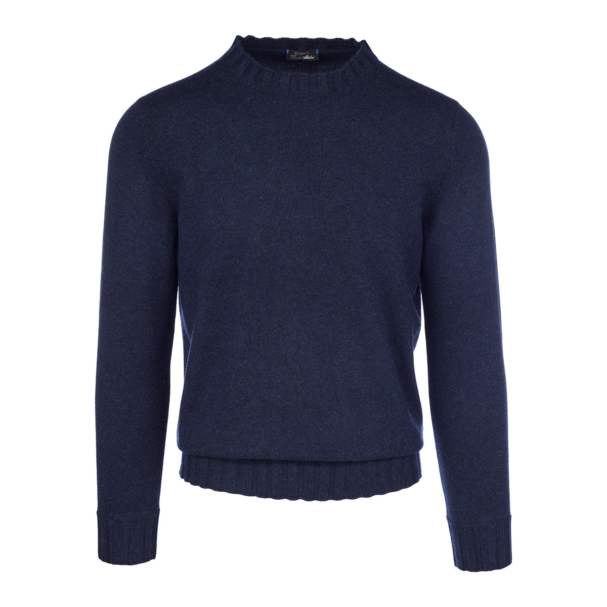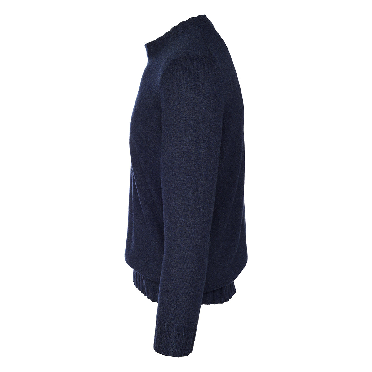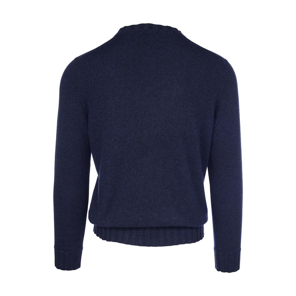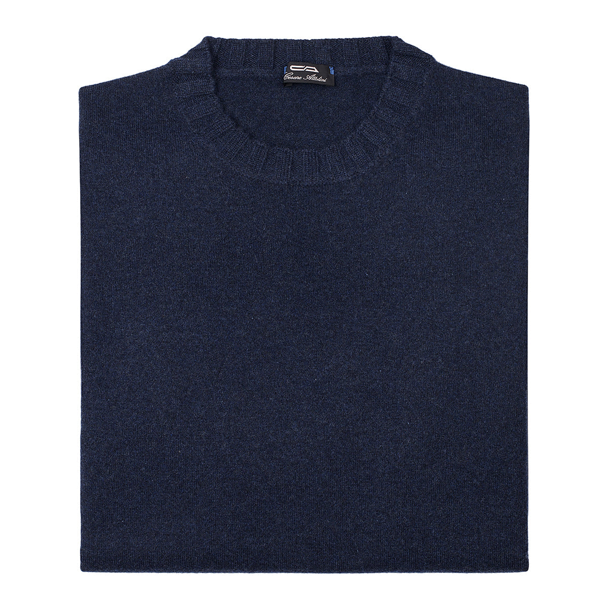 Blue cashmere duvet crewneck with ribbed neck, cuffs and flounce. This garment is made in our artisan workshop on the shores of Lake Trasimeno. The precious pure cashmere yarn and the exclusive Duvet processing make our garment unique.