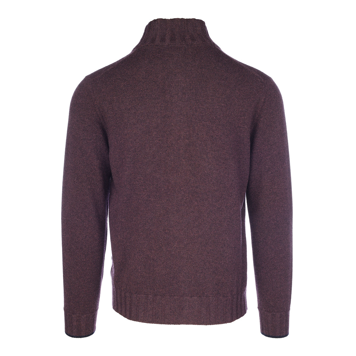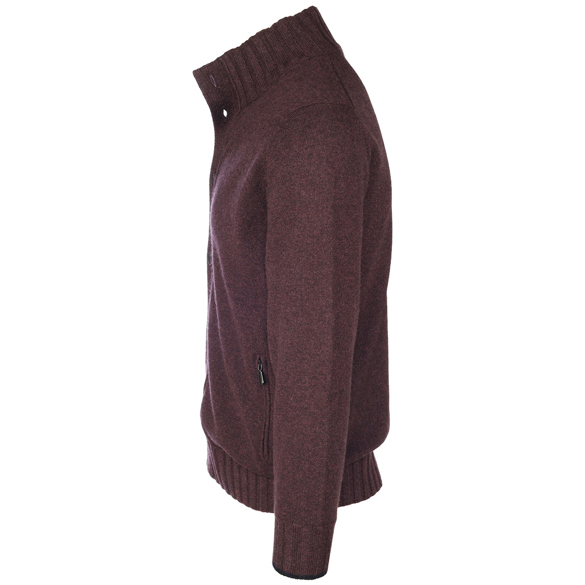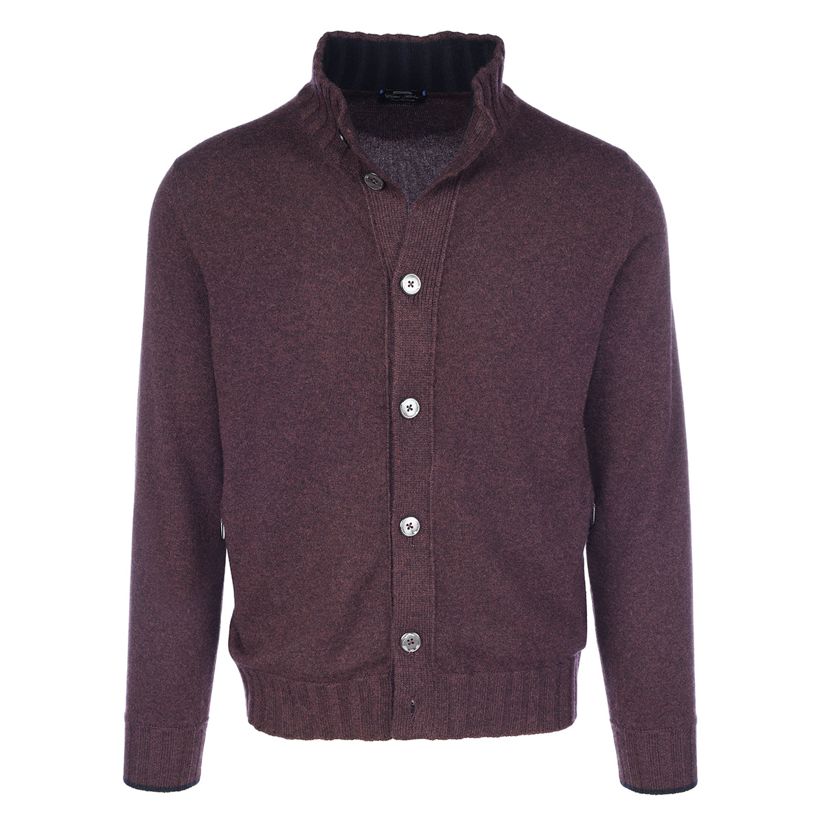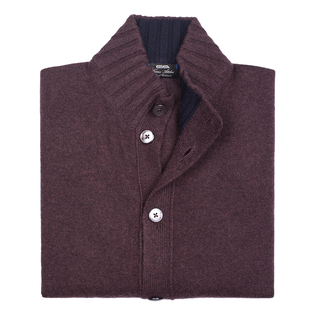 Cardigan with buttons in cashmere duvet with two zipped pockets in plum color. Ribbed cuffs and flounce inside collar in blue contrast. This garment is made in our artisan workshop on the shores of Lake Trasimeno. The precious pure cashmere yarn and the exclusive Duvet processing make our garment unique.