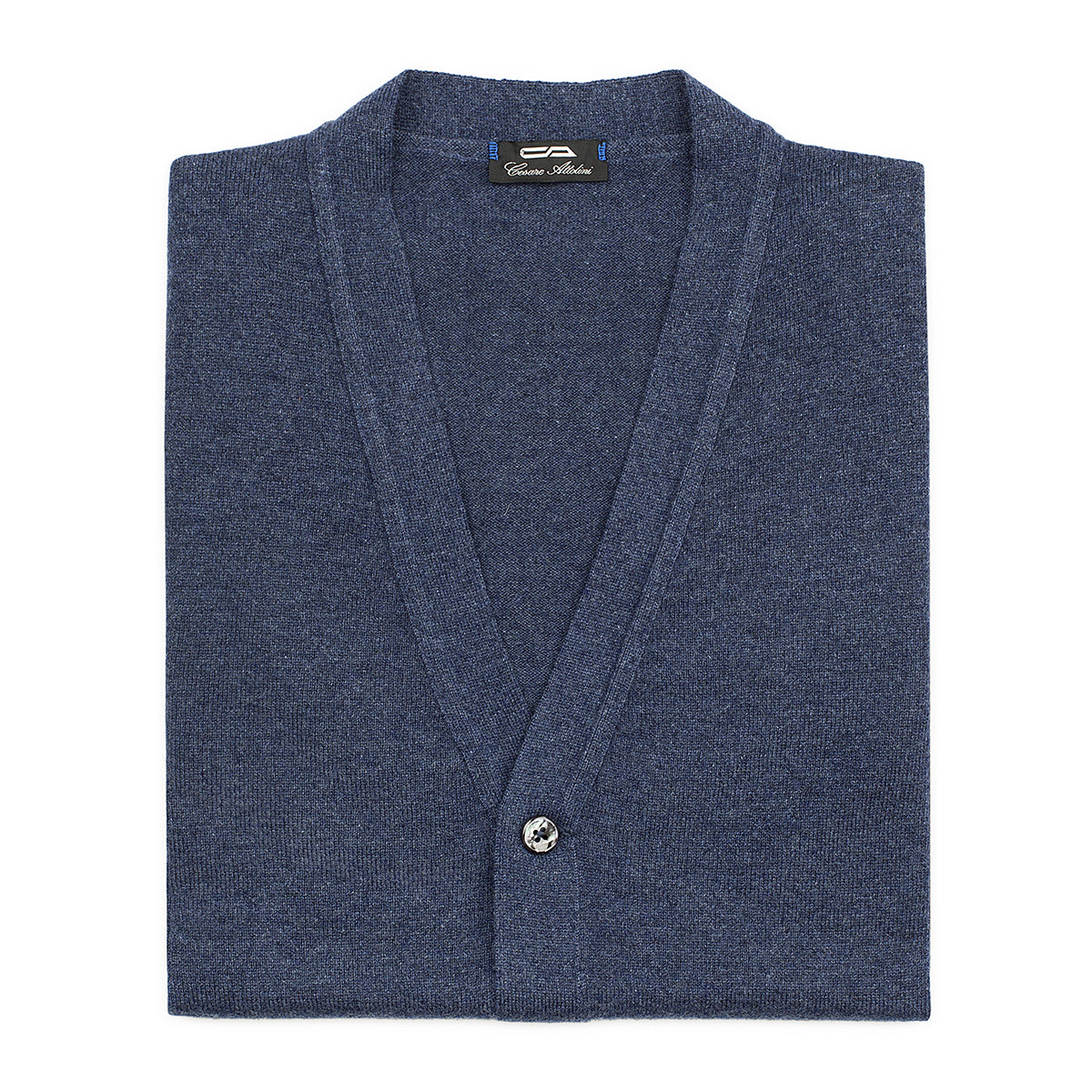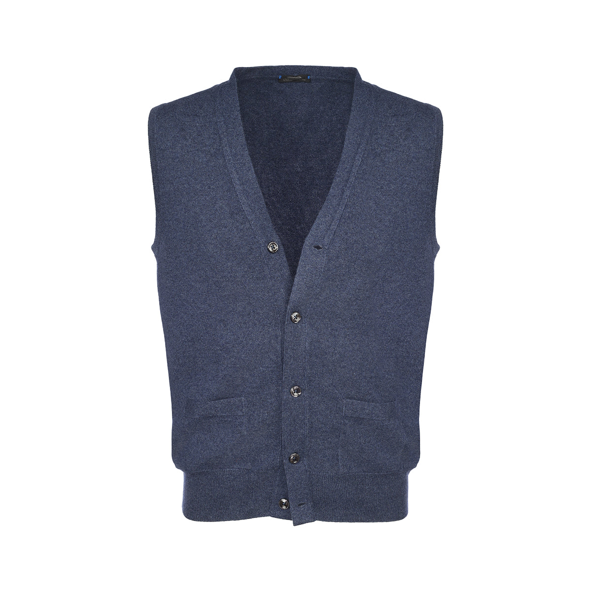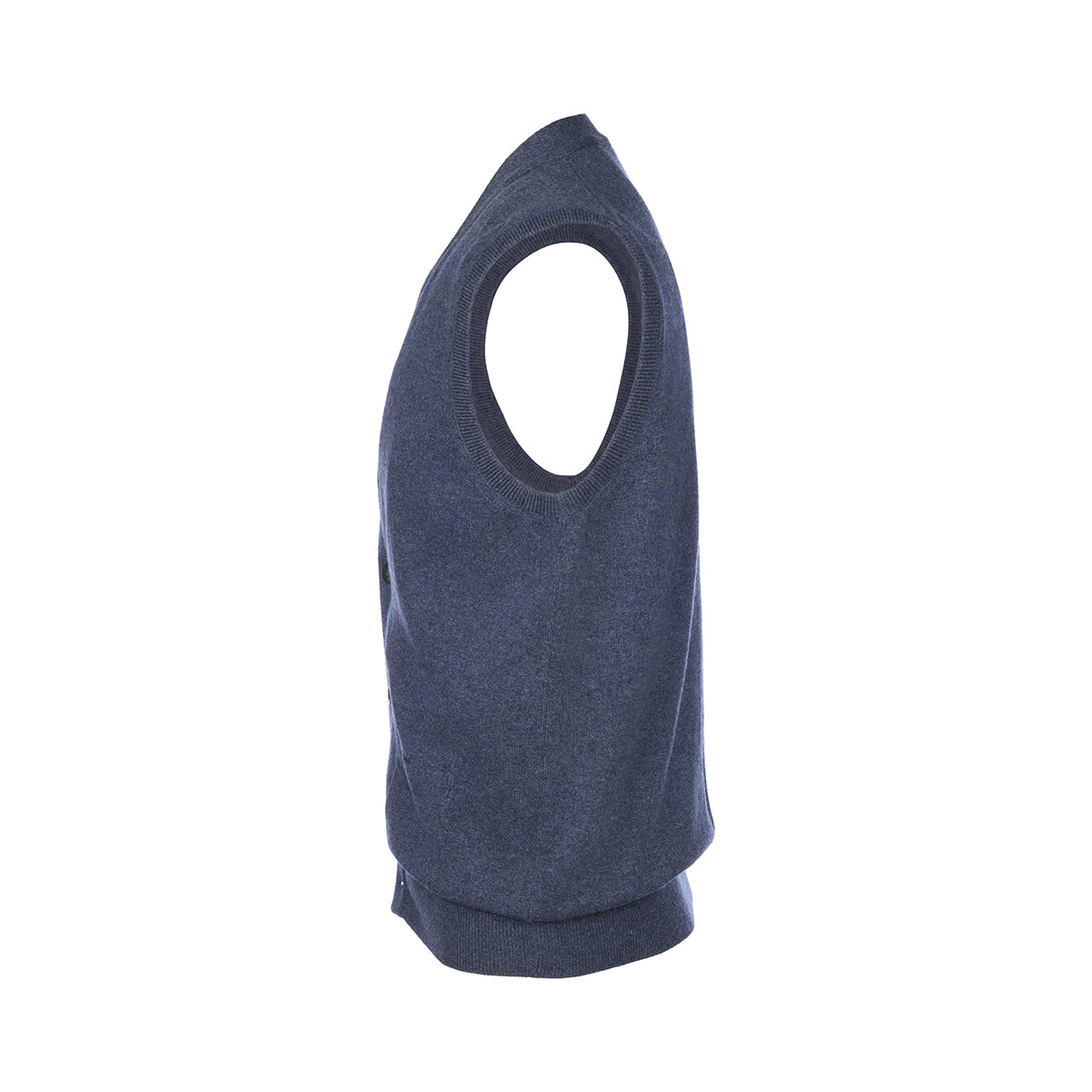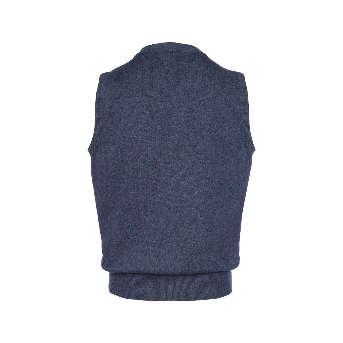 Chalkboard blue cashmere waistcoat with buttons and two pockets. This garment is made in our artisan workshop on the shores of Lake Trasimeno. Perfect as a classic under-jacket.