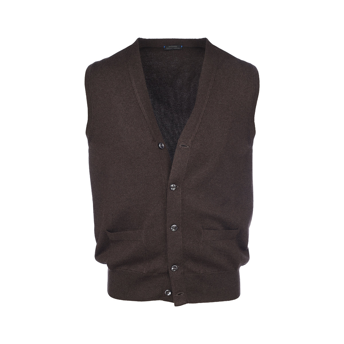 Brown cashmere waistcoat with buttons and two pockets. This garment is made in our artisan workshop on the shores of Lake Trasimeno. Perfect as a classic under-jacket.