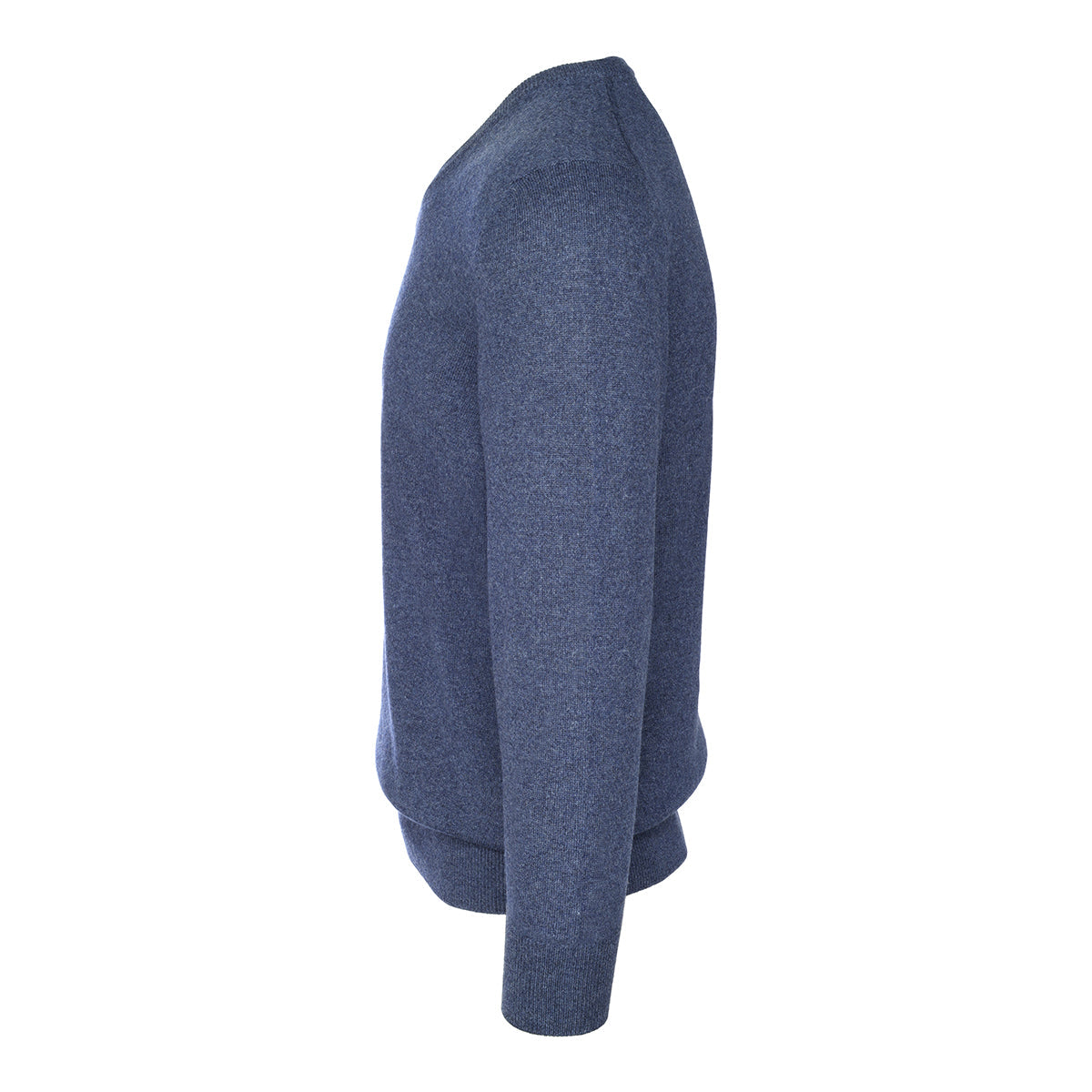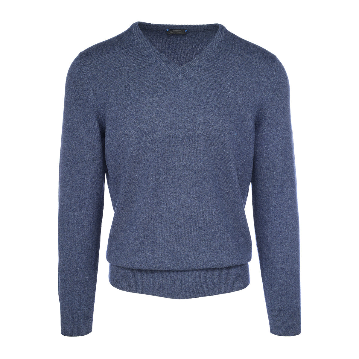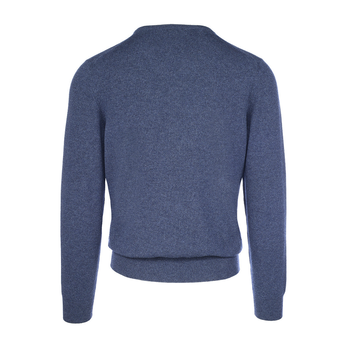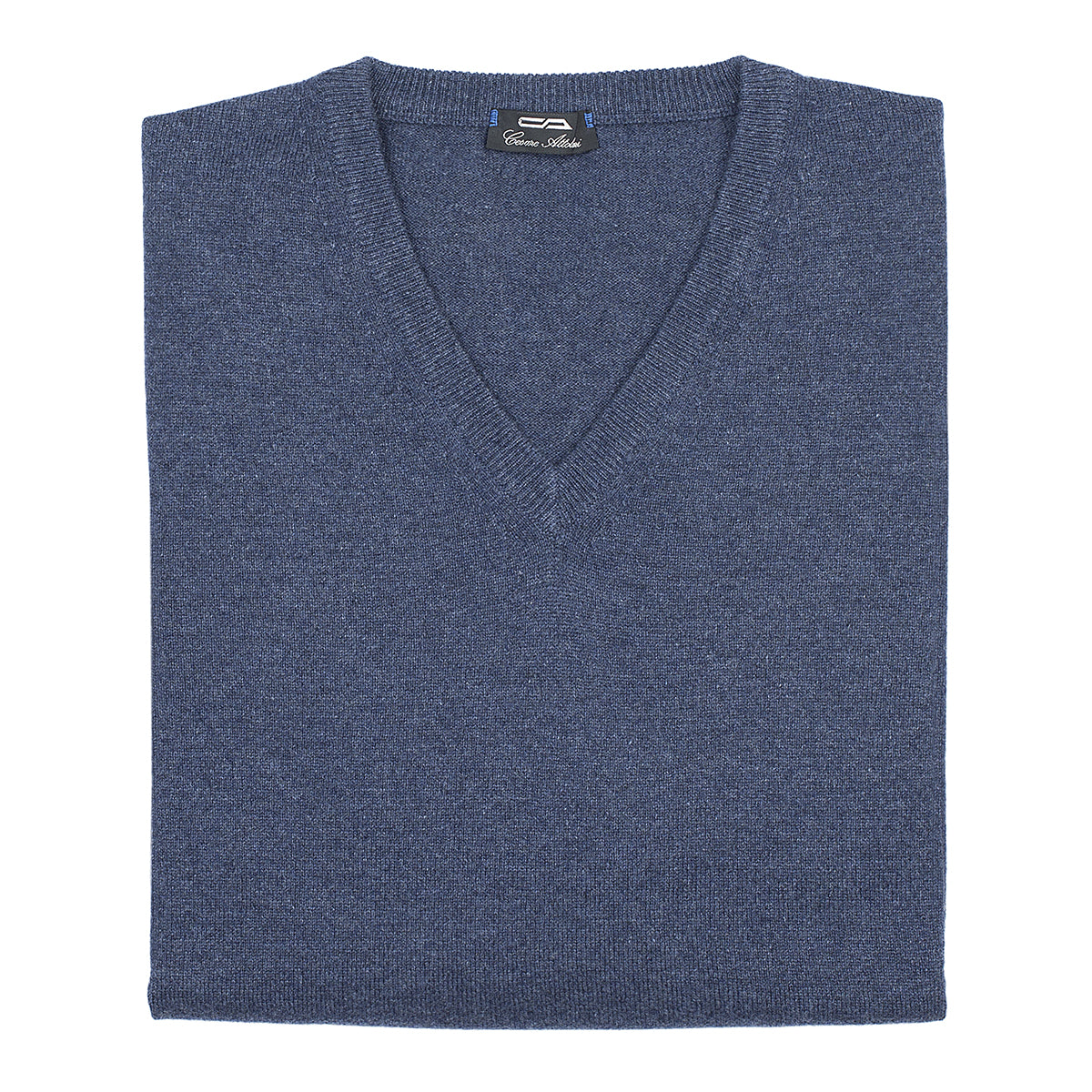 Avion blue V-neck cashmere with ribbed cuffs and flounce. This garment is made in our artisan workshop on the shores of Lake Trasimeno. The precious pure cashmere yarn makes our garment unique.