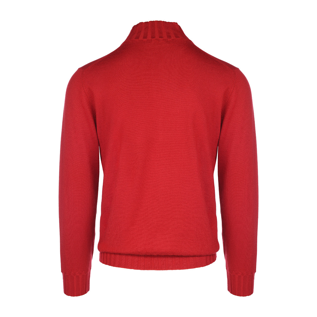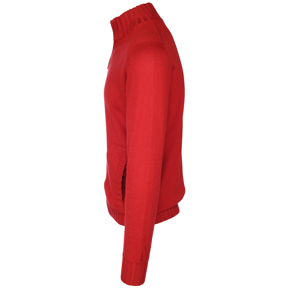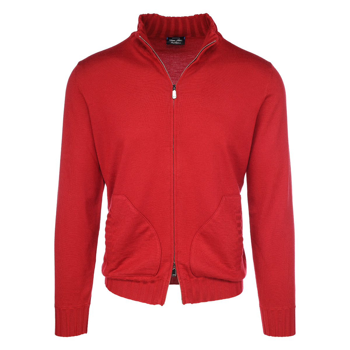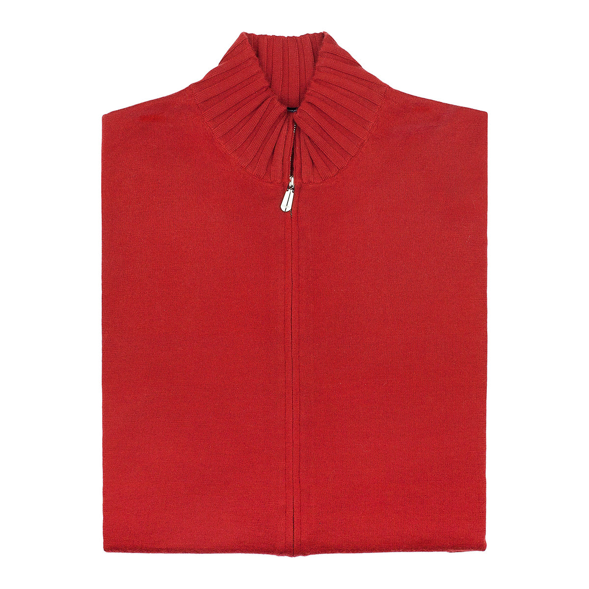 Duvet red cashmere cardigan with double slider zip. Two pockets with ribbed neck, cuffs and flounce. This garment is made in our artisan workshop on the shores of Lake Trasimeno. The precious pure worsted cashmere yarn makes it a unique garment. Ideal for creating a leisure look and ensuring comfort.