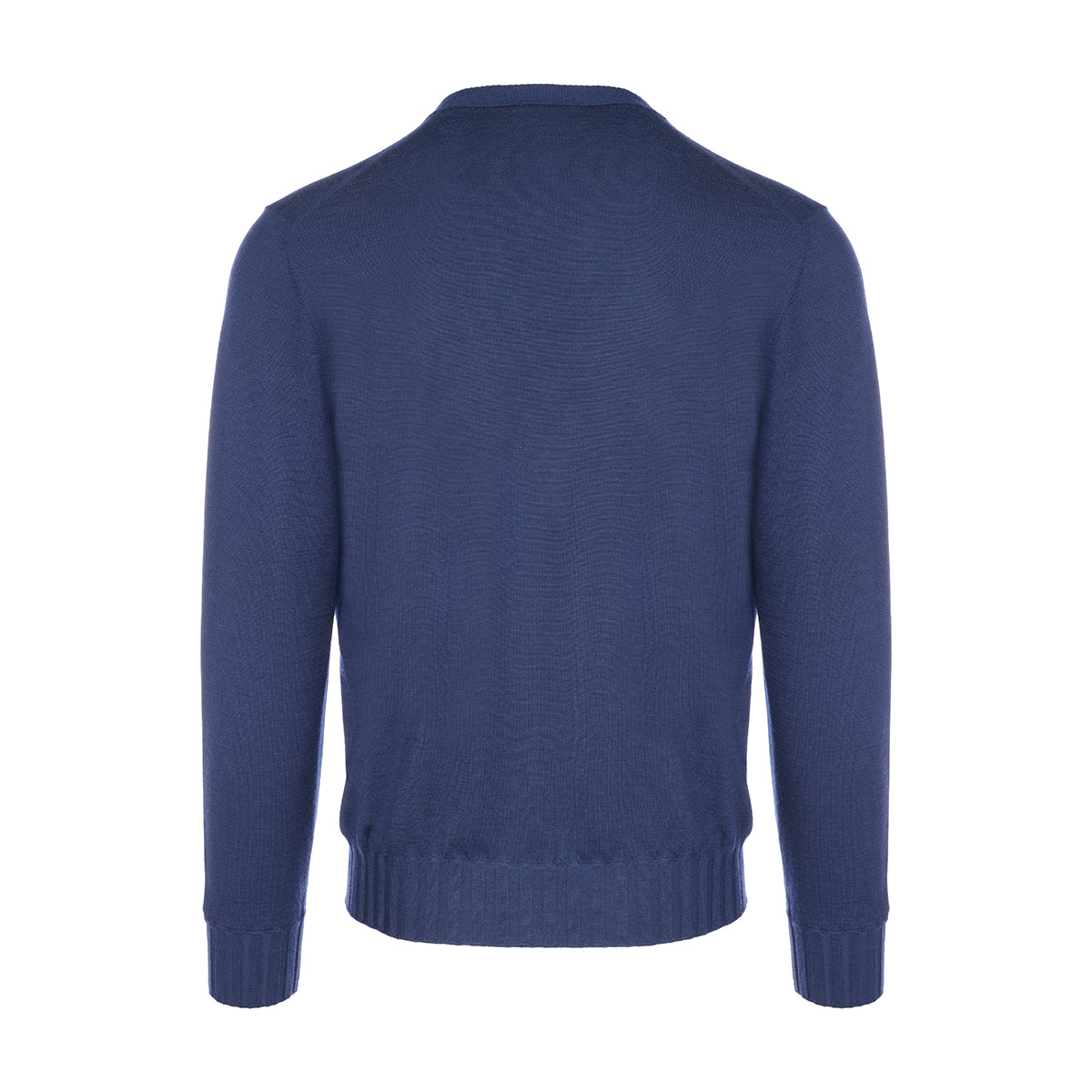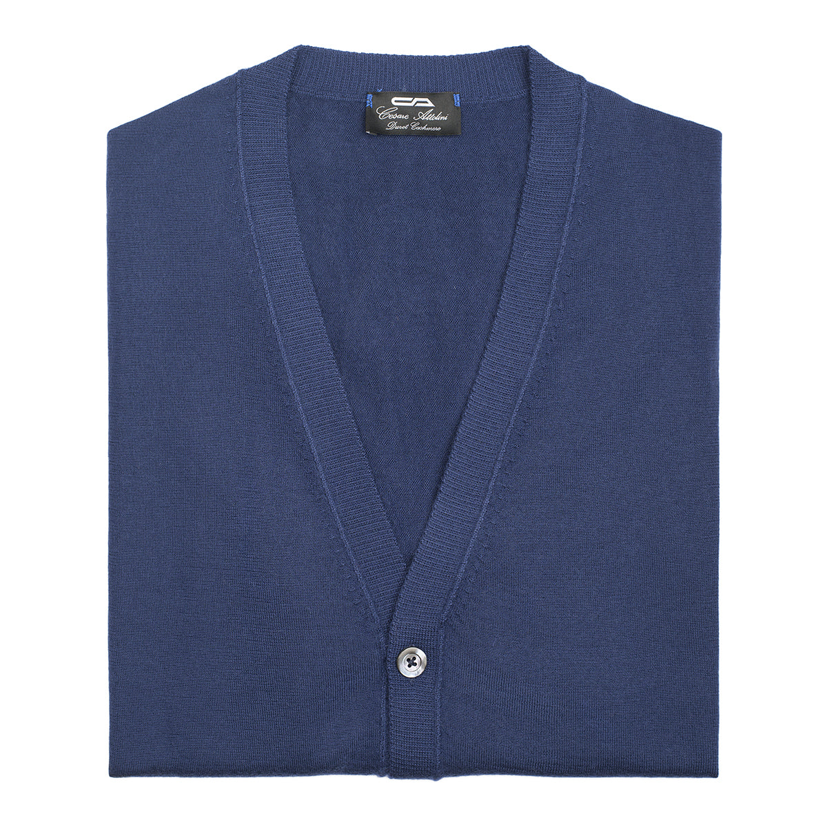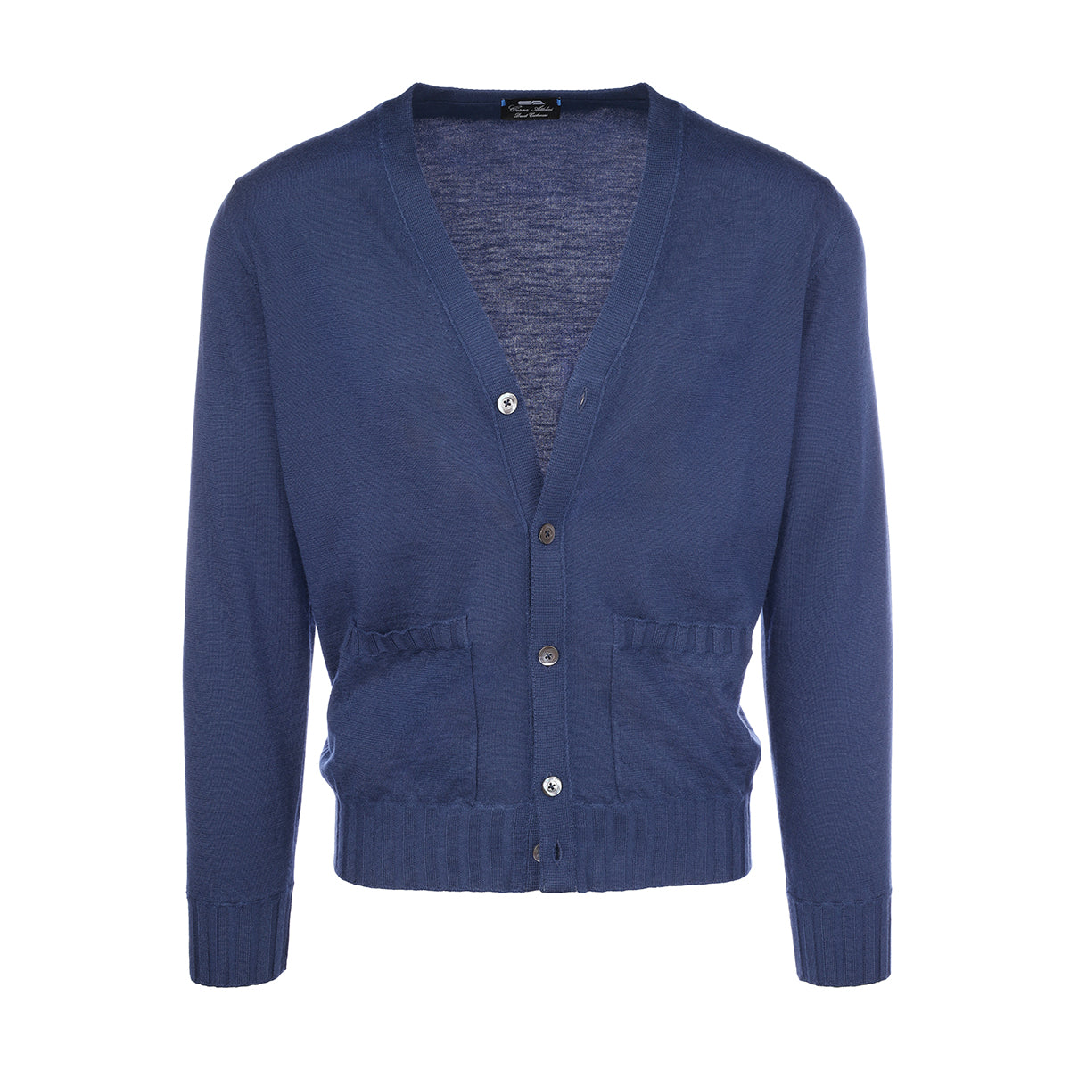 Royal blue cardigan in cashmere duvet with buttons. Two pockets, with ribbed cuffs and flounce. This garment is made in our artisan workshop on the shores of Lake Trasimeno. The precious pure cashmere yarn and the exclusive Duvet manufacturing make it unique.