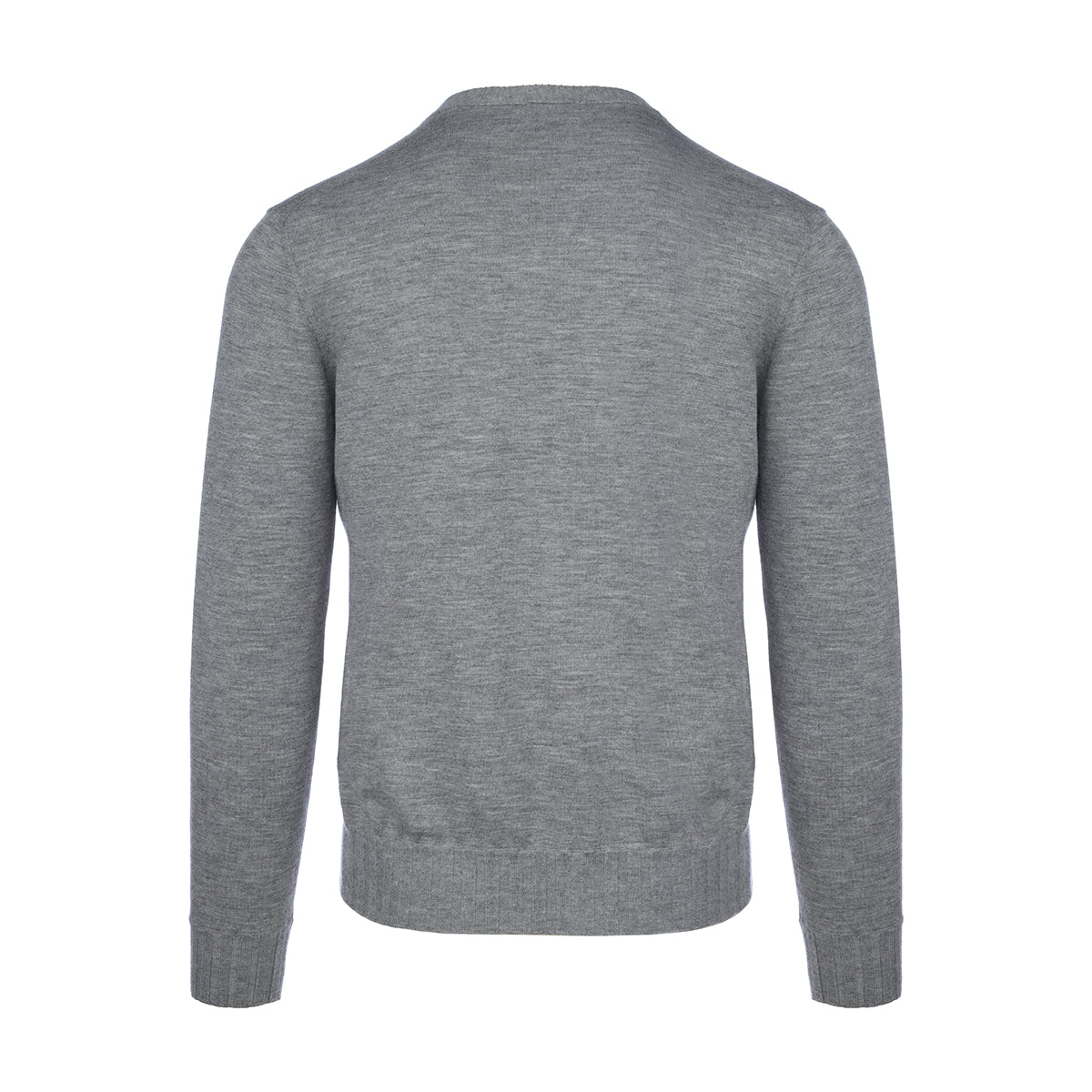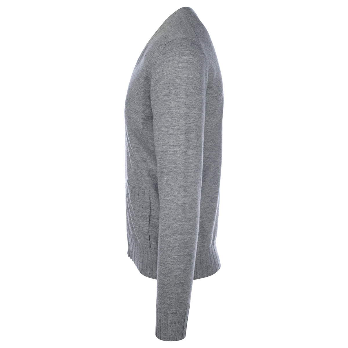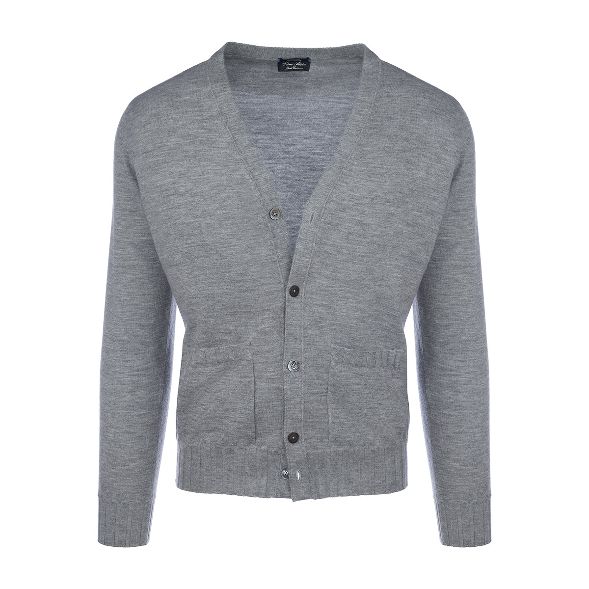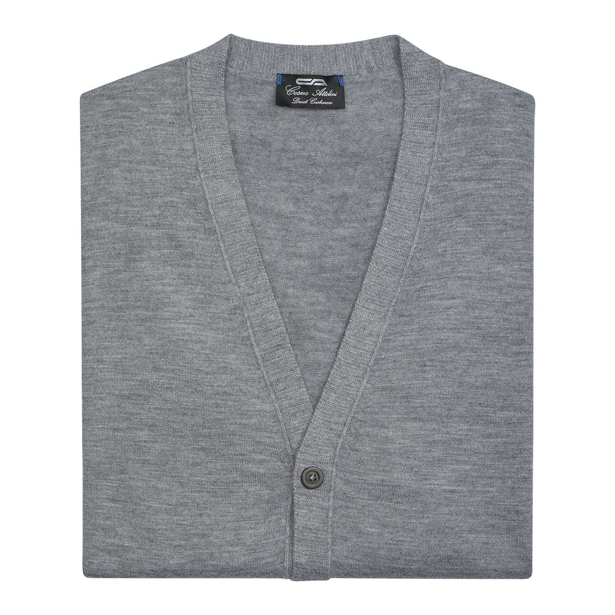 Light gray cardigan in cashmere duvet with buttons. Two pockets, ribbed cuffs and flounce. Made in our artisan workshop on the shores of Lake Trasimeno. The precious pure cashmere yarn and the exclusive Duvet manufacturing make it unique.