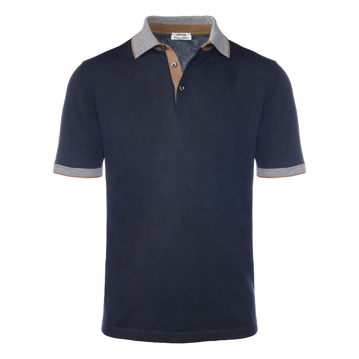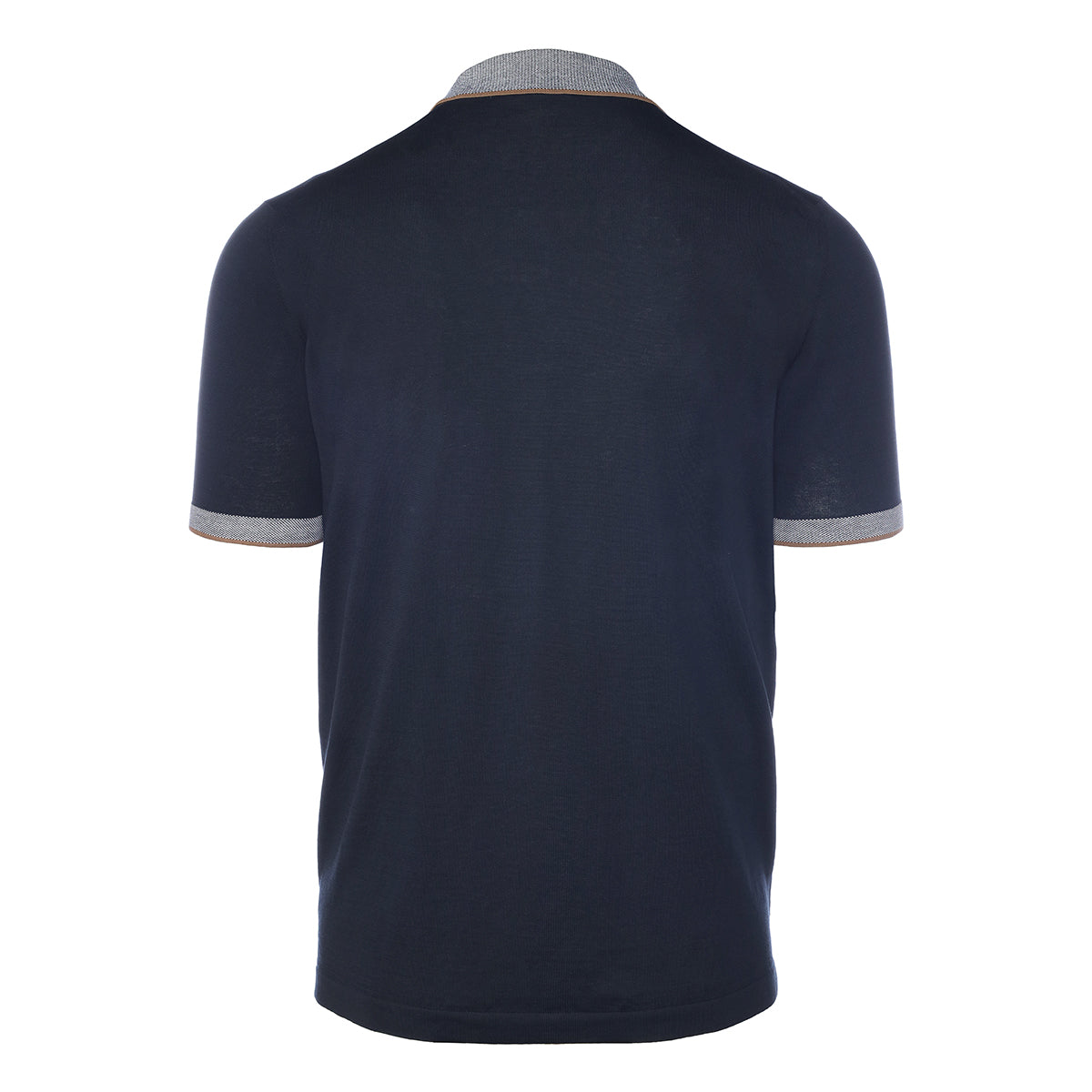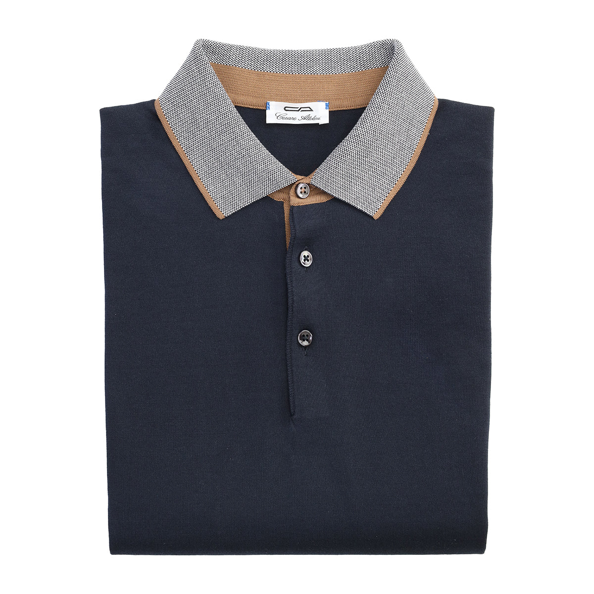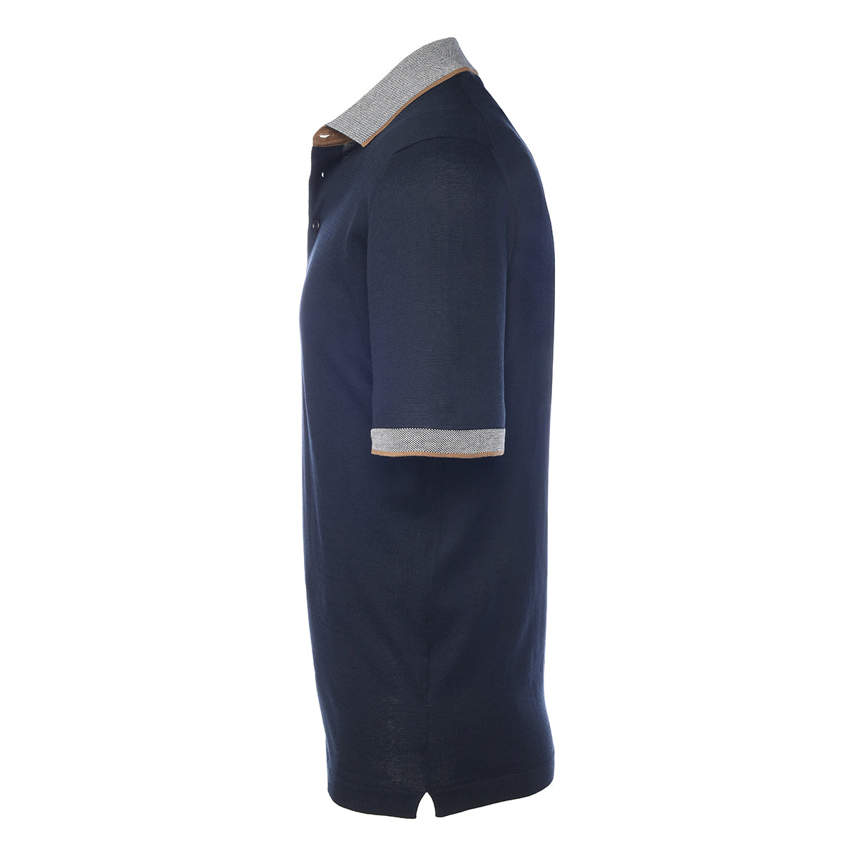 Blue cotton polo shirt, 3 buttons, with blue contrasting edge and brown trim at the collar and sleeves, tubular bottom with side vents. This t-shirt is made in our artisan workshop on the shores of Lake Trasimeno. The precious fine cotton yarn makes our garment very light and fresh. It is ideal for a free time look, to be worn during the summer.