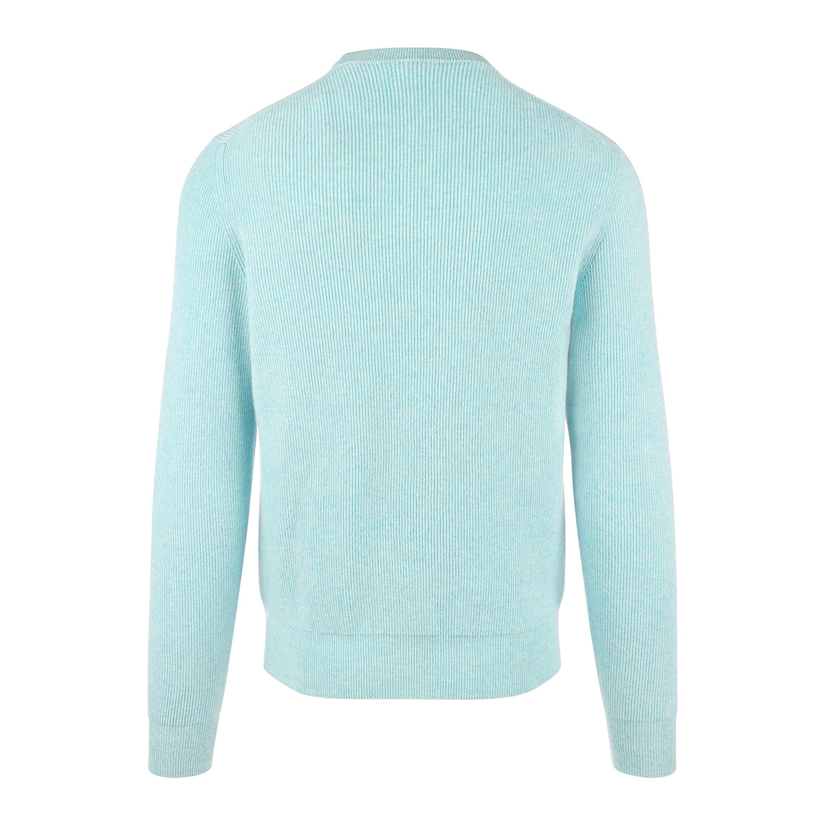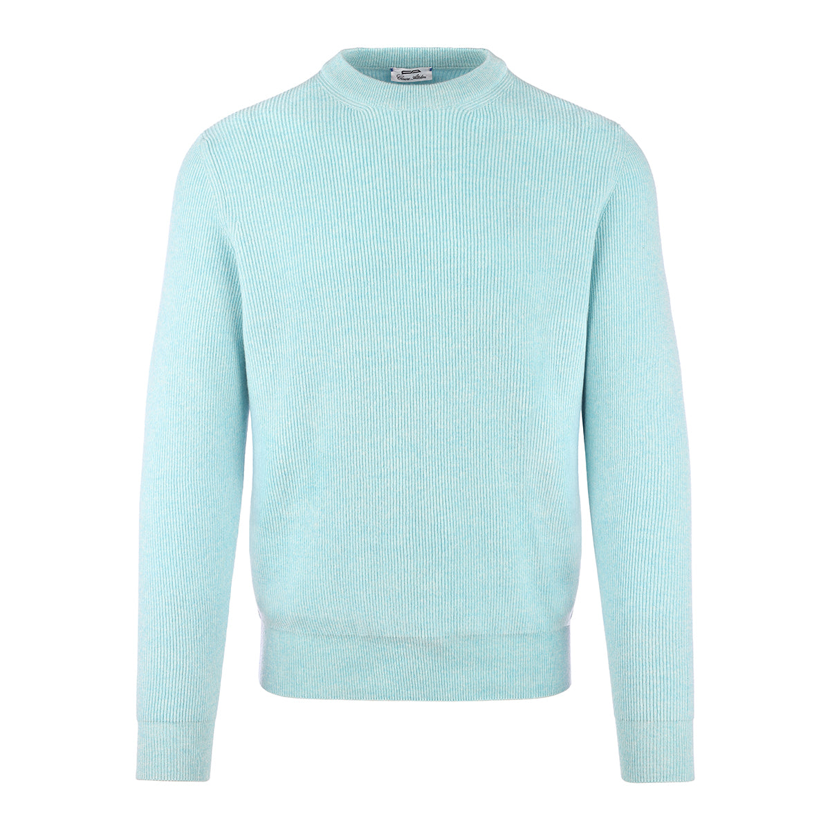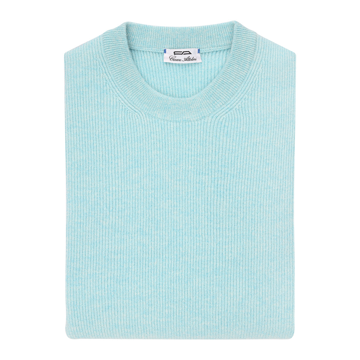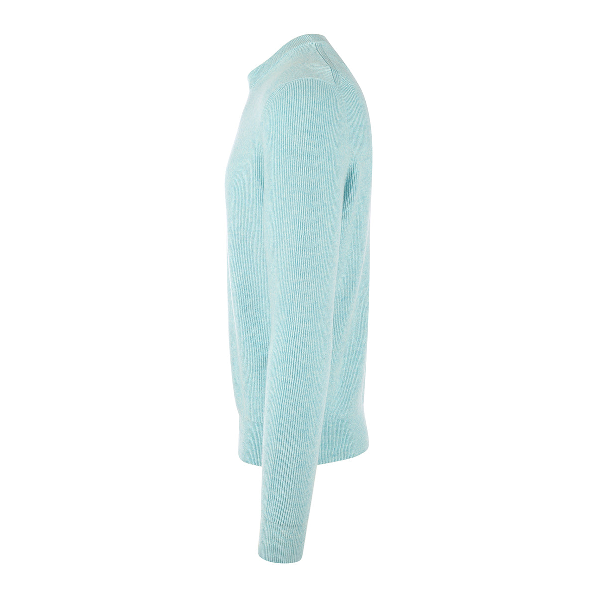 Crewneck sweater, 12-gauge, crafted from fine cashmere, featuring an elegant aquamarine color. The fine and soft knit gives the garment exceptional lightness and comfort. Its essential design enhances the quality of the yarn, making it a versatile and refined piece. This garment is made in our artisanal workshop on the shores of Lake Trasimeno.