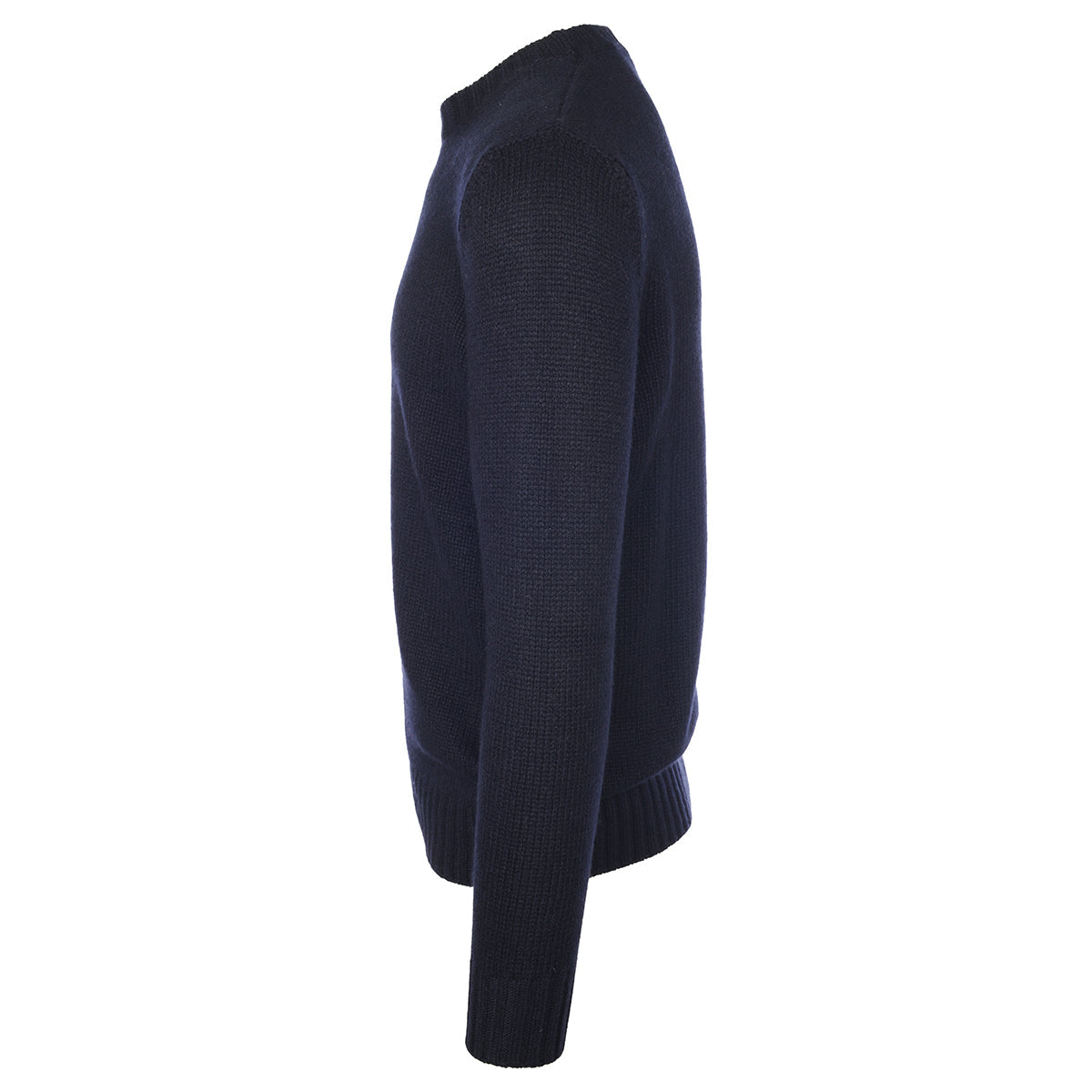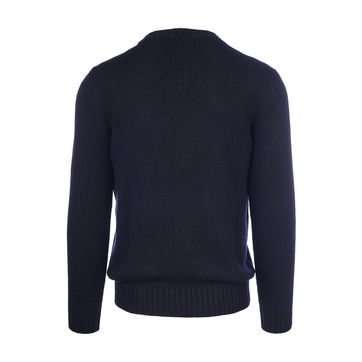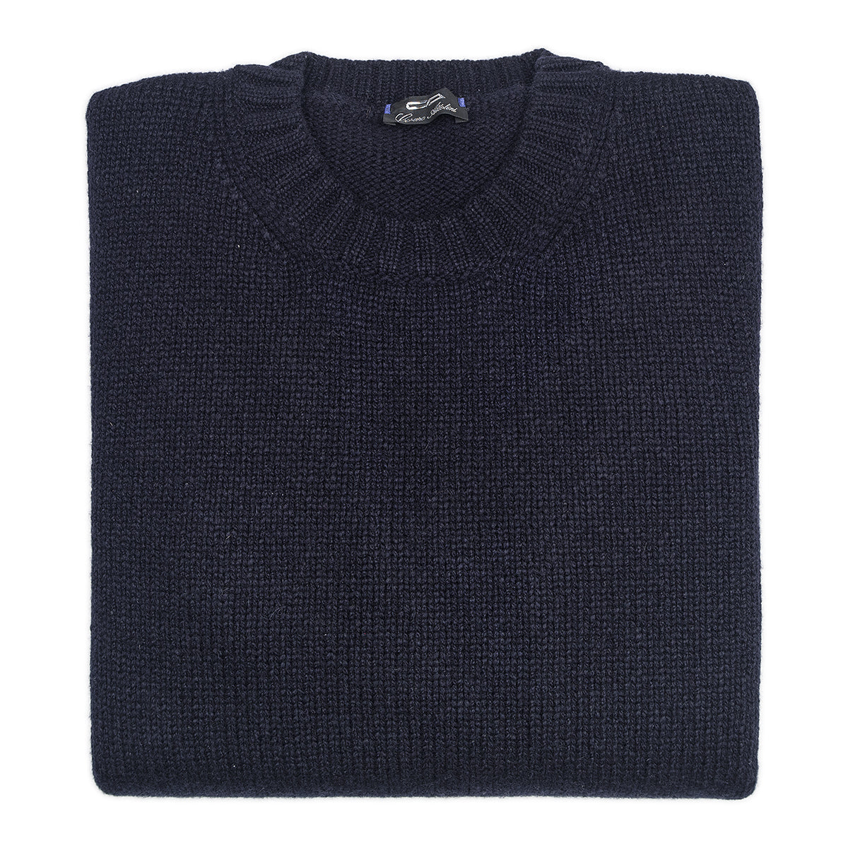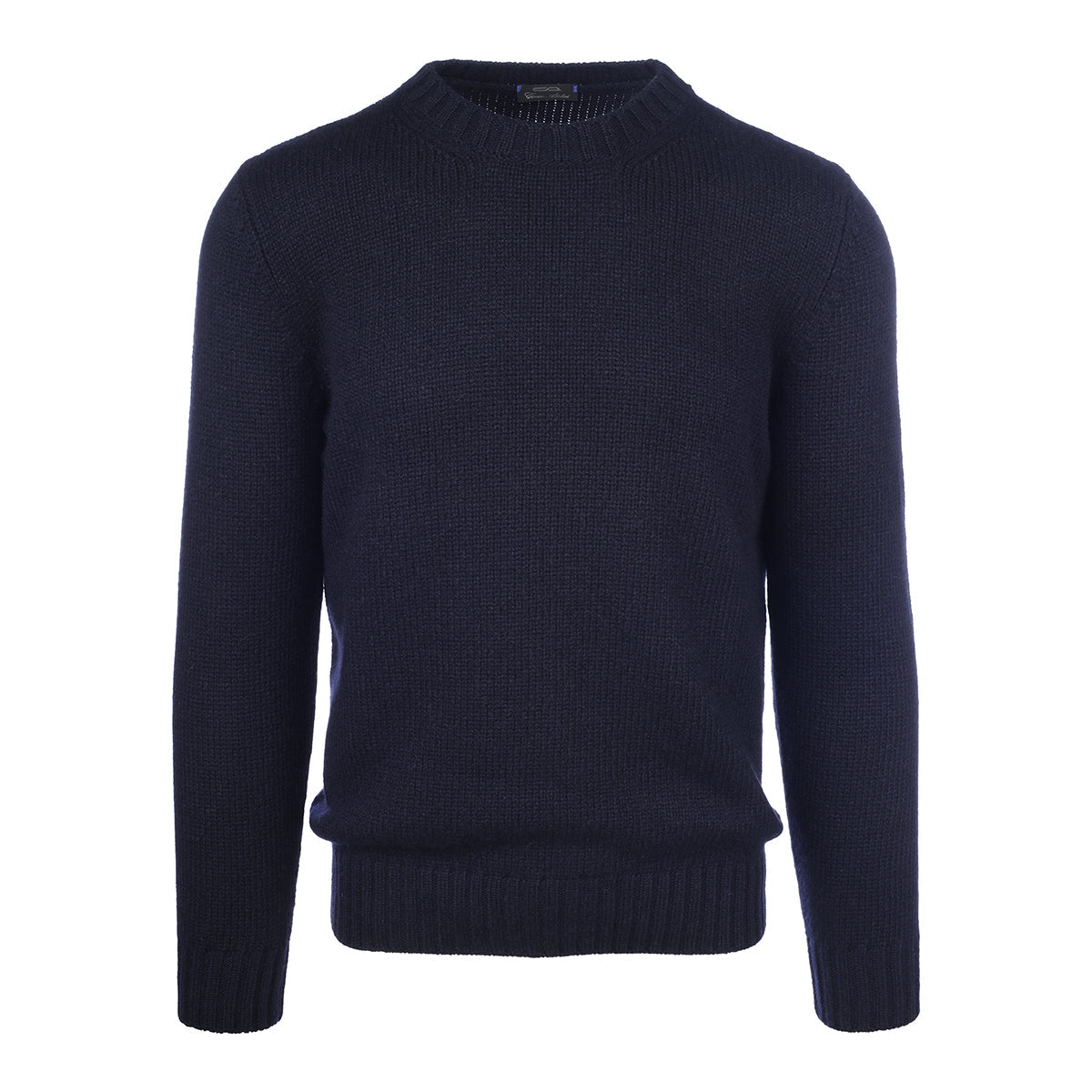 Blue crewneck sweater with flounces at the neck, at the cuffs and at the hem.