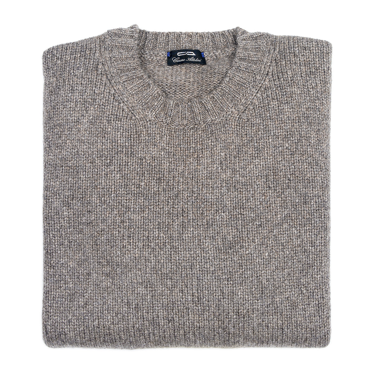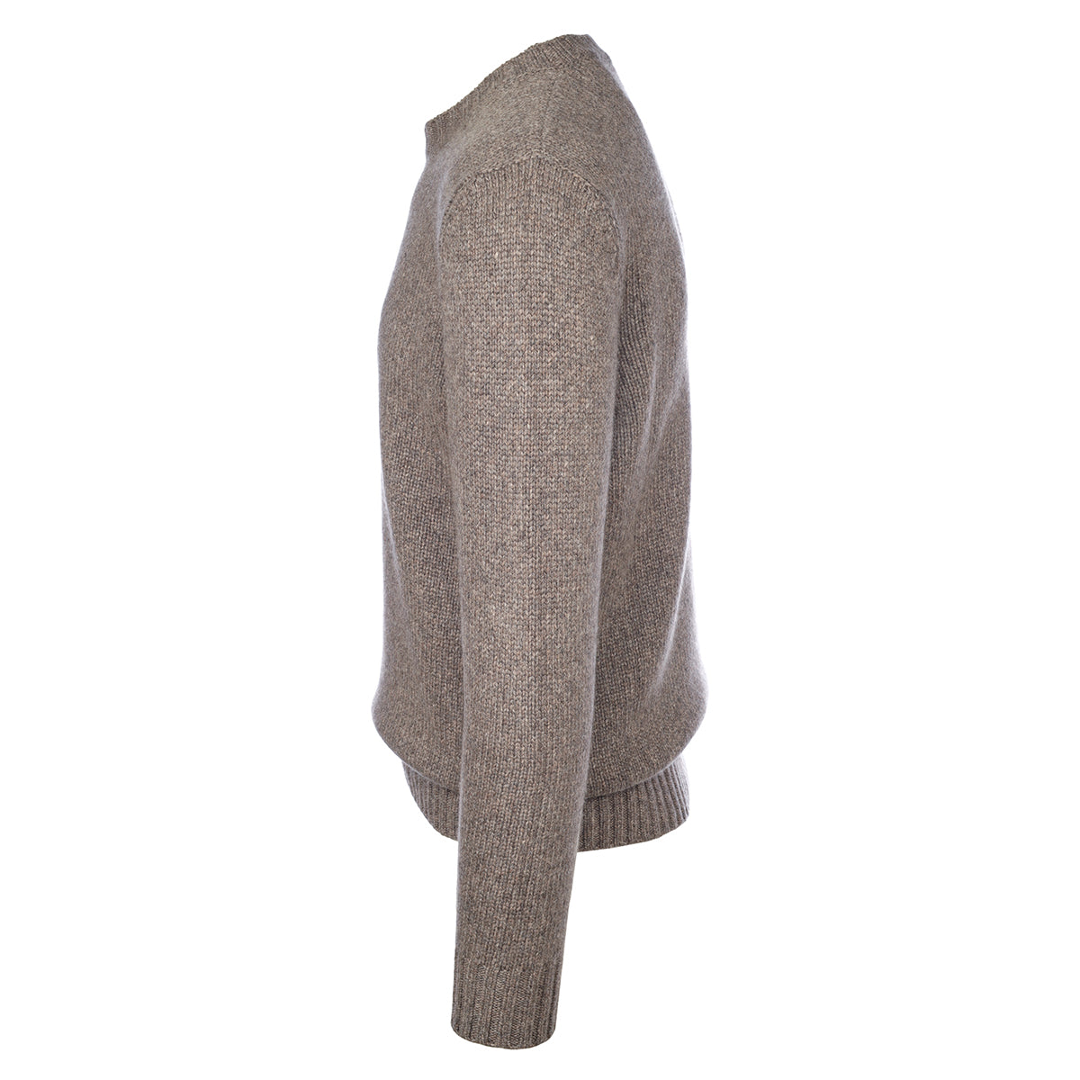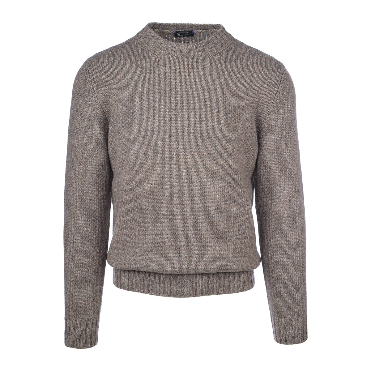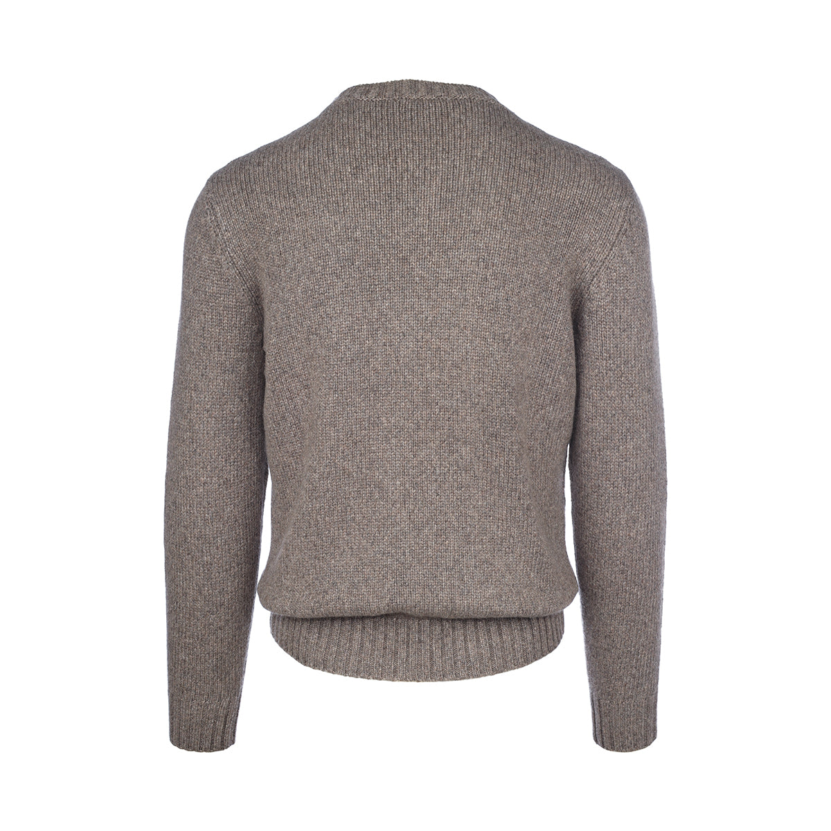 Melange taupe crewneck sweater with flounces at the neck, at the cuffs and at the hem.