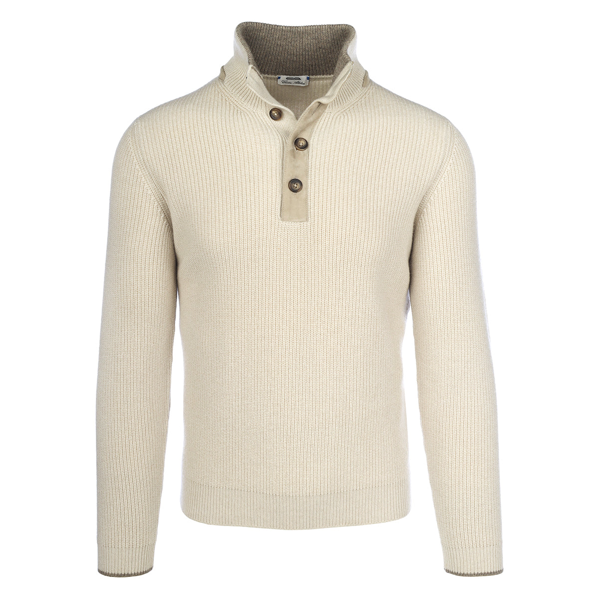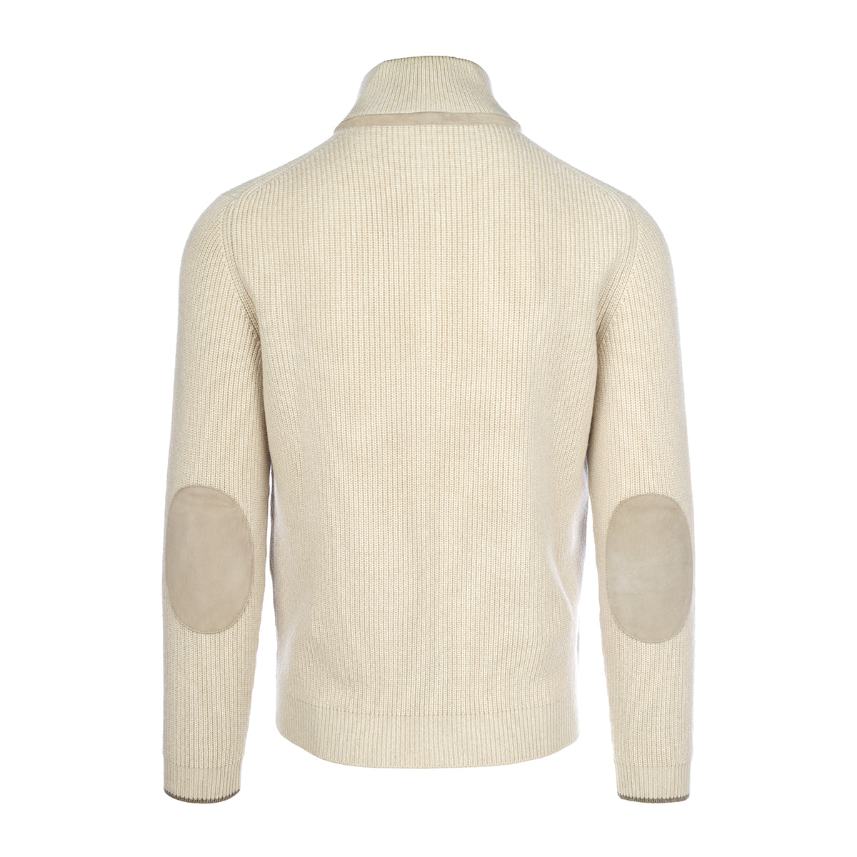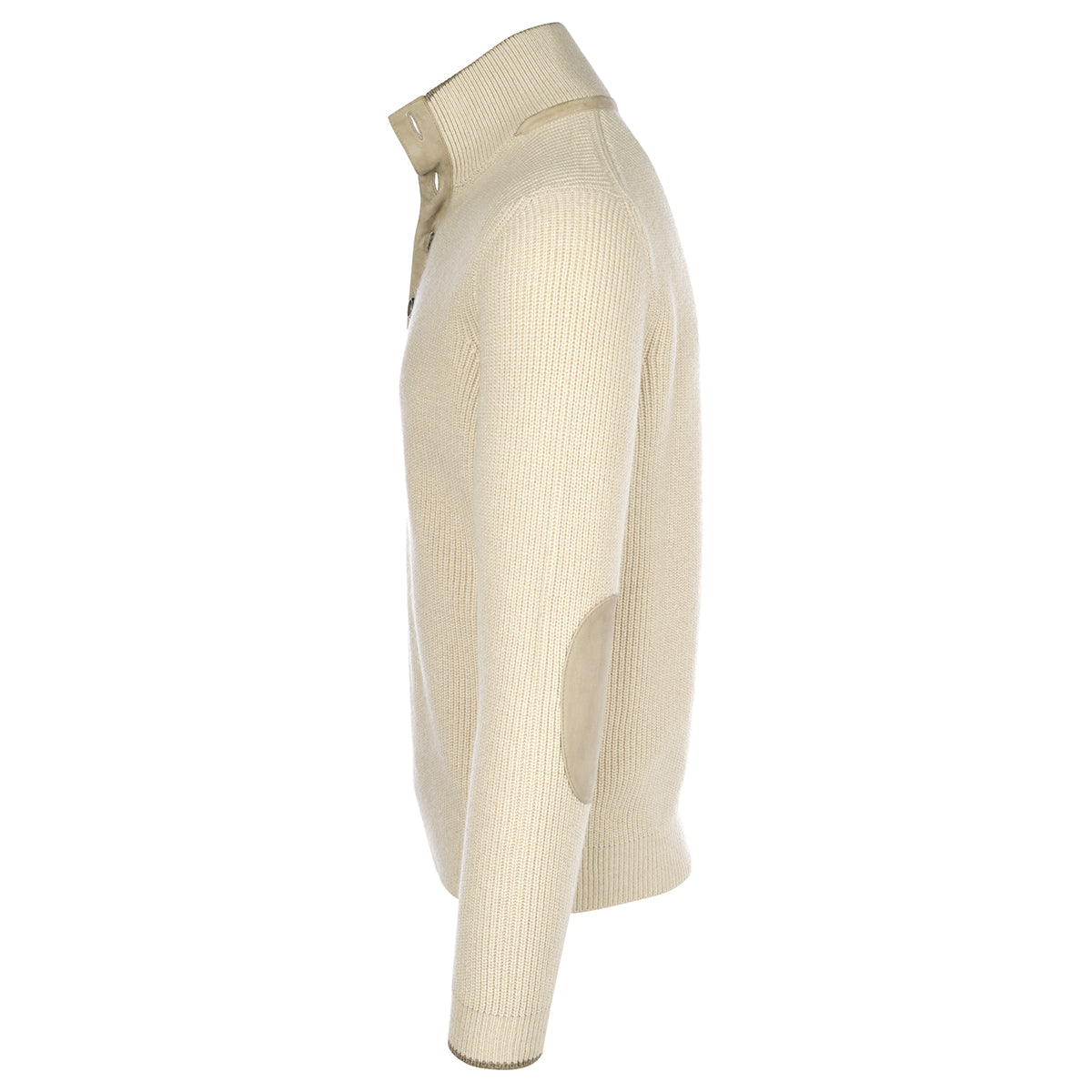 Point pearl mastic serafina with buttons in cashmere. Ribbed collar, cuffs and flounce, two elbow patches, with inserts in light gray suede at the undercollar and button covers. Made in our artisan workshop on the banks. The precious cashmere yarn makes it soft and comfortable.