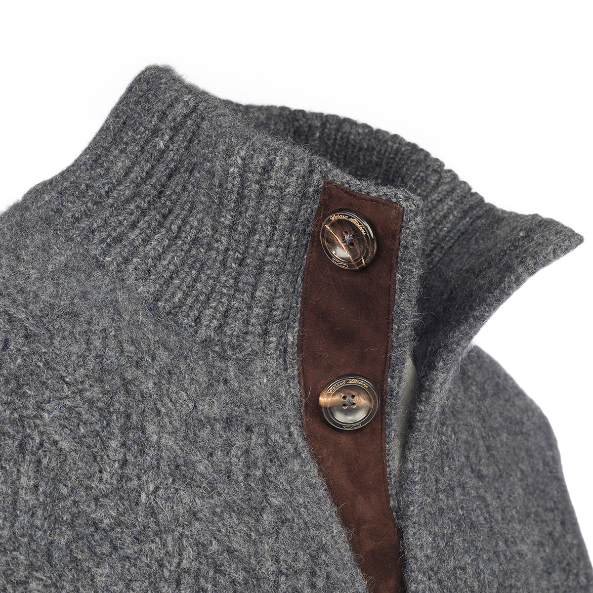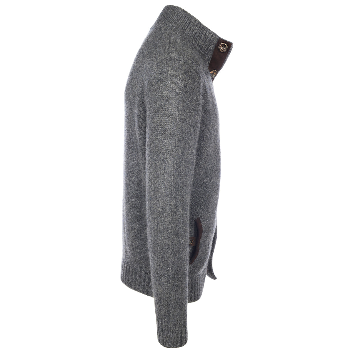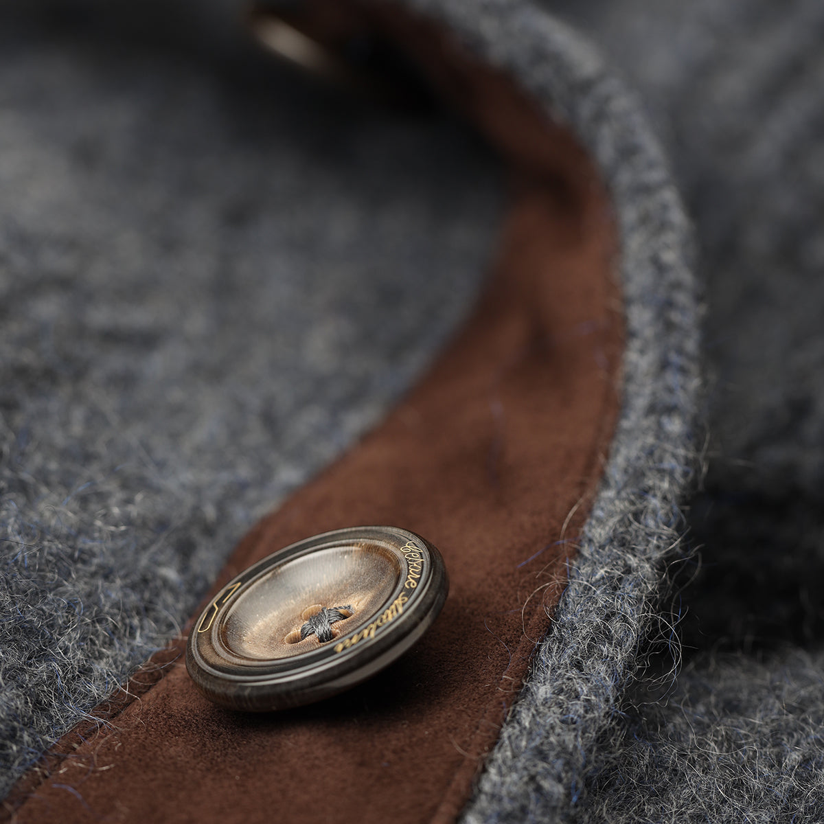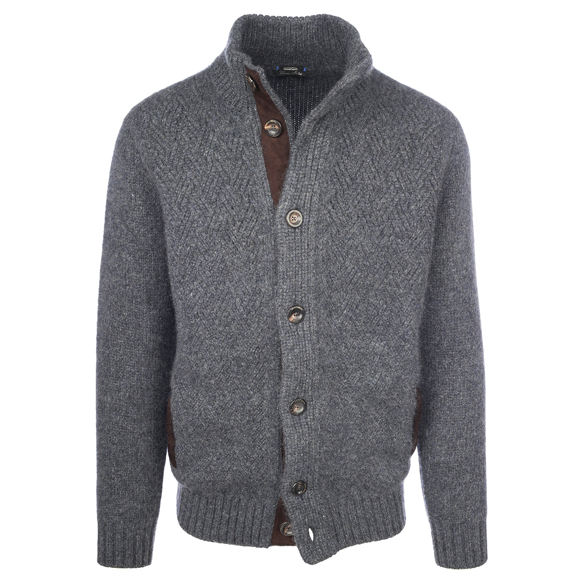 Gray cashmere bomber cardigan with buttons. Characterized by geometric patterns with two welt pockets and placket with brown suede inserts. Ribbed cuffs, neck and flounce. Made in our artisan workshop on the shores of Lake Trasimeno. The precious pure cashmere yarn makes it soft and comfortable.