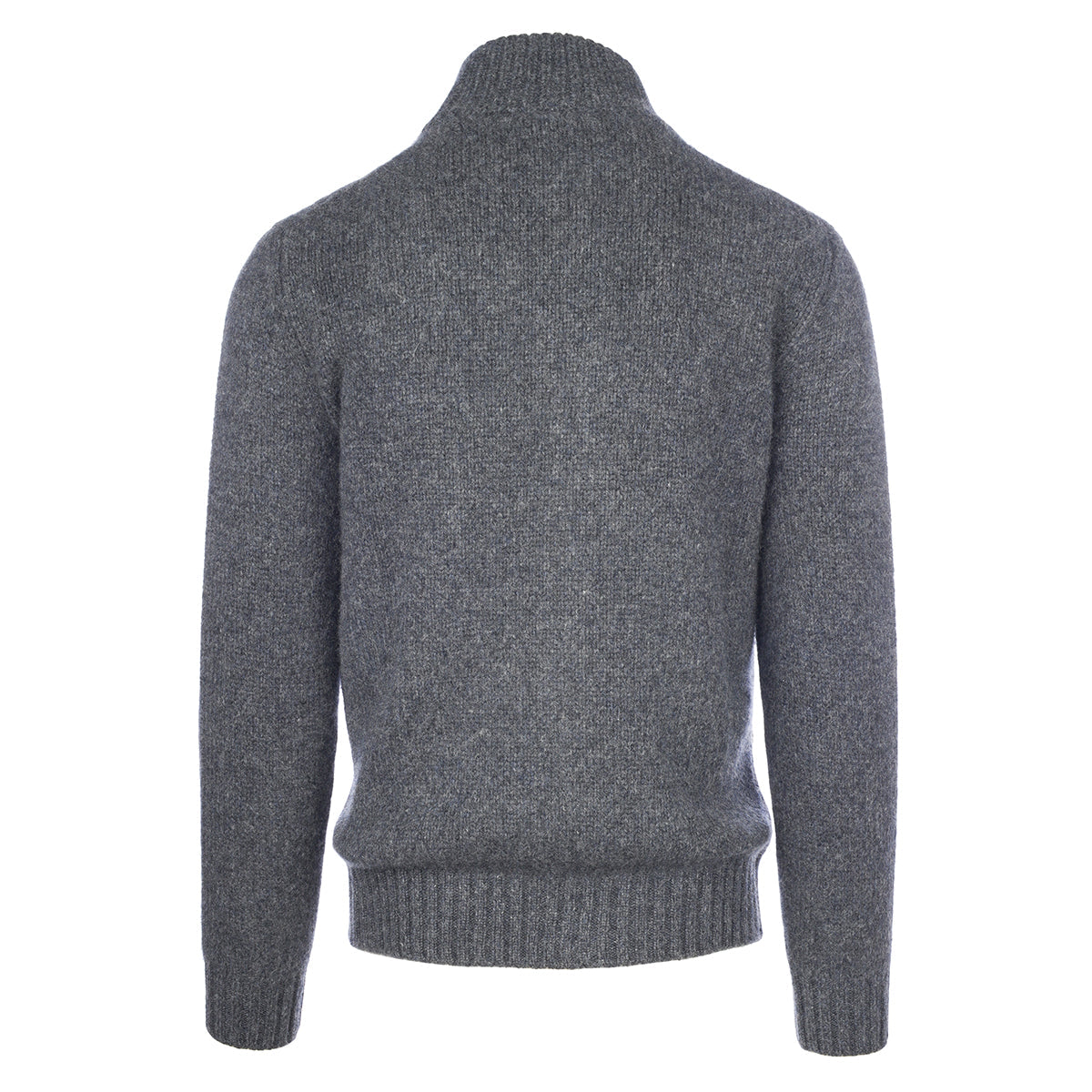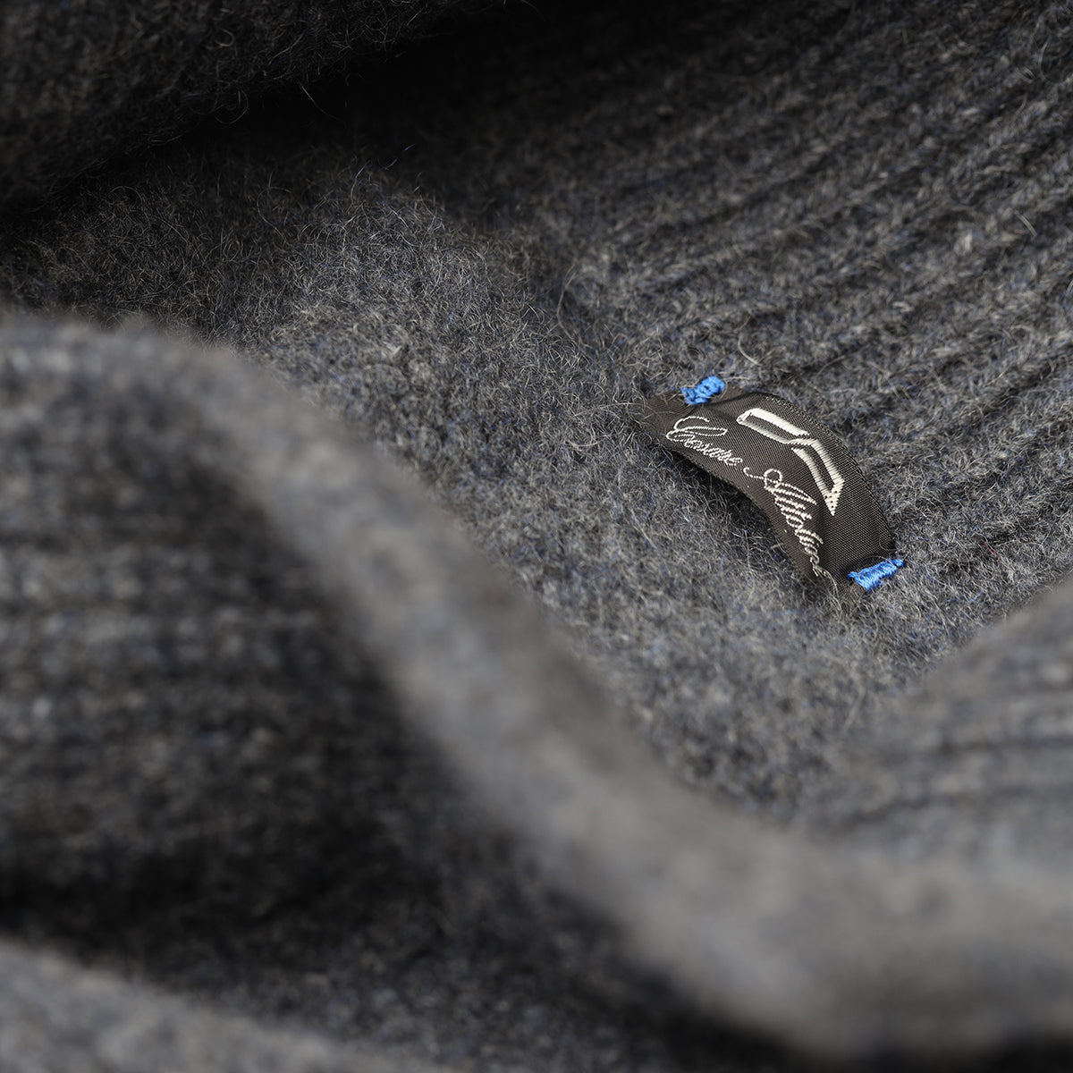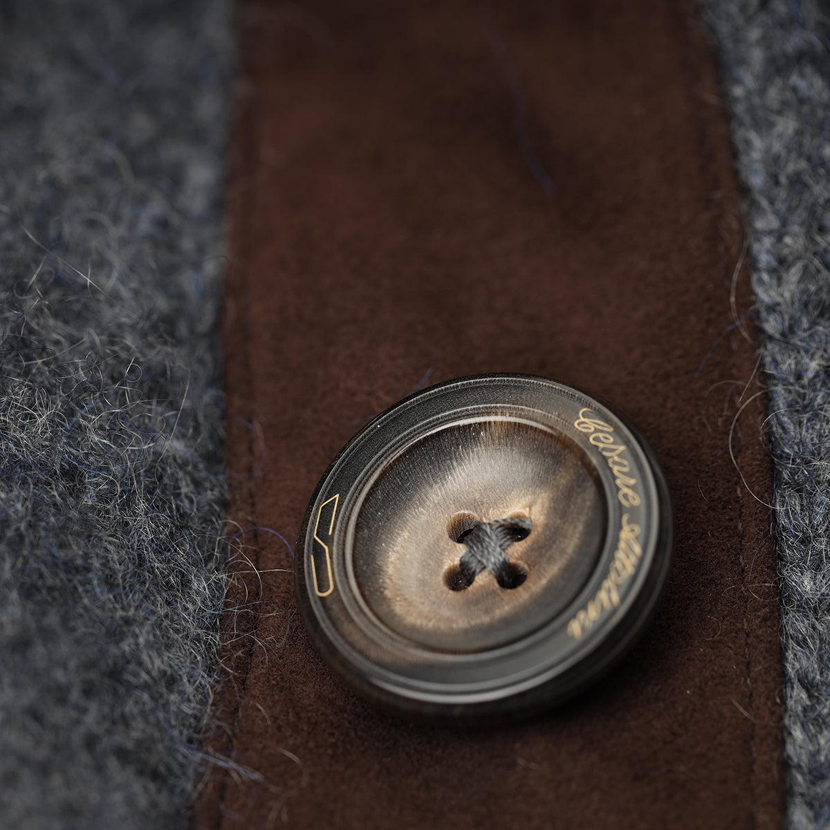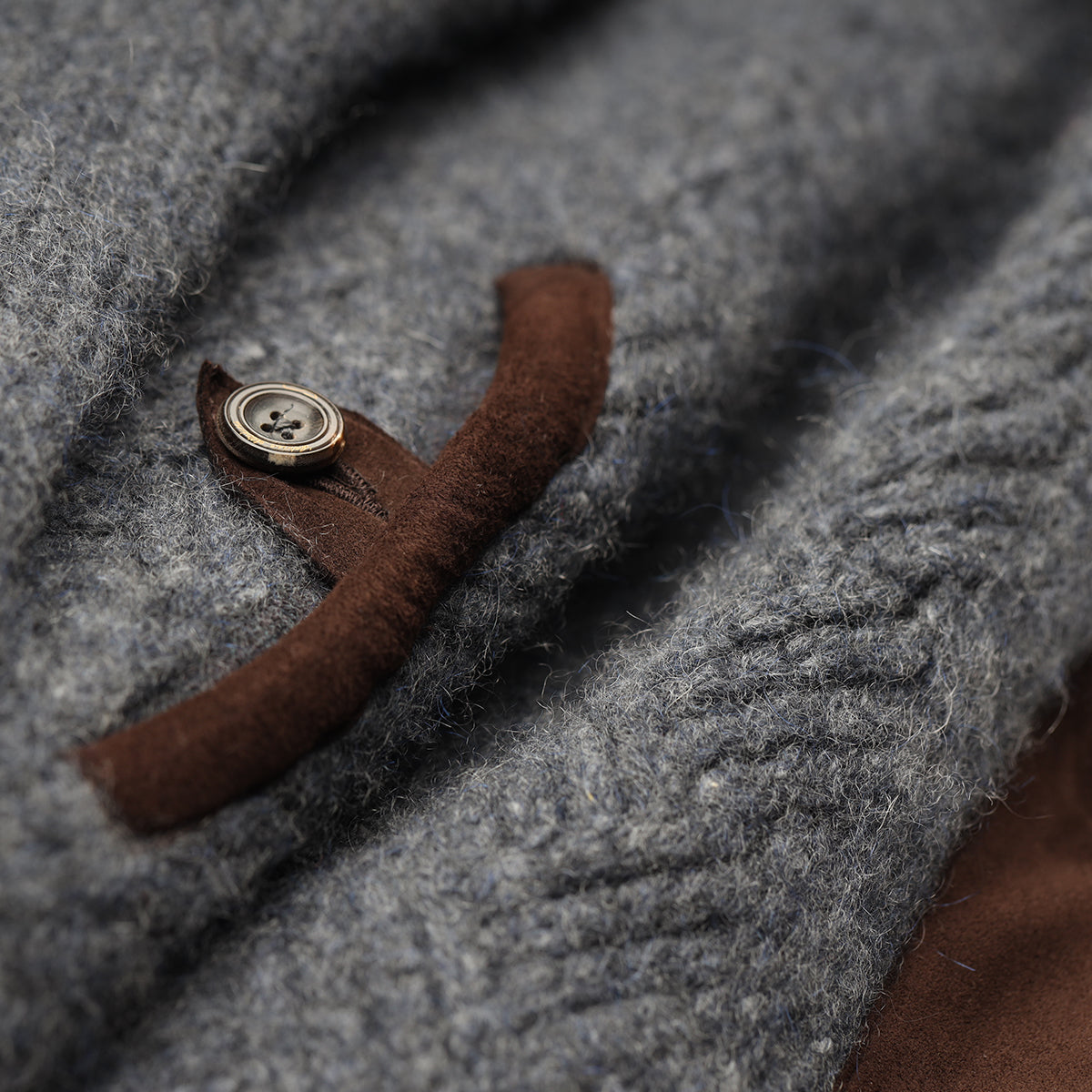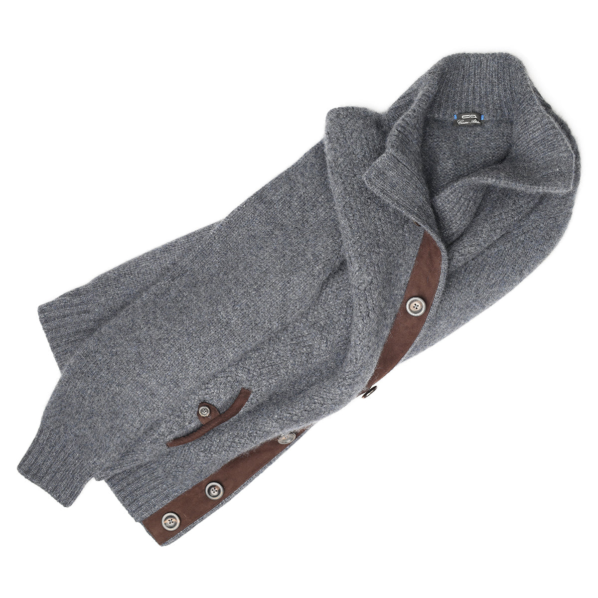 Gray cashmere bomber cardigan with buttons. Characterized by geometric patterns with two welt pockets and placket with brown suede inserts. Ribbed cuffs, neck and flounce. Made in our artisan workshop on the shores of Lake Trasimeno. The precious pure cashmere yarn makes it soft and comfortable.