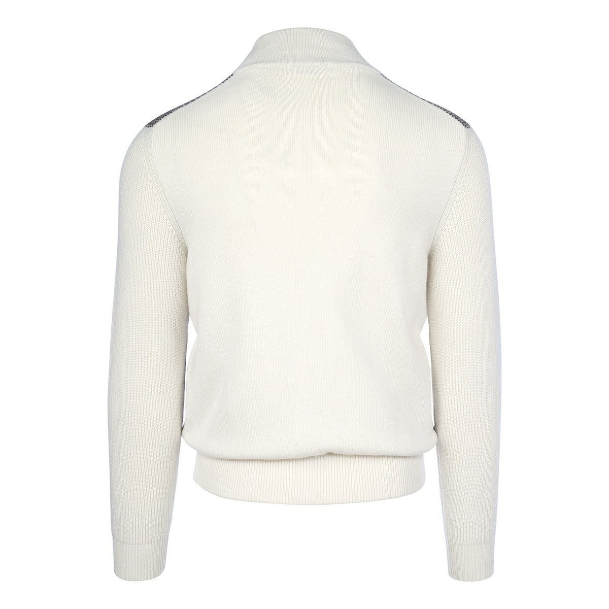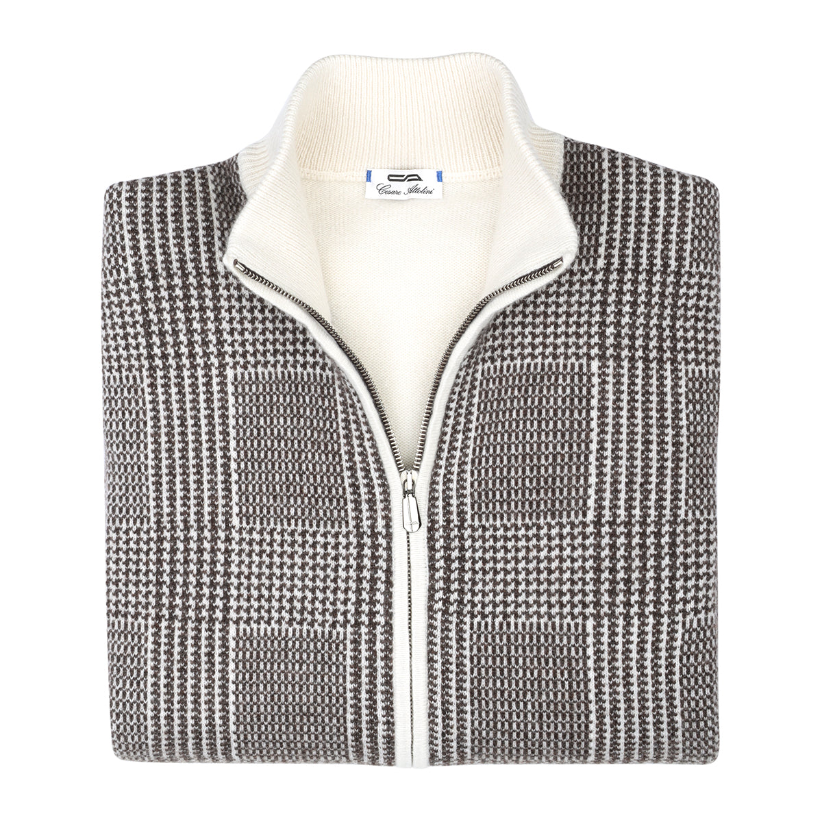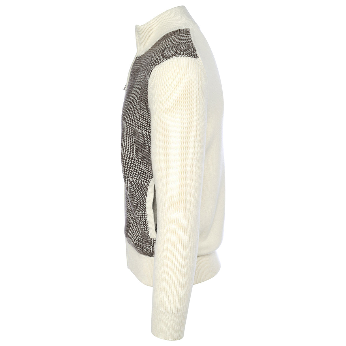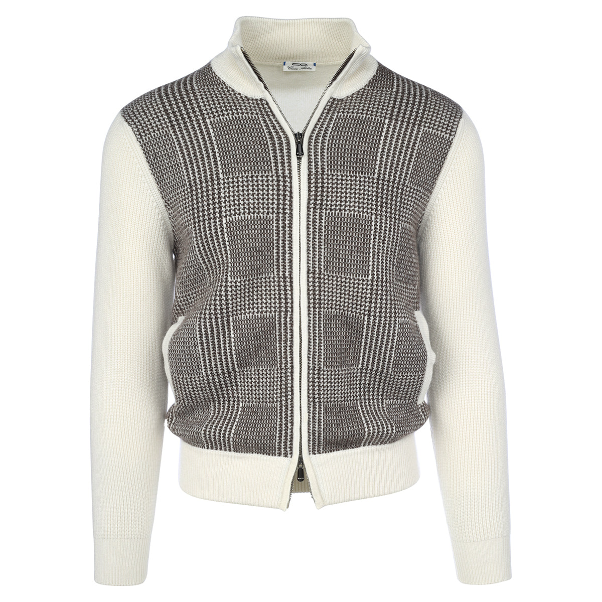 Bomber with double slider zip in cashmere with two pockets in white with brown checks. Ribbed collar, cuffs and flounce. Made in our artisan workshop on the shores of Lake Trasimeno. The precious pure cashmere yarn, makes it soft, comfortable and unique.