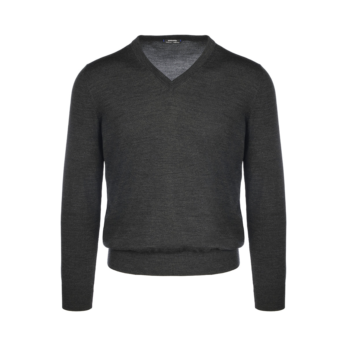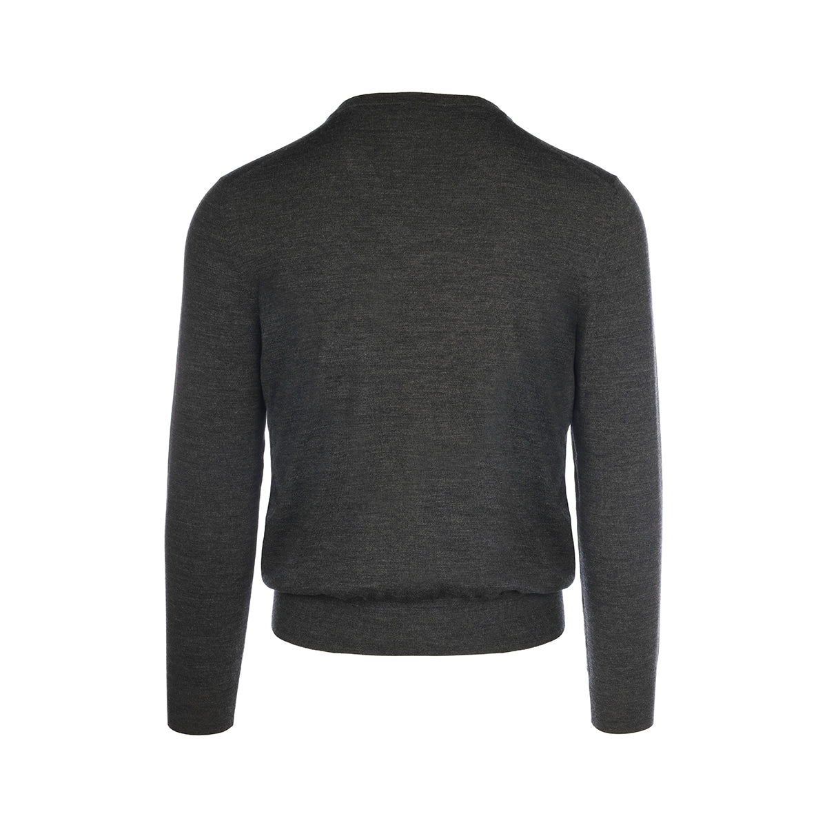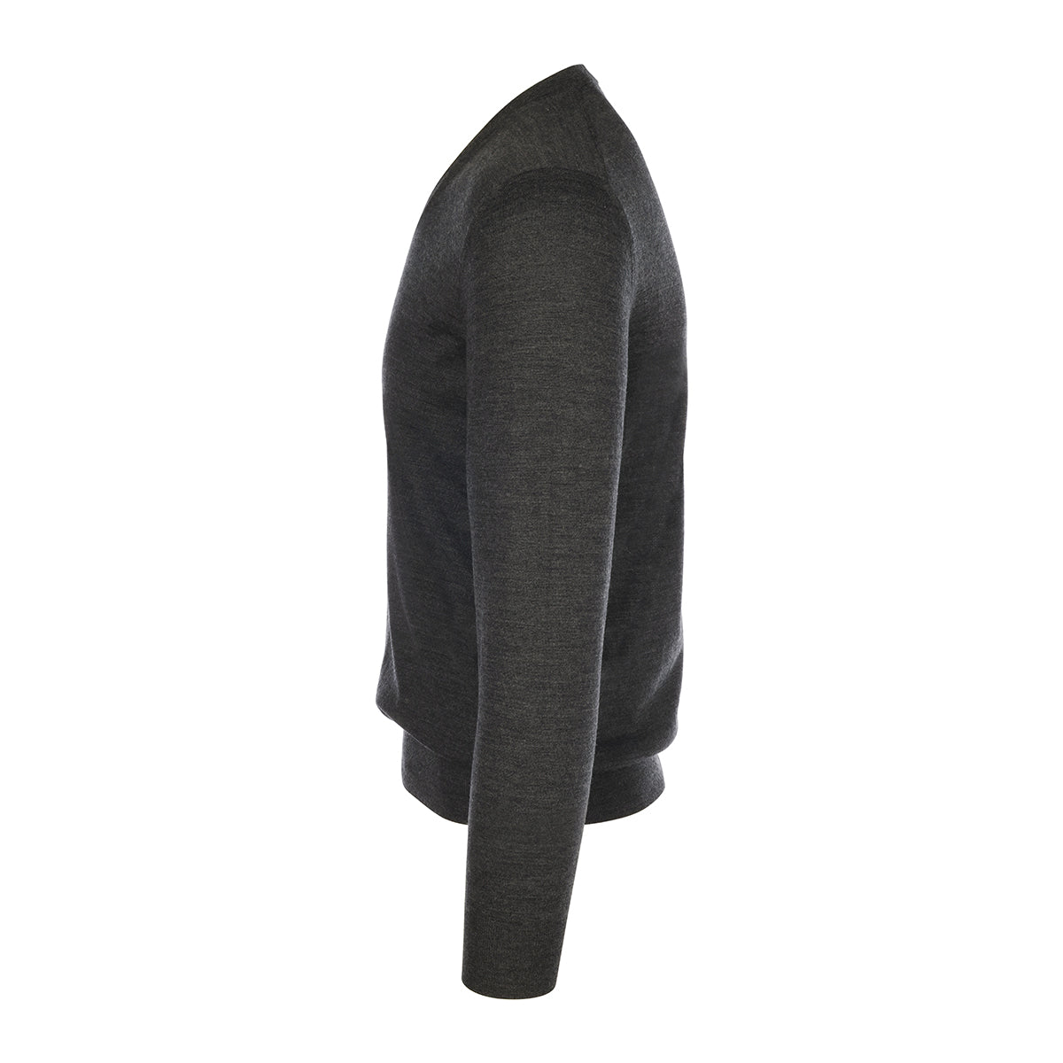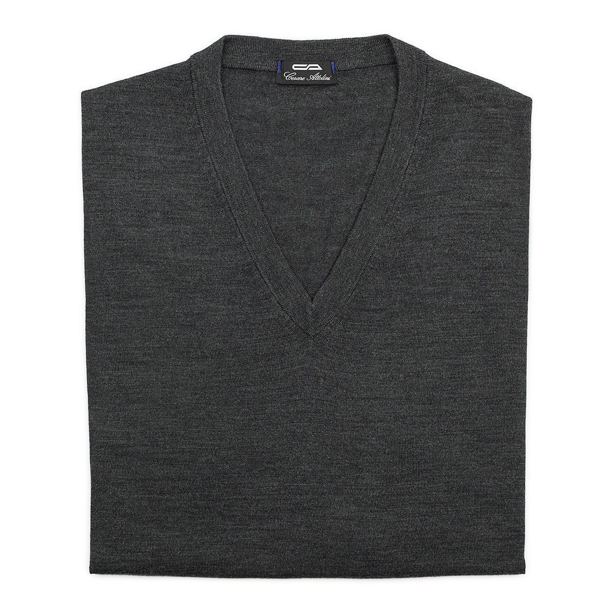 Anthracite gray V-neck sweater in 140'S wool. Ribbed cuffs, neck and flounce. Made in our artisan workshop on the shores of Lake Trasimeno. This model, an ongoing icon of our workshop, is perfect both as a classic under-jacket and for leisure